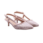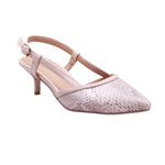 Zapato tipo slingback destalonado, confeccionado con corte y forro artificial en tono claro, con textura tipo reptil que aporta un acabado sofisticado y moderno. Su diseño estilizado incluye una punta fina que alarga visualmente la silueta del pie, mientras que la correa ajustable con hebilla metálica en el talón permite un ajuste seguro y cómodo.