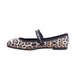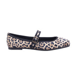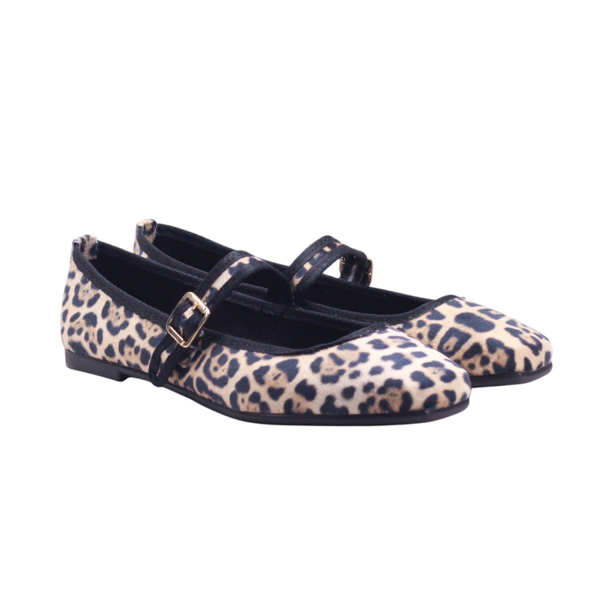 Calzado tipo balerina para dama con corte y forro artificial, disponible en color leopardo, ideal para quienes buscan un estilo atrevido y cómodo para el día a día. El diseño incluye puntera redonda, tira al empeine con ajuste de hebilla dorada, y acabado textil con estampado animal print en tonos beige, café y negro, que aporta un toque moderno y llamativo. La plantilla acolchada mejora el confort en cada paso, mientras que la suela plana en tono negro ofrece buena tracción y estabilidad. Perfecta como bailarina casual con diseño de moda, pensada para combinar con jeans, pantalones ajustados o vestidos monocromáticos que resalten el estampado.