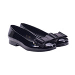 Calzado tipo flat en color negro, elaborado con corte y forro artificial, ideal para quienes buscan un estilo femenino y elegante. Su diseño cerrado presenta una punta redonda que favorece la comodidad, acompañado de un moño grande decorativo sobre la parte frontal que aporta un toque clásico y encantador.