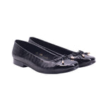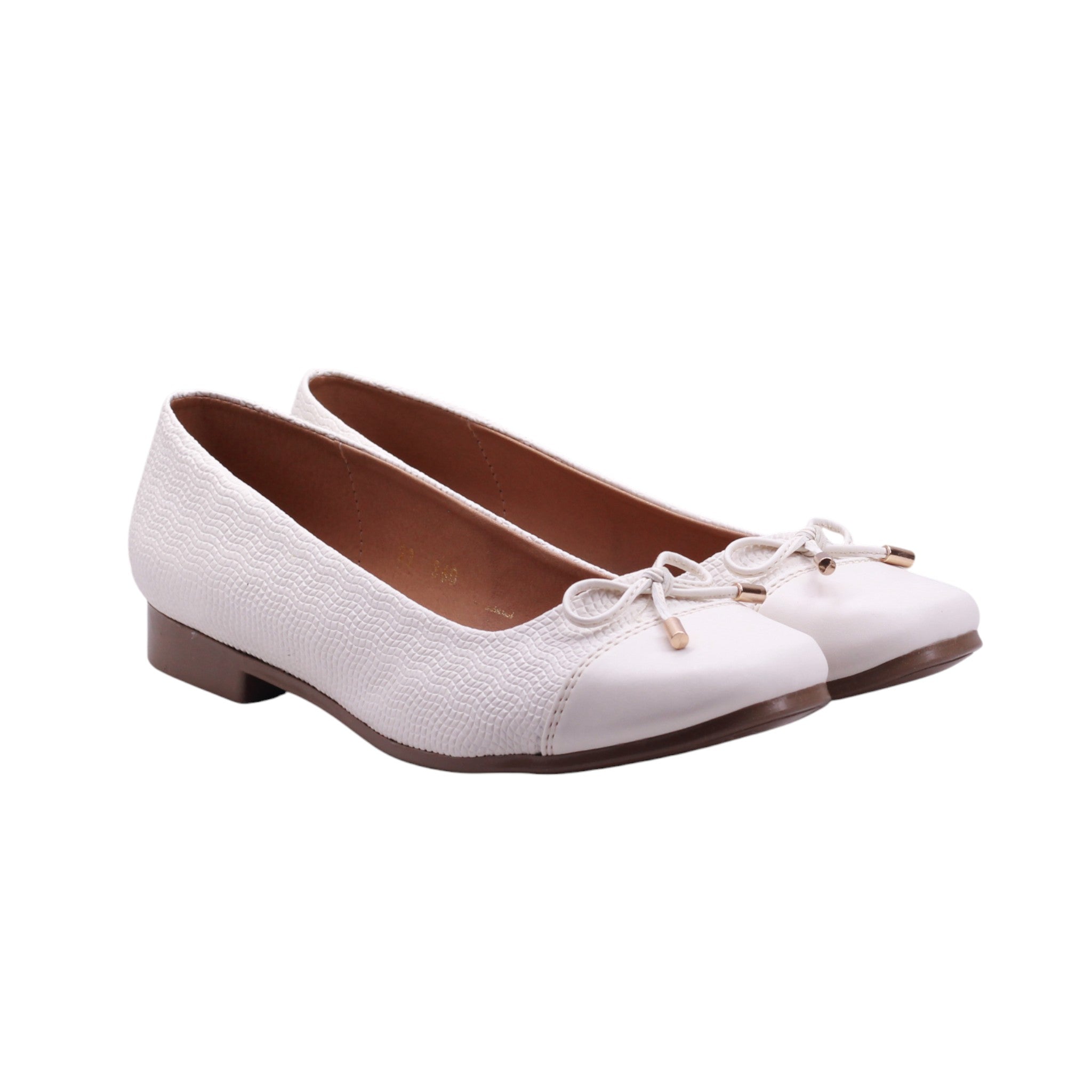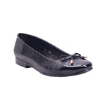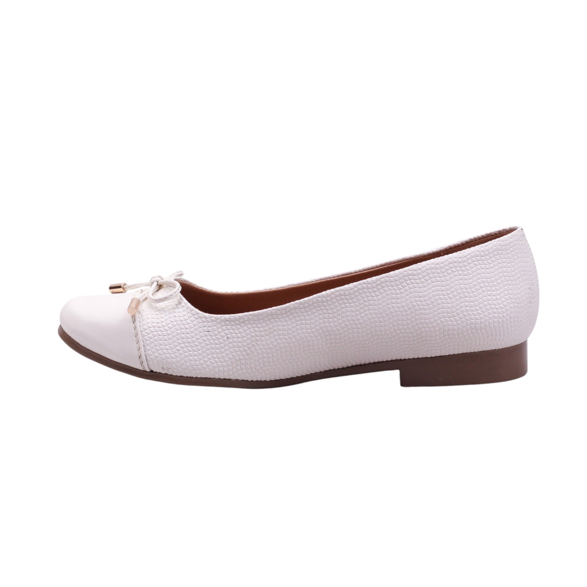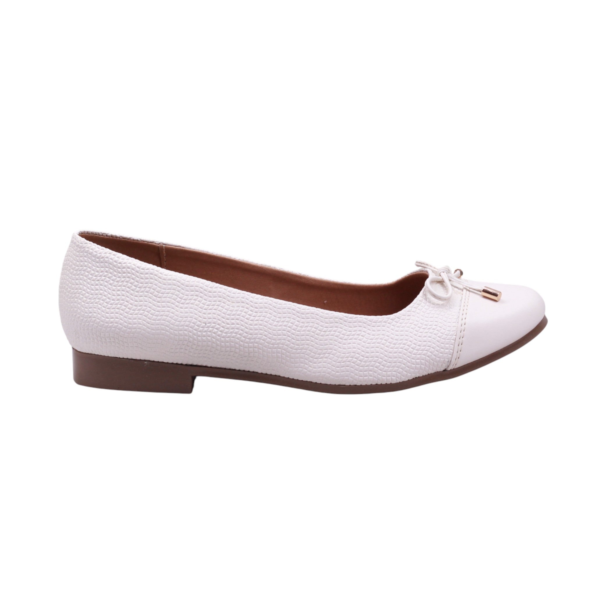 Flat disponible en colores late y negro, elaborado con corte y forro artificial. Su diseño cerrado presenta una punta redonda que favorece la comodidad, acompañado de un moño delgado decorativo sobre la parte frontal con terminaciones metálicas que aportan un detalle sutil y elegante.