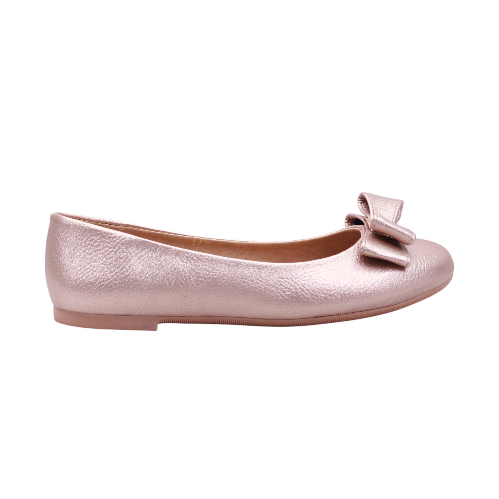 Bailarina metálica con moño grande y tacón bajo, corte elegante