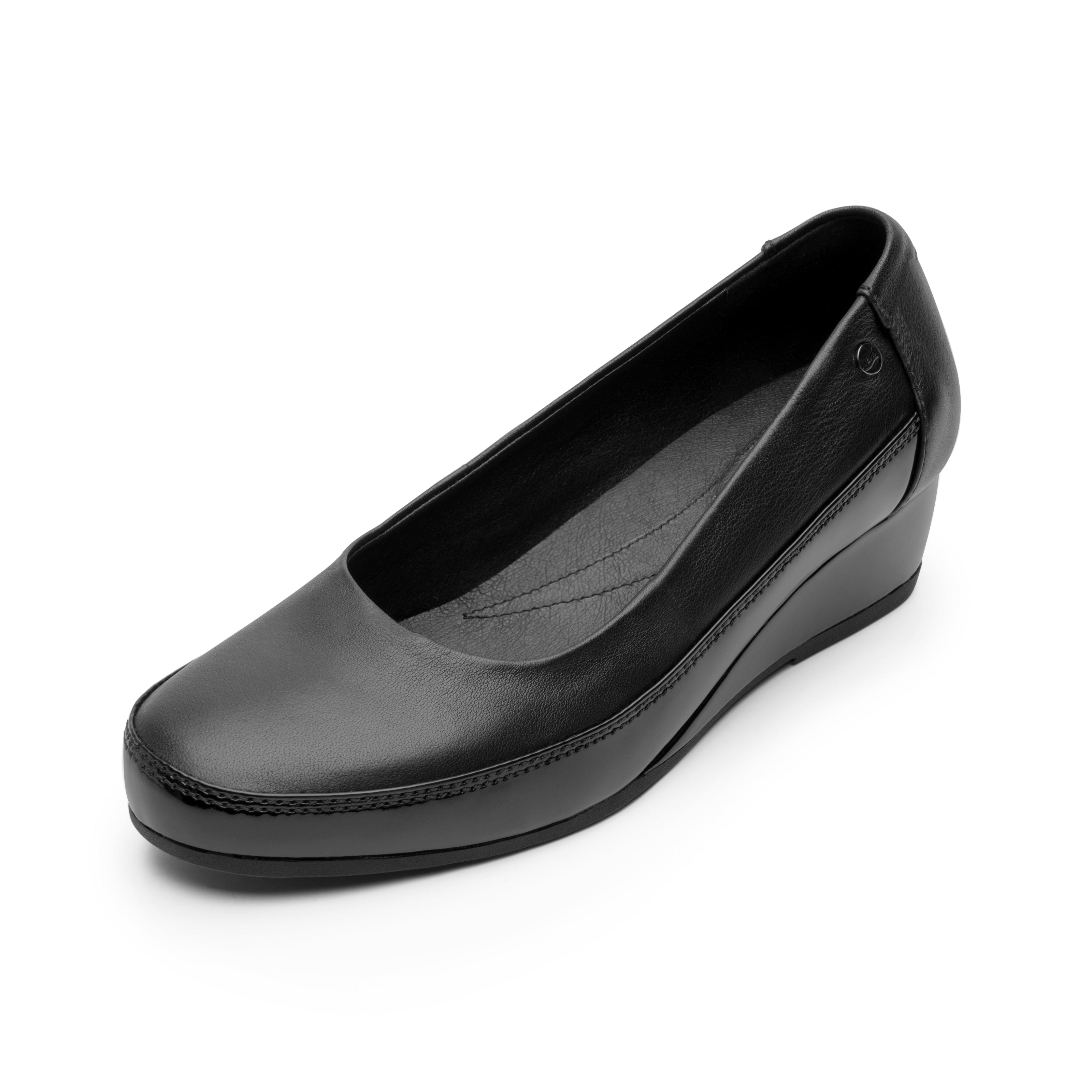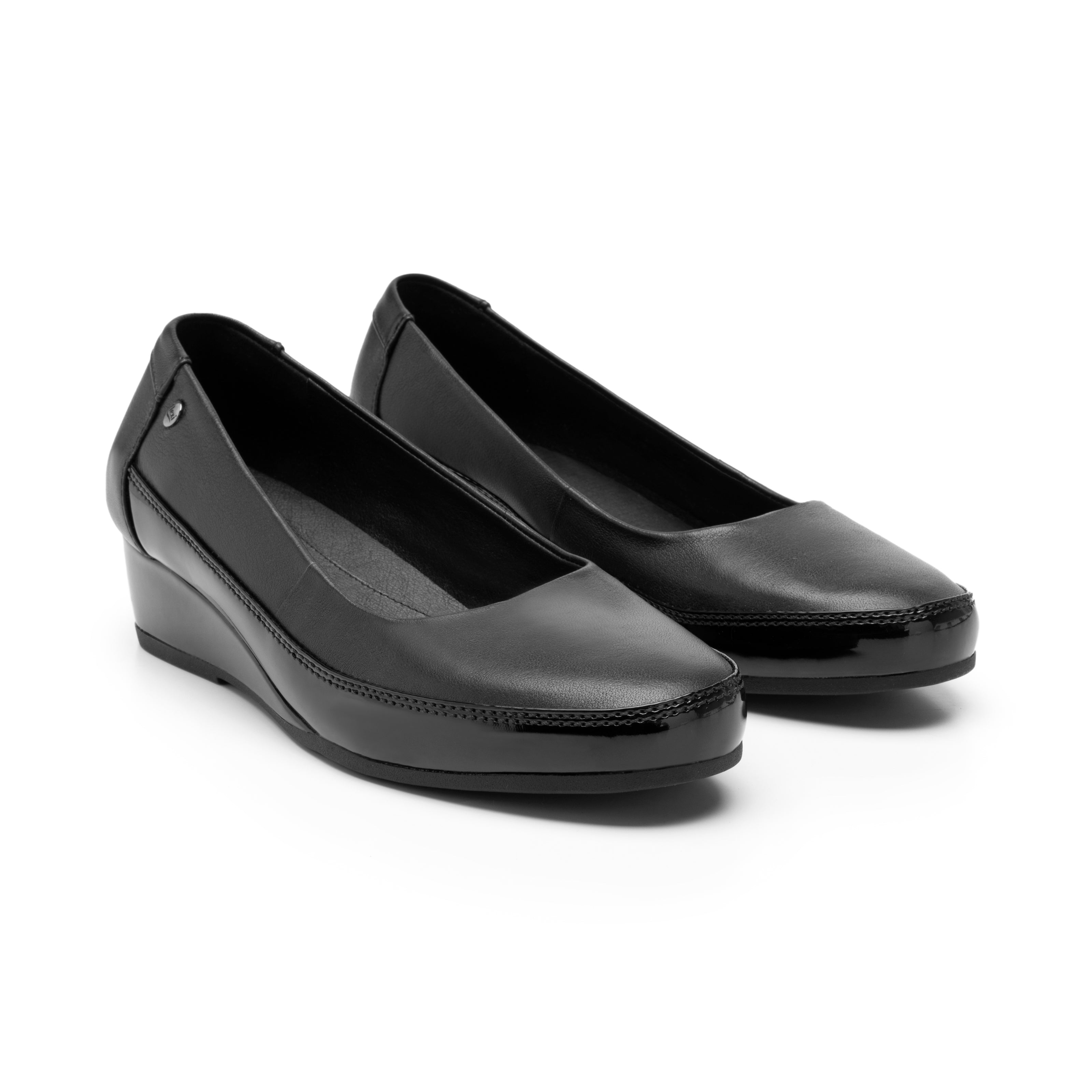Calzado para dama con terminado en piel lisa y cortes en charol, plantilla de confort