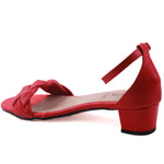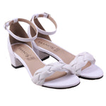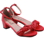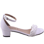 Zapatilla para dama con tacón cuadrado bajo y tira trenzada al frente.