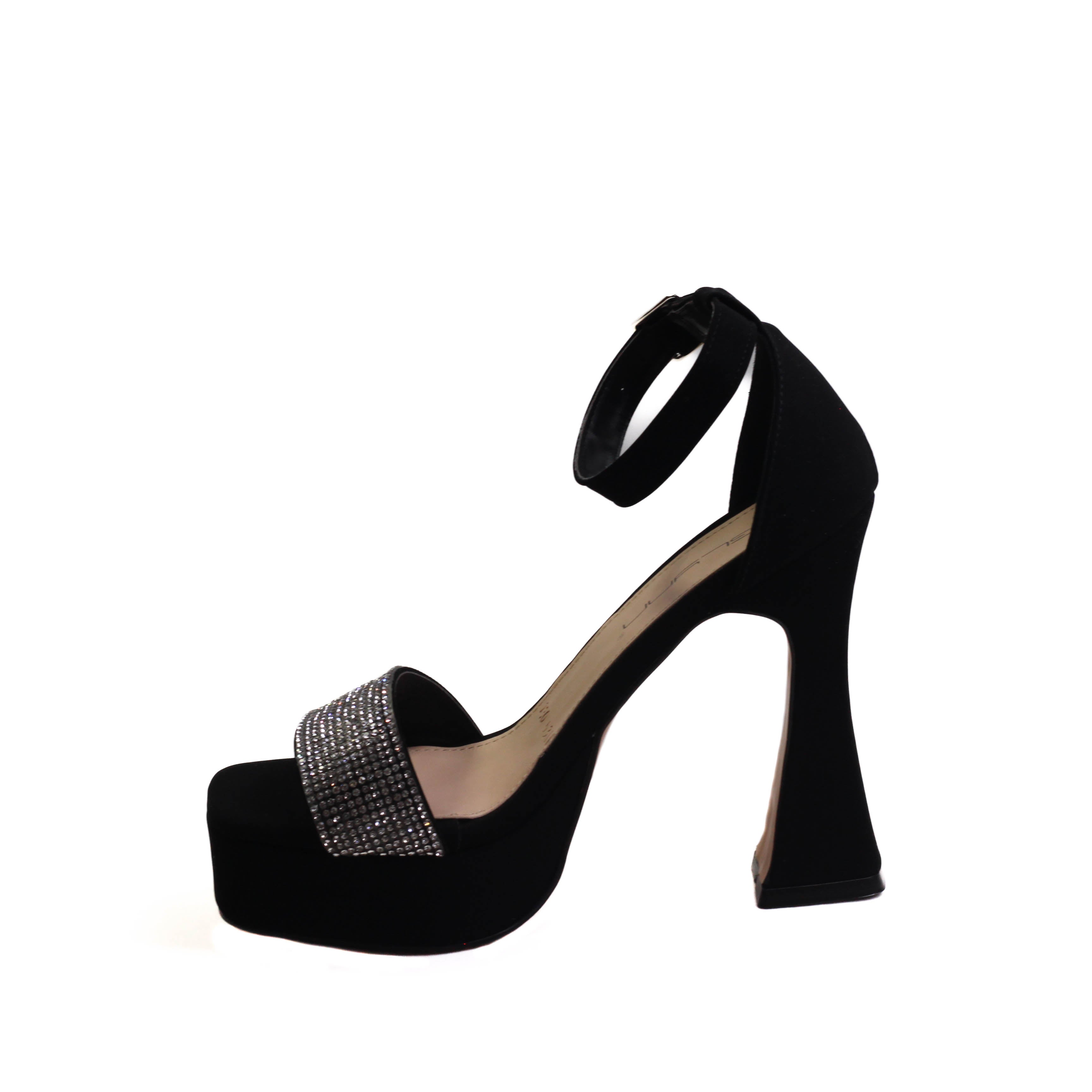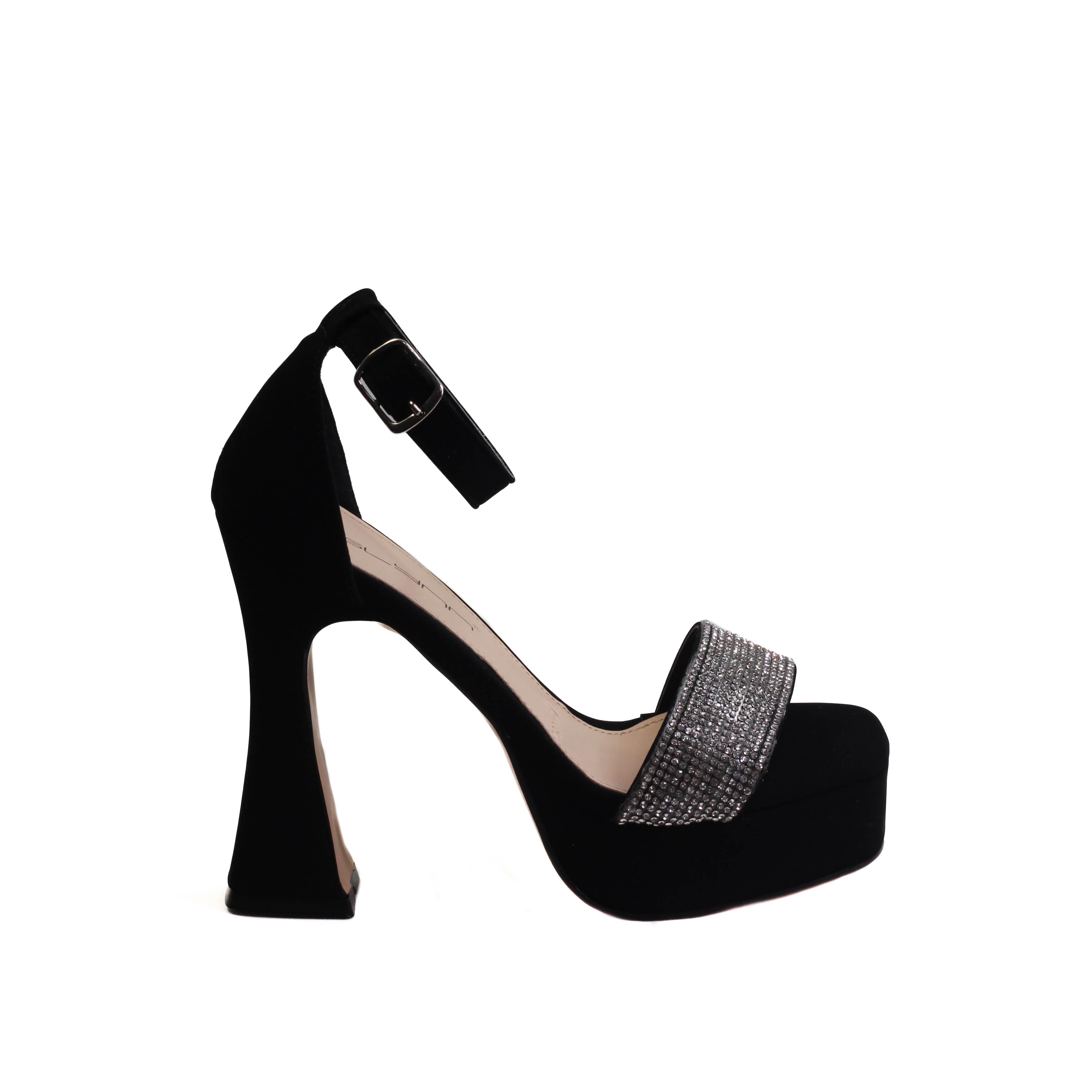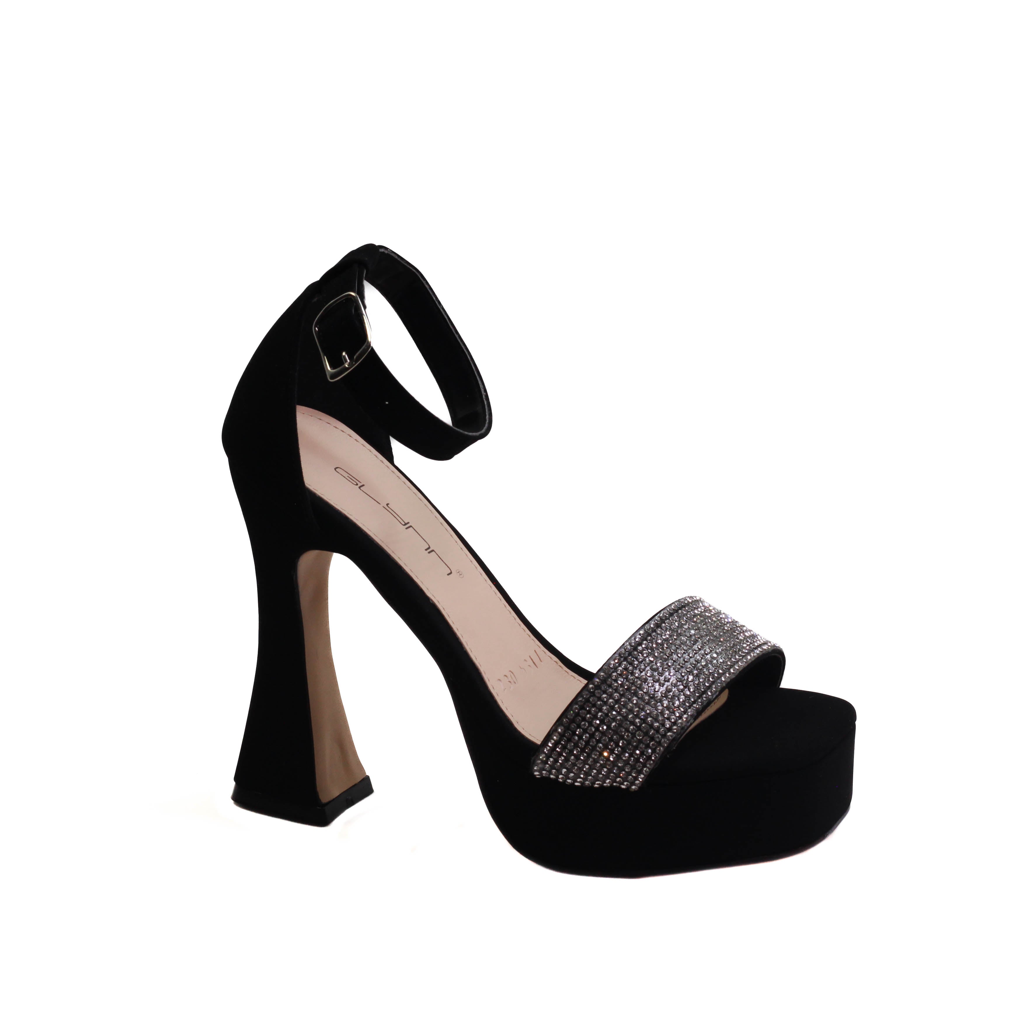 Zapatilla para dama marca Glynn en colo negro. Modelo con plataforma alta y tacón cuadrado grueso y alto para dar el equilibrio deseado más la comodidad que otorga, el tacón y plataforma cuentan con un terminado en tono mate mientras que y la tira está cubierta con pedrería, lo cual hace este modelo lucidor y listo para toda ocasión.