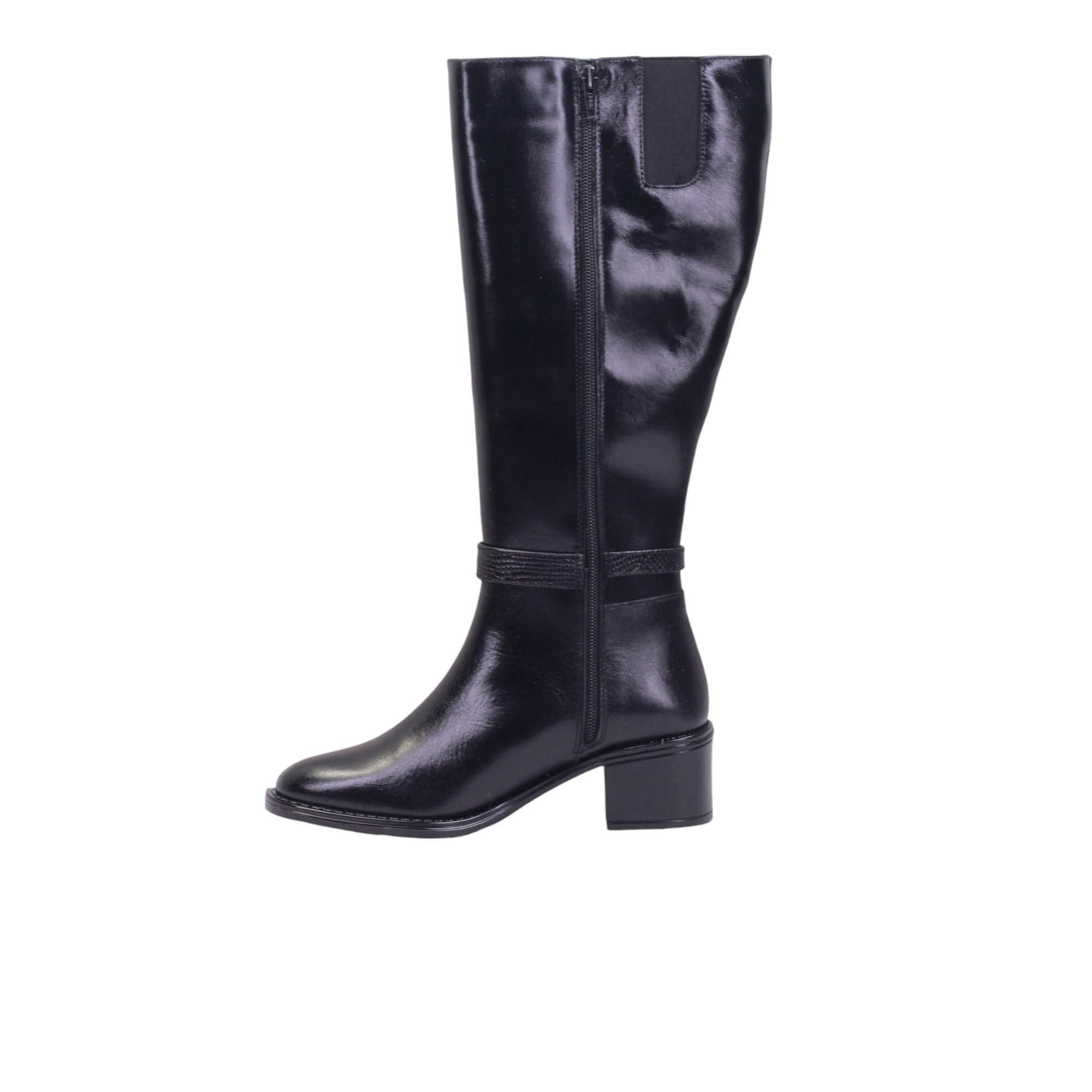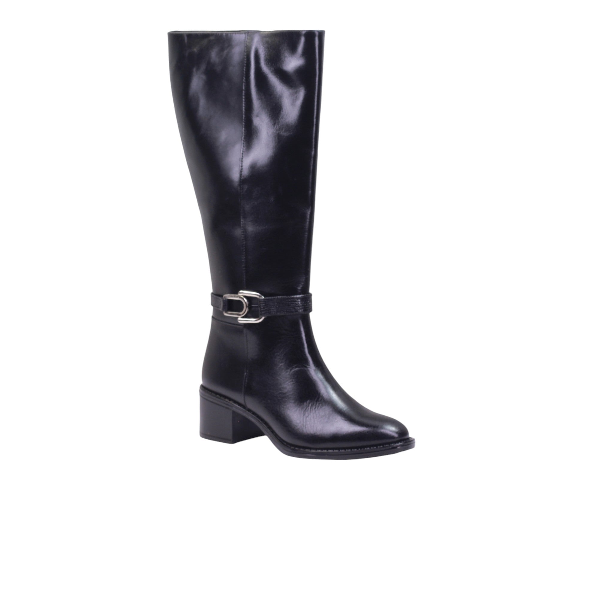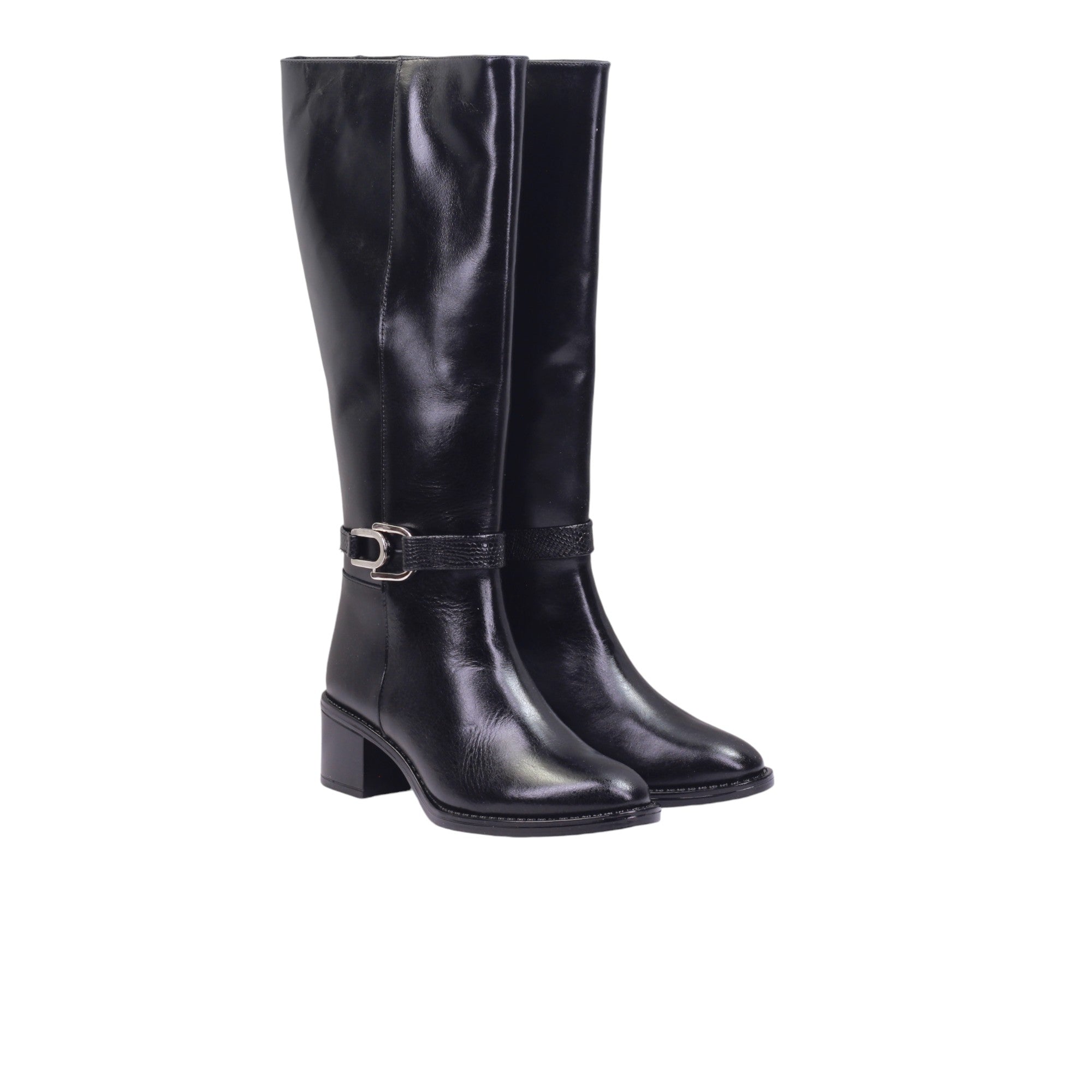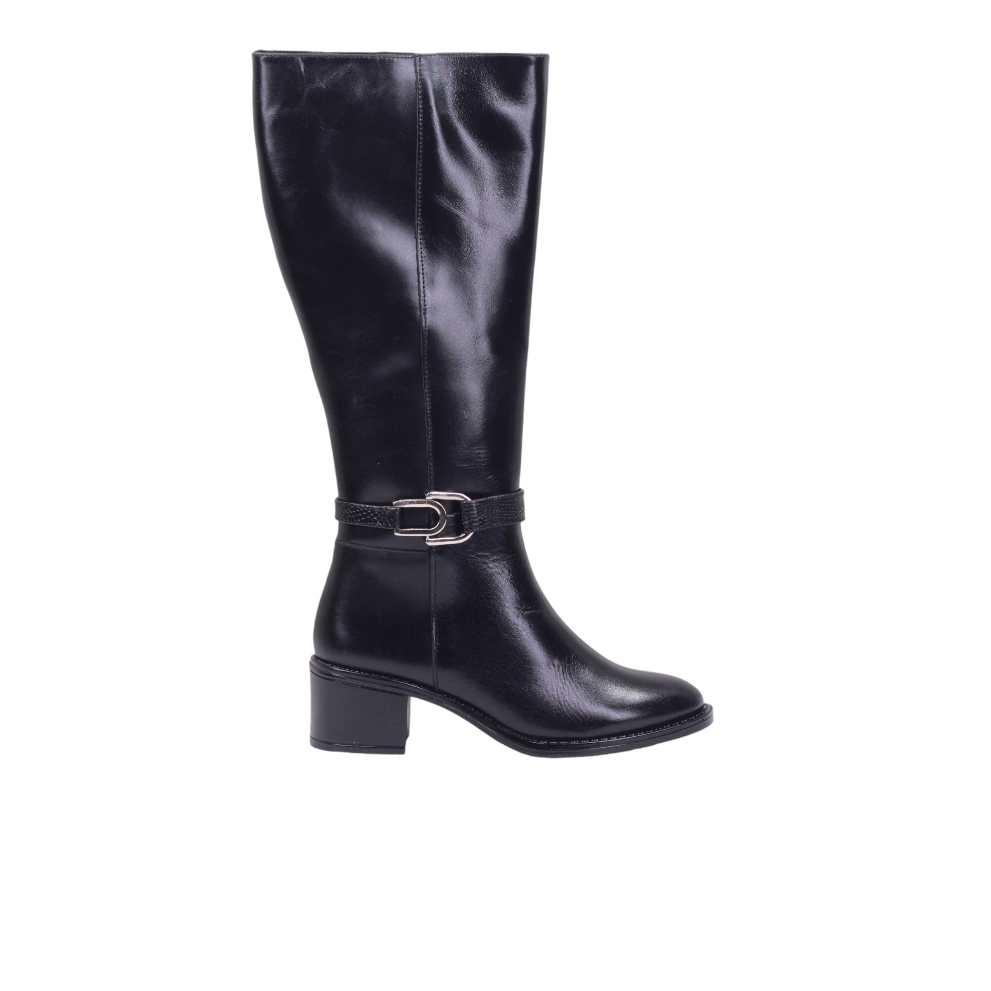 Presentamos las botas de tubo largo para dama en los elegante color negro. Este modelo de tacón de 5.00 cm de altura y 35.00 cm de largo está diseñado con adorno metálico para lucir elegante y cómoda. Además, cuenta con cierre lateral y elástico para un mejor ajuste. Ideal para combinar con cualquier atuendo.