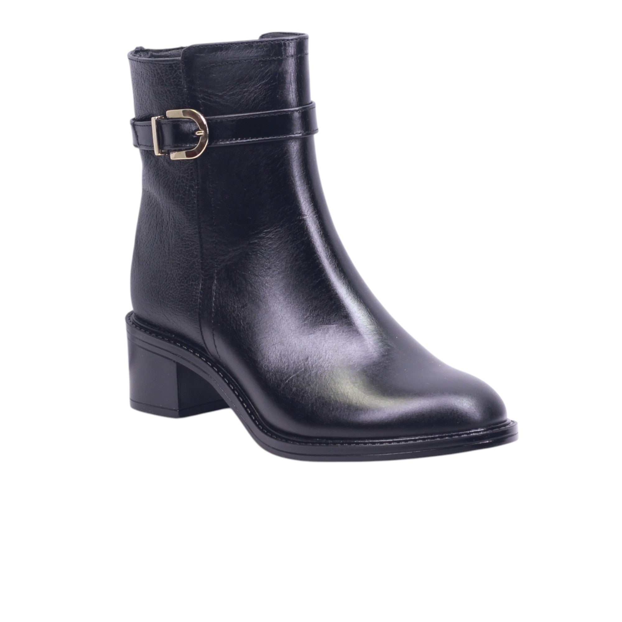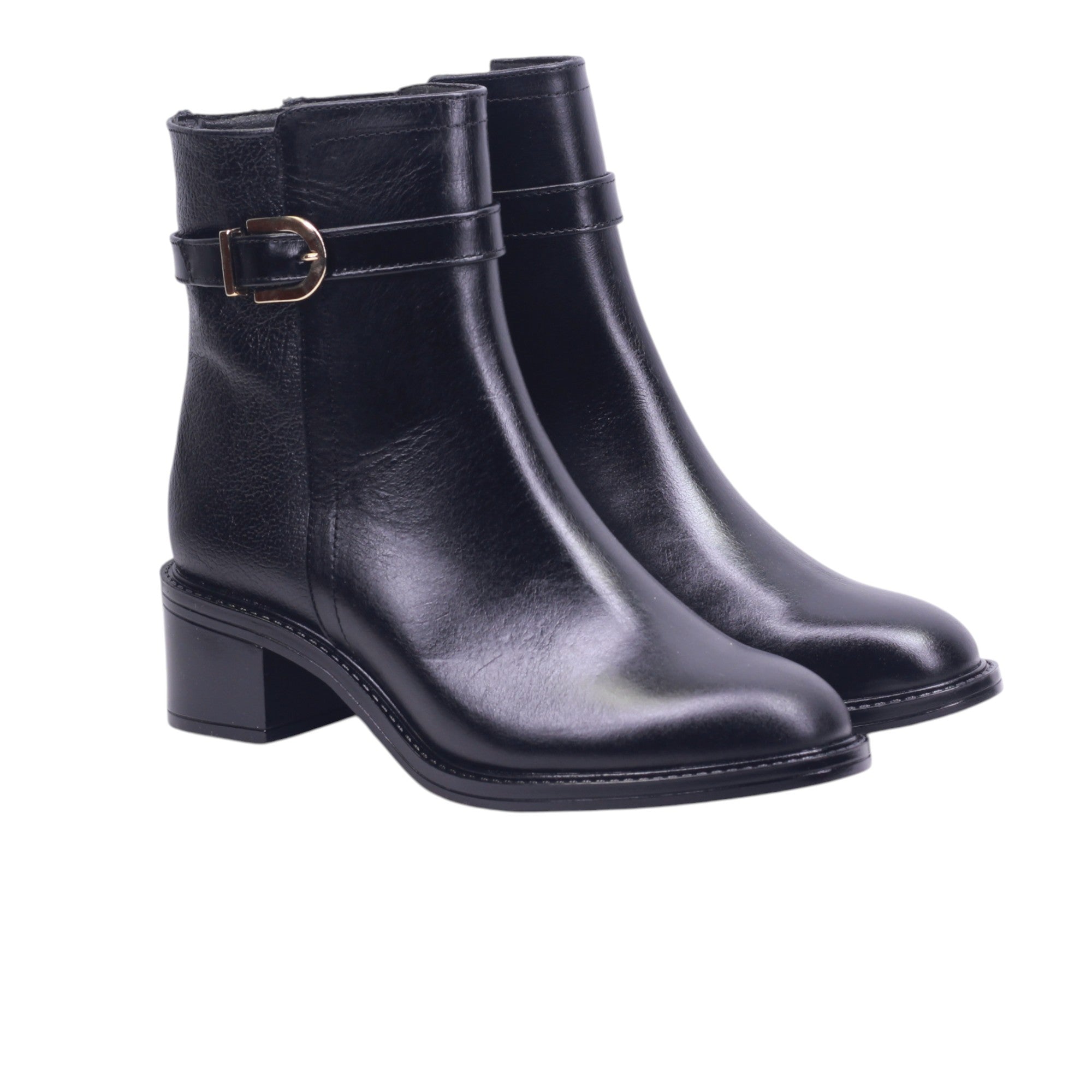El cierre lateral permite un calce práctico y discreto, mientras que la hebilla metálica decorativa en el costado del tubo añade un toque moderno sin saturar el diseño. La punta redondeada suaviza el perfil y mejora la comodidad al caminar.