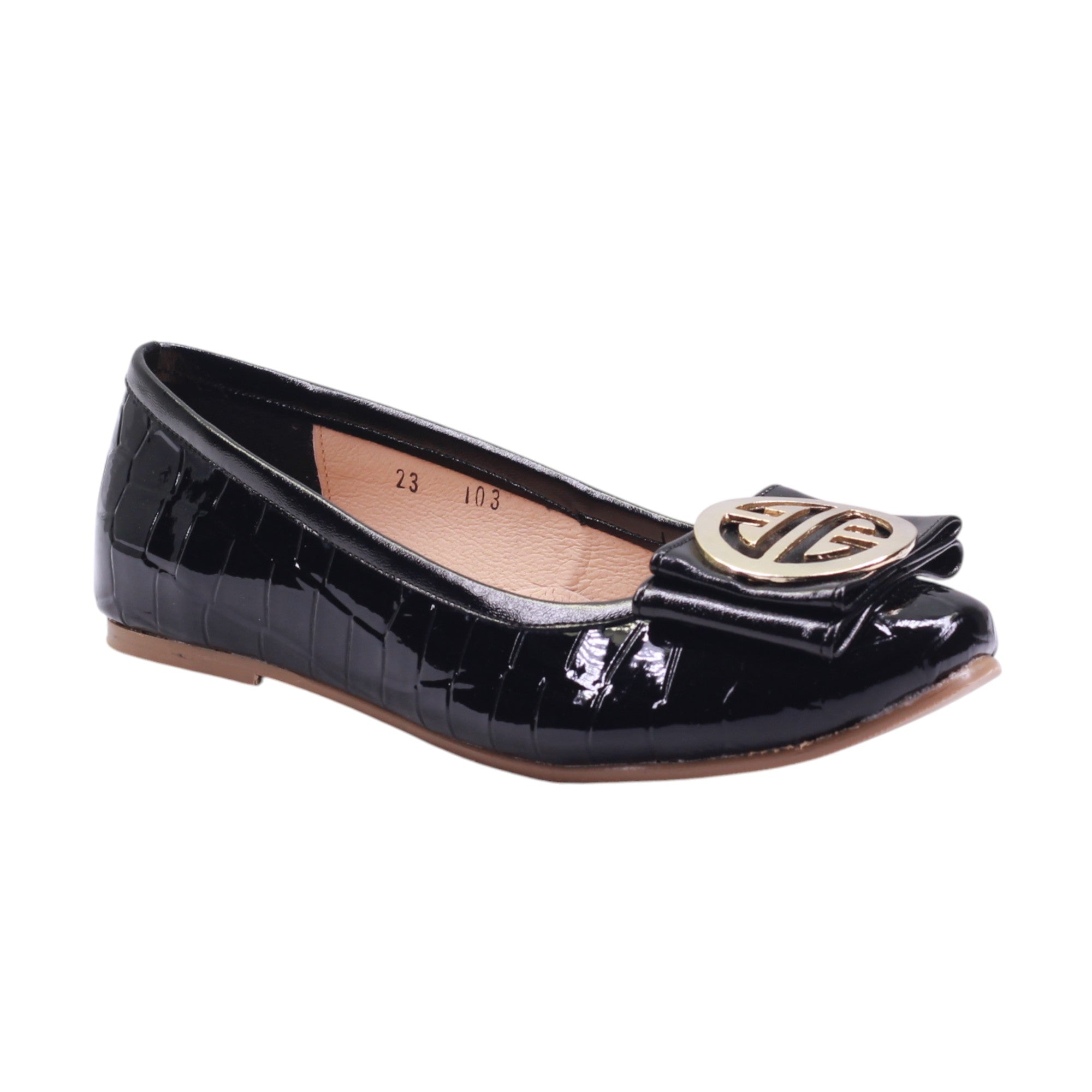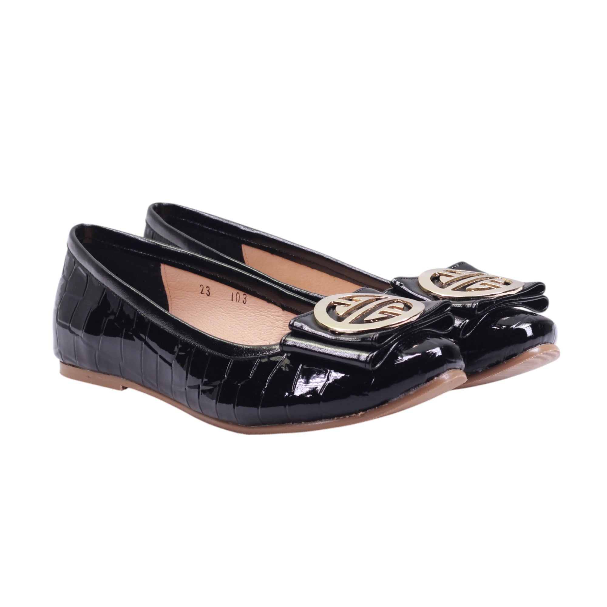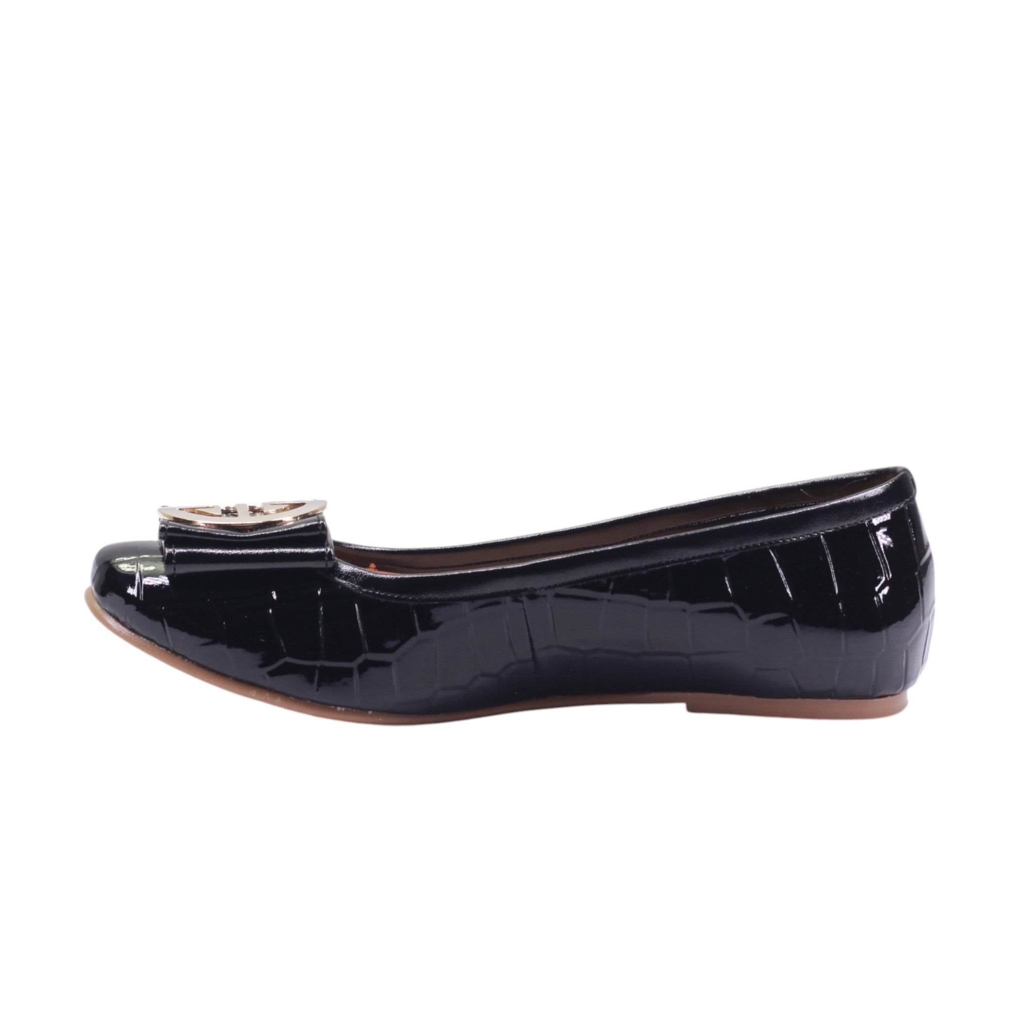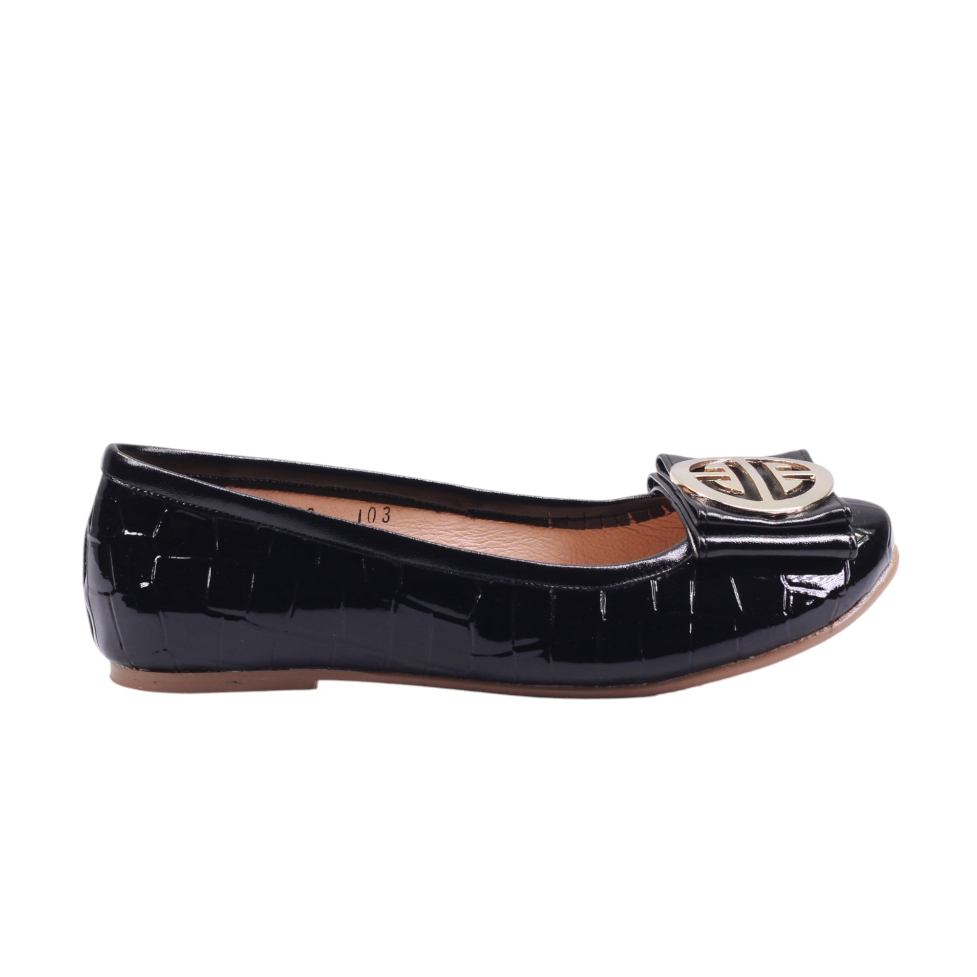 Flats para dama marca Francis en color negro. Este modelo combina sofisticación y comodidad en un diseño versátil. Fabricado en material sintético con acabado charolado, presenta una textura tipo cocodrilo que aporta carácter y distinción. El adorno metálico frontal, en tono dorado, añade un toque elegante y moderno. El tacón bajo ofrece una elevación ligera, ideal para caminar con seguridad sin perder estilo. El forro sintético interno brinda suavidad y confort para uso prolongado. Su diseño tipo slip-on permite un calce rápido y práctico.
