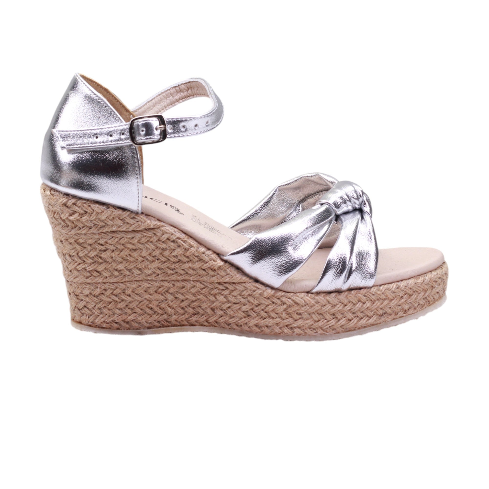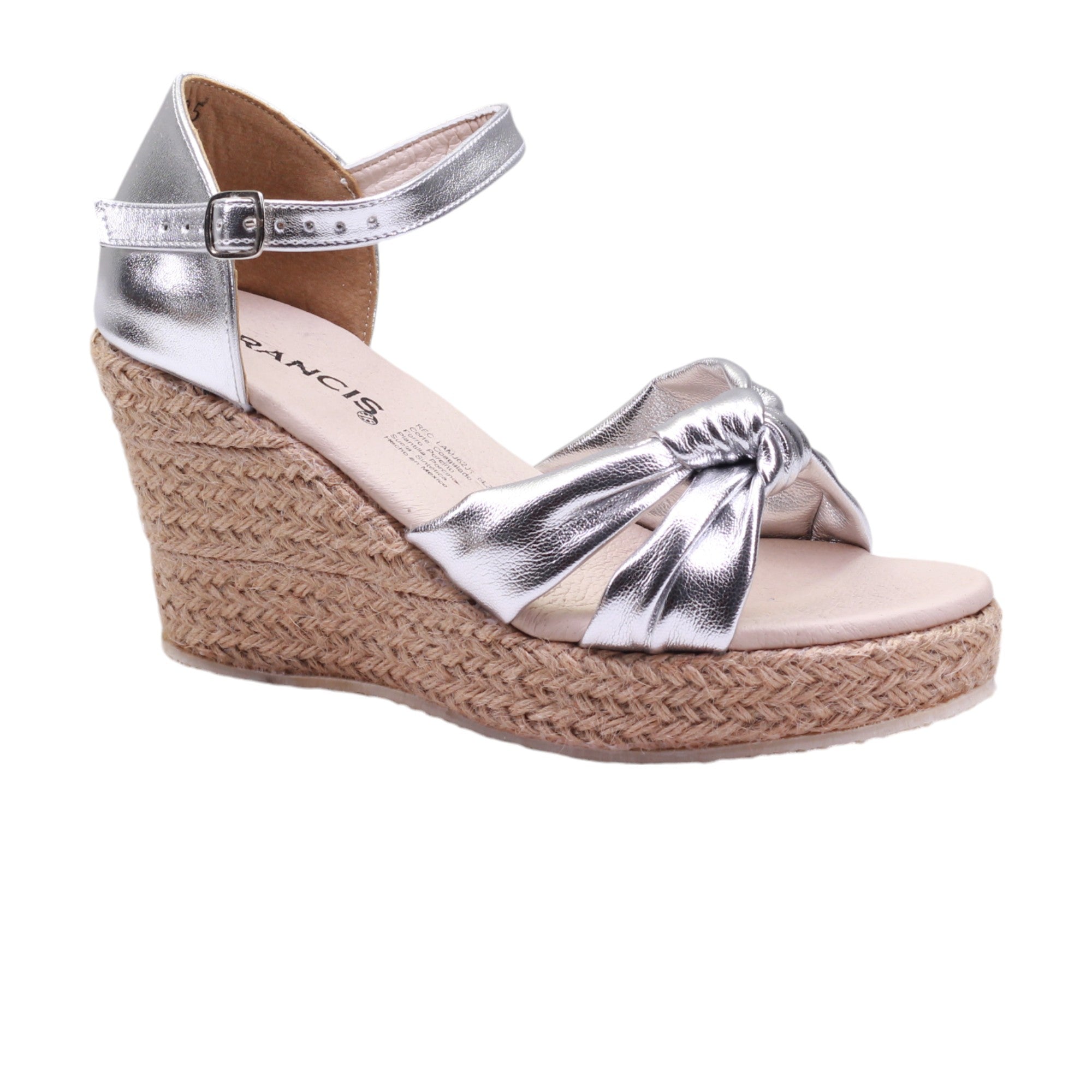 Plataforma para dama marca Francis en color plata. Modelo con altura de 8.00 cm, este calzado ofrece un aumento de altura sin sacrificar comodidad. El ajuste al tobillo con tira delgada y hebilla asegura un calce perfecto, mientras que las doble tiras con nudo en el corte añaden un toque de estilo a este elegante zapato.