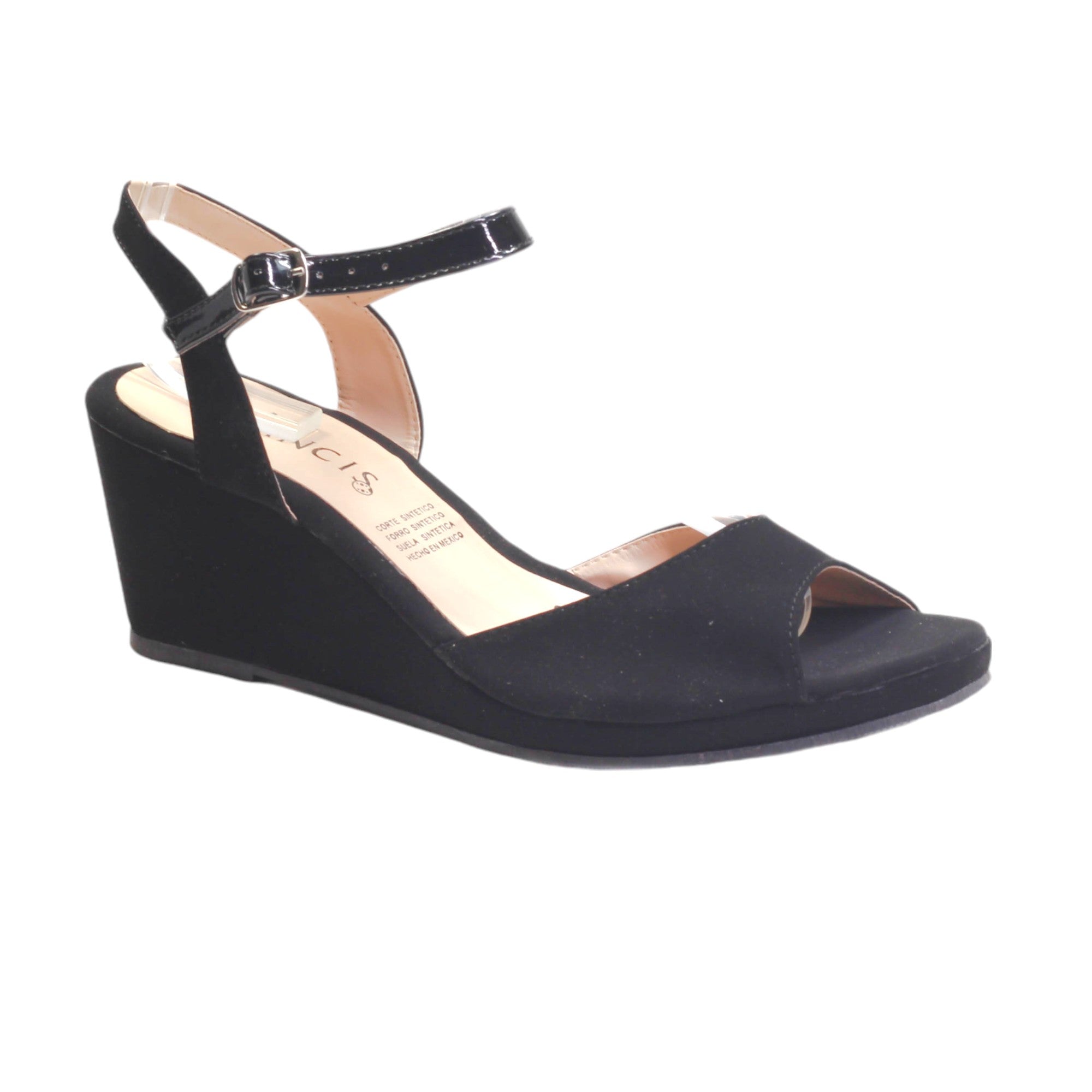 Plataforma para dama marca Francis en color negro. Modelo perfecto para usar en las ocasiones especiales que tengas, su peso ligero y plataforma trasera medio-alta te hará estar cómoda a cada paso. Cuenta con doble tira en cruce al tobillo, un ajuste perfecto y una tira ancha de frente cubierta con pedrería.