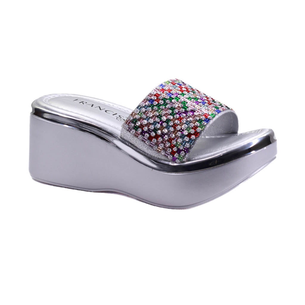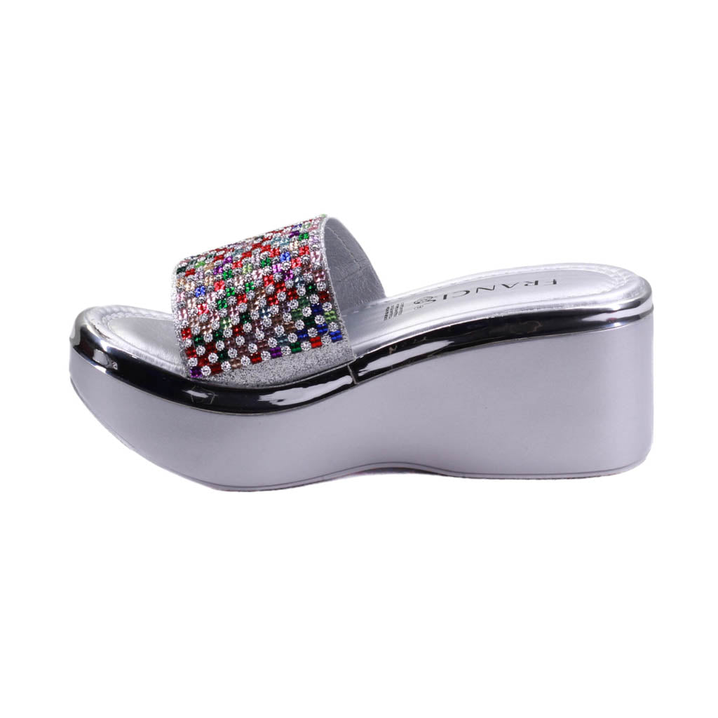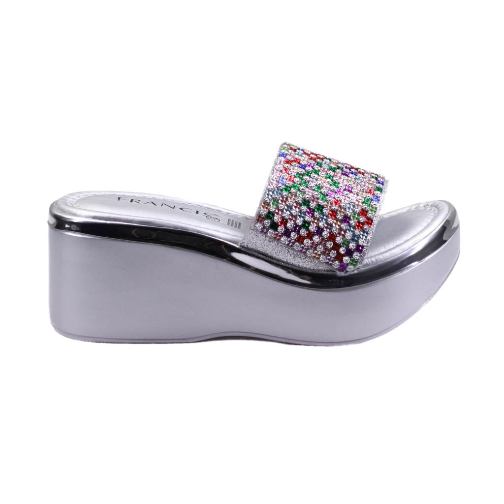 Plataforma para dama marca Francis en color plata. Bonito diseño con pedrería, este modelo se destaca por su acabado y plataforma corrida, además de sus llamativas piedras.