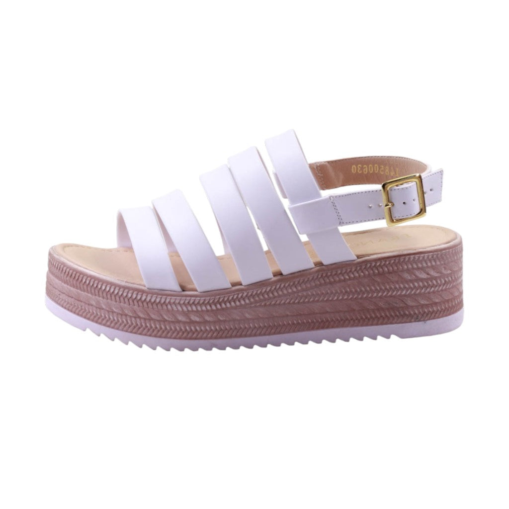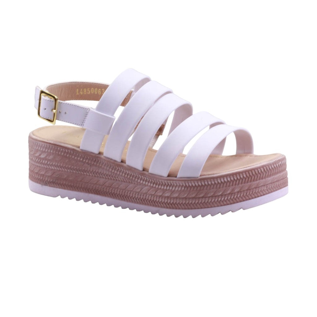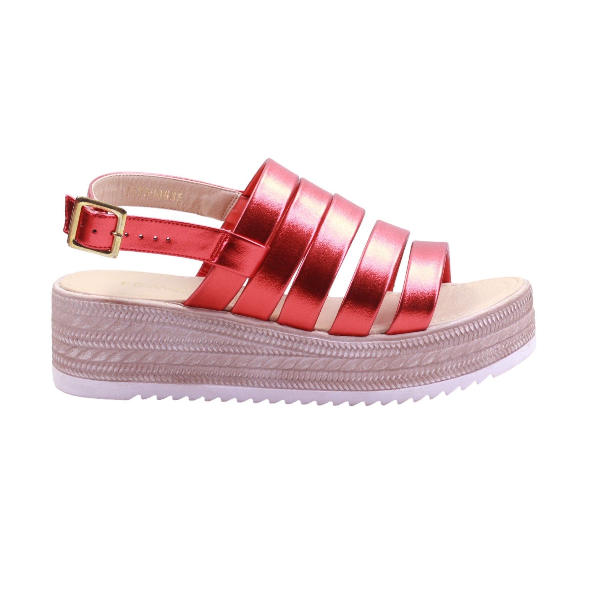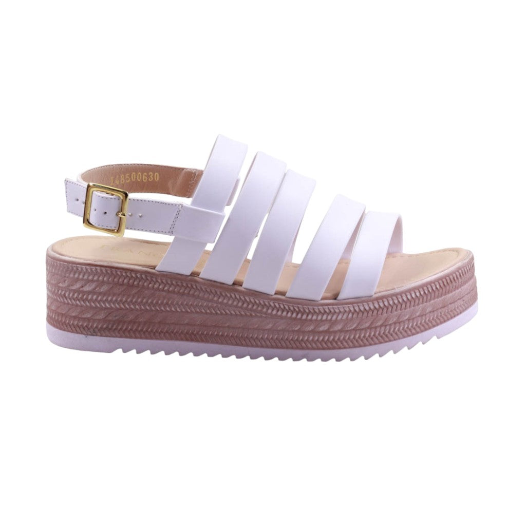 Sandalia con plataforma para dama marca Francis en colores blanco, elemental y escarlata. Este zapato de diseño exclusivo tiene una altura de 4.5 cm para mayor comodidad y una plataforma con diseño en tejido de alta calidad. La plantilla de confort brinda un ajuste perfecto y se ajusta fácilmente con la hebilla trasera. Con 5 tiras de sujeción, ofrecen un soporte seguro para caminar con confianza.