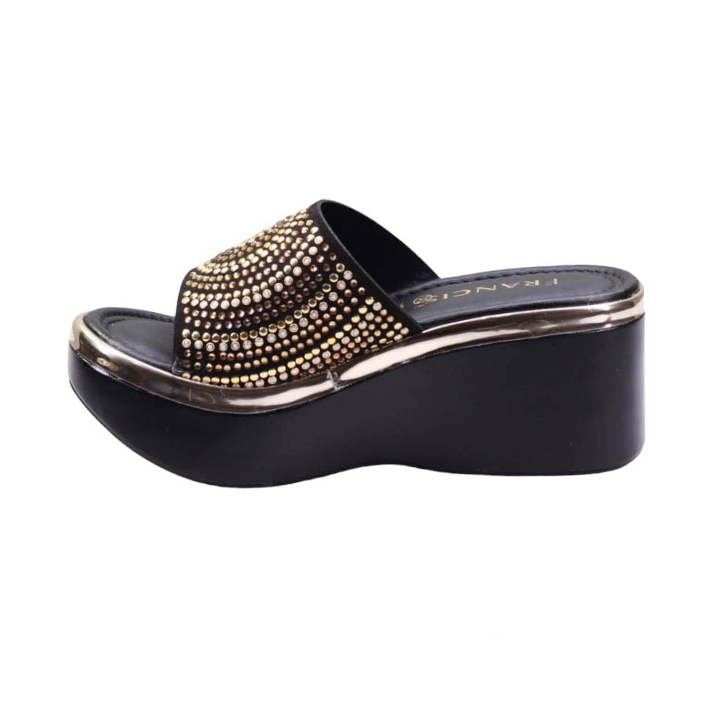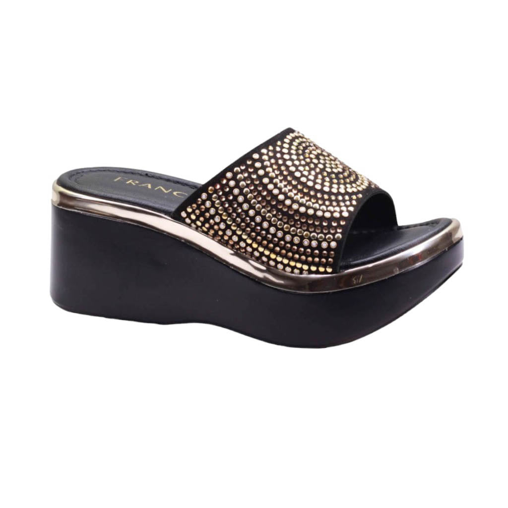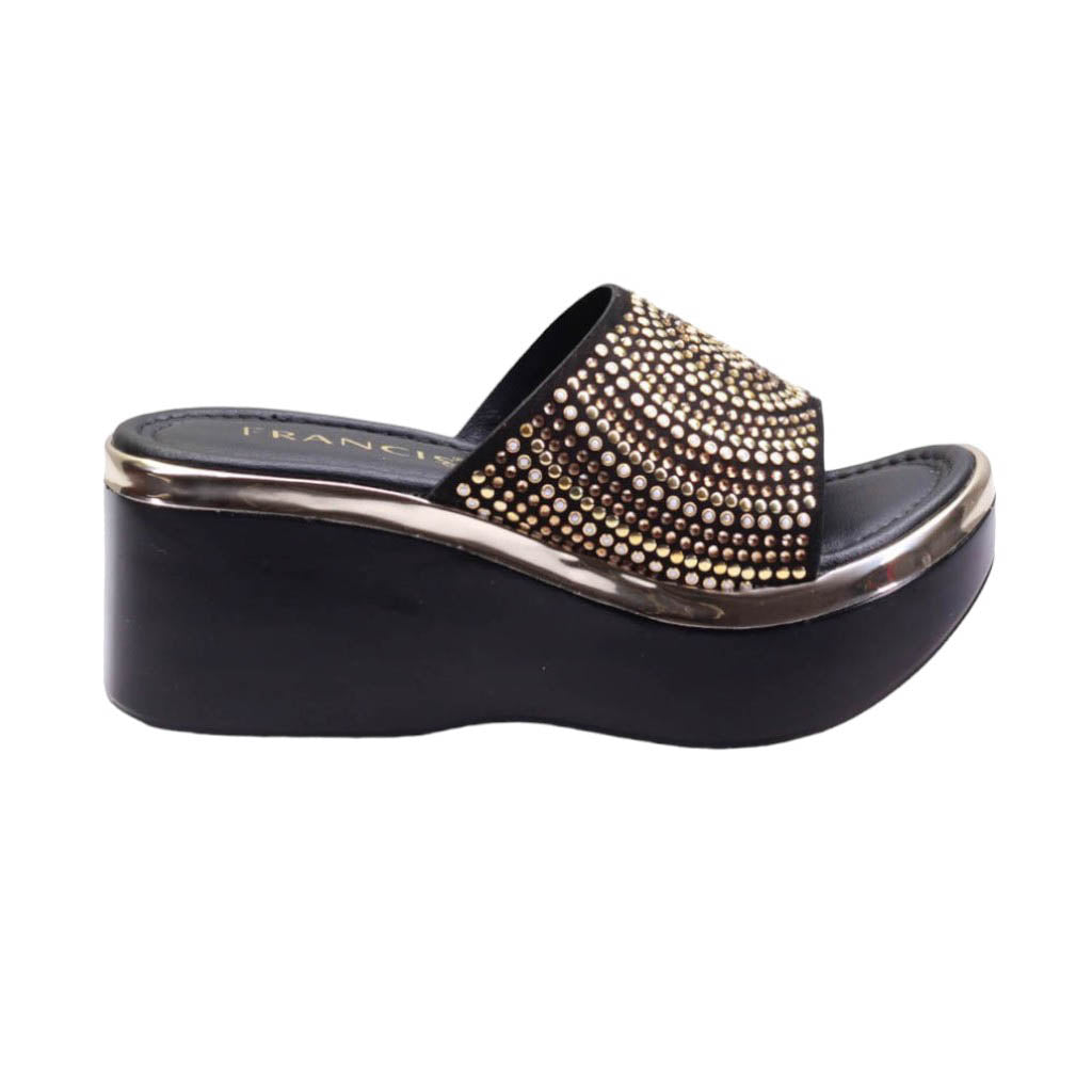 Plataforma para dama marca Francis en colores negro y oro. Bonito diseño con pedrería, este modelo se destaca por sus atractivas y llamativas piedras.