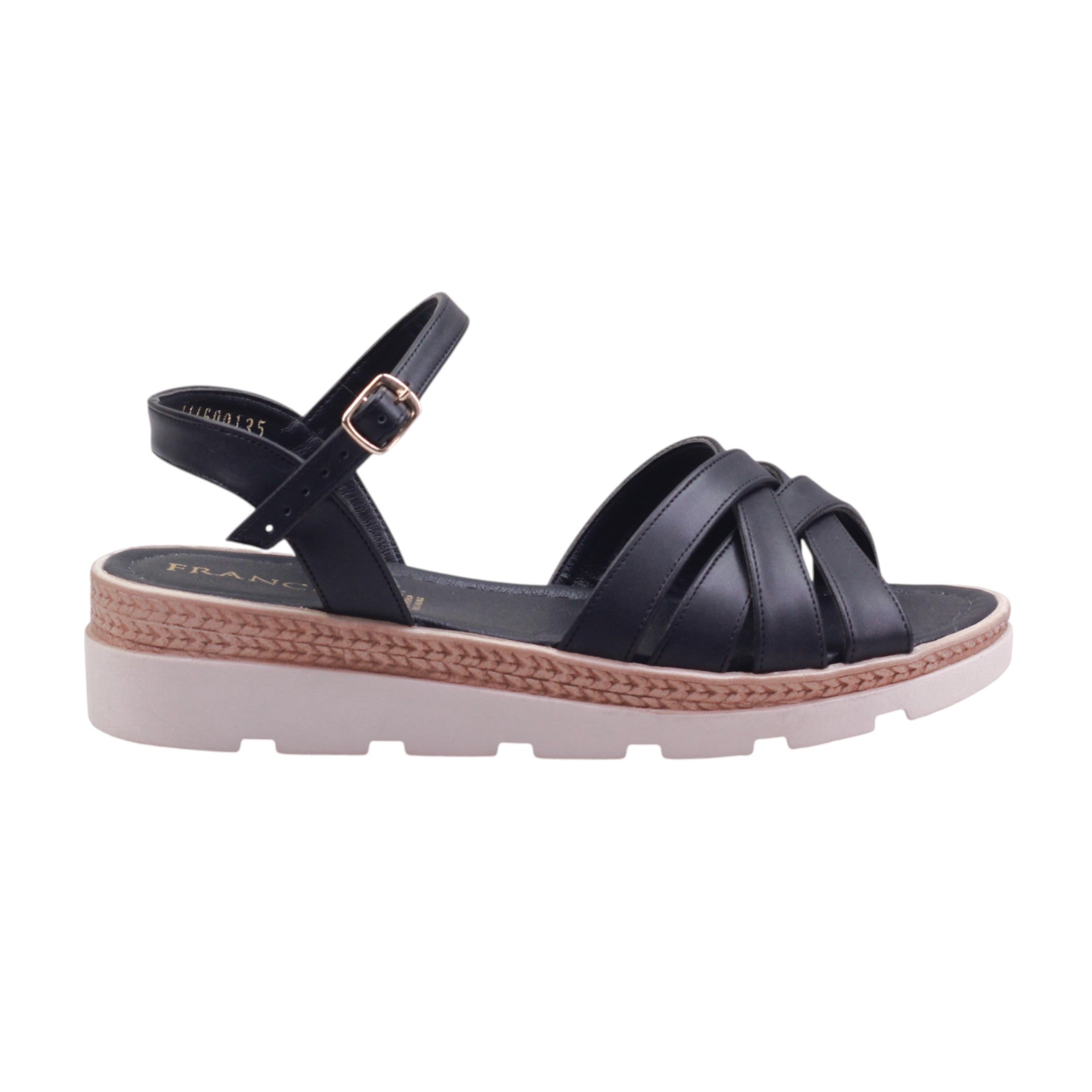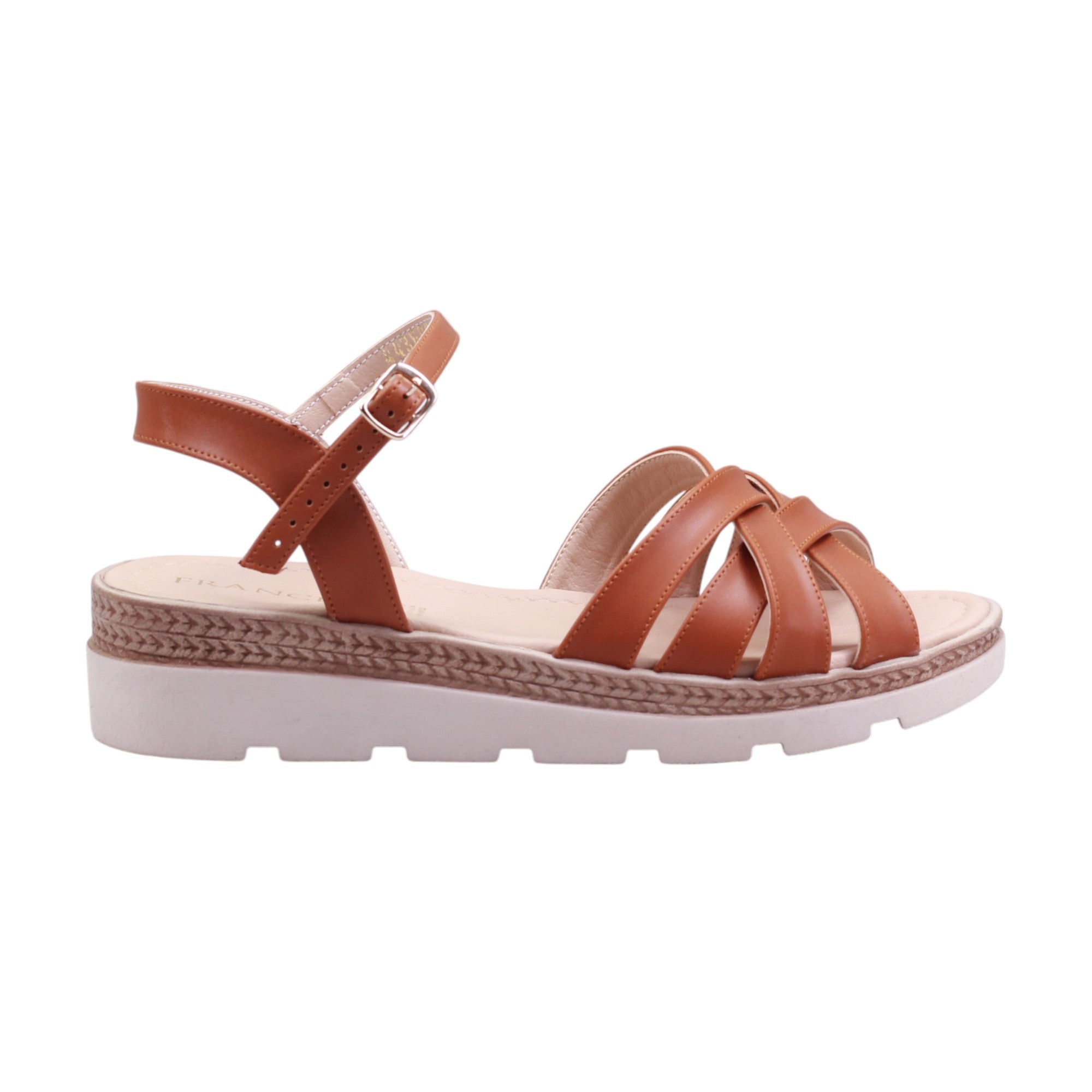 Sandalia para dama marca Francis en colores armañac y negro. Diseño fresco con estructura cómoda y detalles artesanales. Esta sandalia está elaborada en piel artificial tanto en el corte como en el forro, con acabado que aporta calidez y versatilidad. El frente presenta un juego de tiras cruzadas que envuelven el empeine con estilo, creando una silueta dinámica y bien equilibrada.