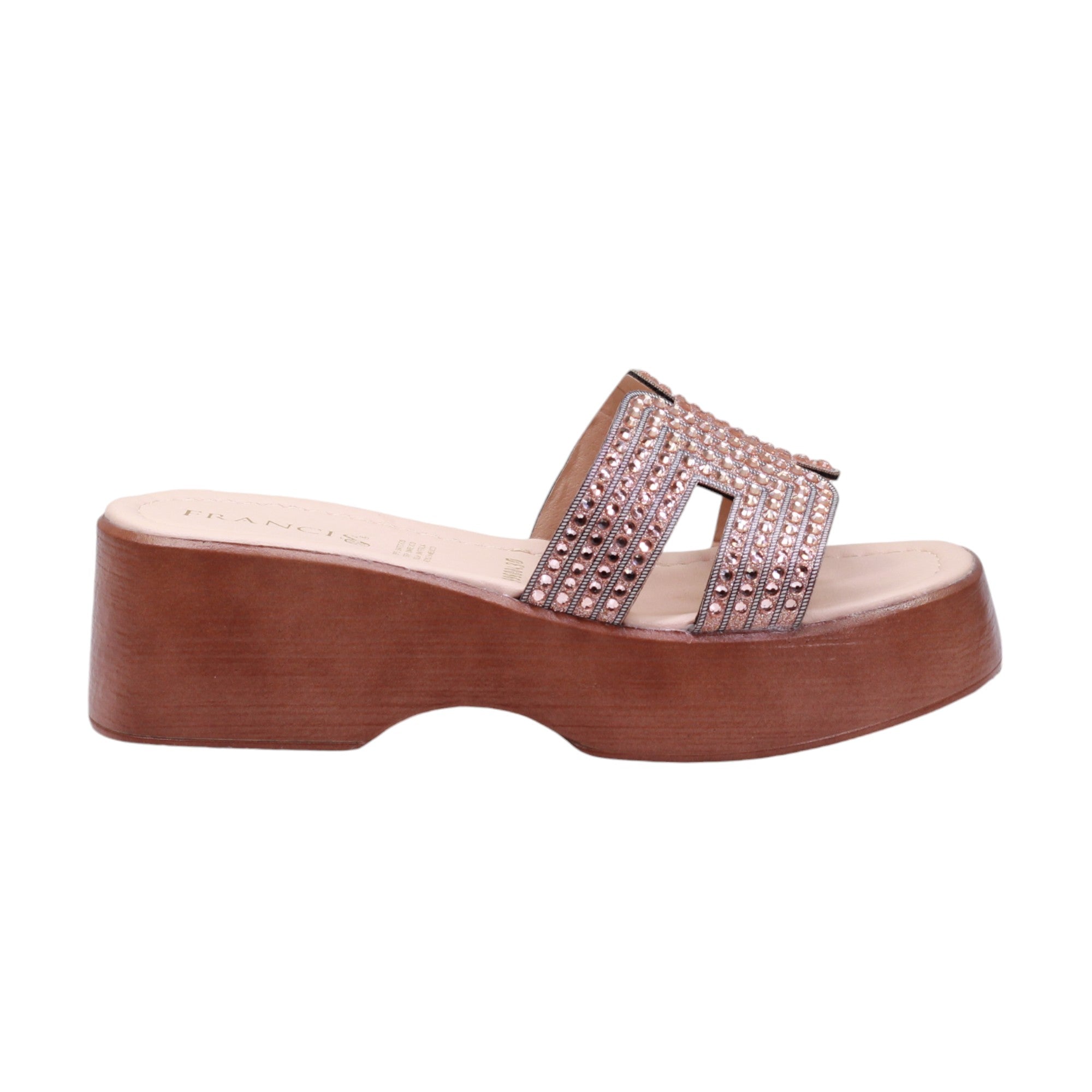 Sandalia con plataforma para dama marca Francis en color oro rosado. Este modelo cuenta con una plataforma que tiene una altura de 5.00 cm, lo que brinda una mayor comodidad al caminar. Además, el corte está cubierto en pedrería de fantasía en tonos rosados, lo que le agrega un toque atractivo al calzado. Ideal para cualquier ocasión casual.