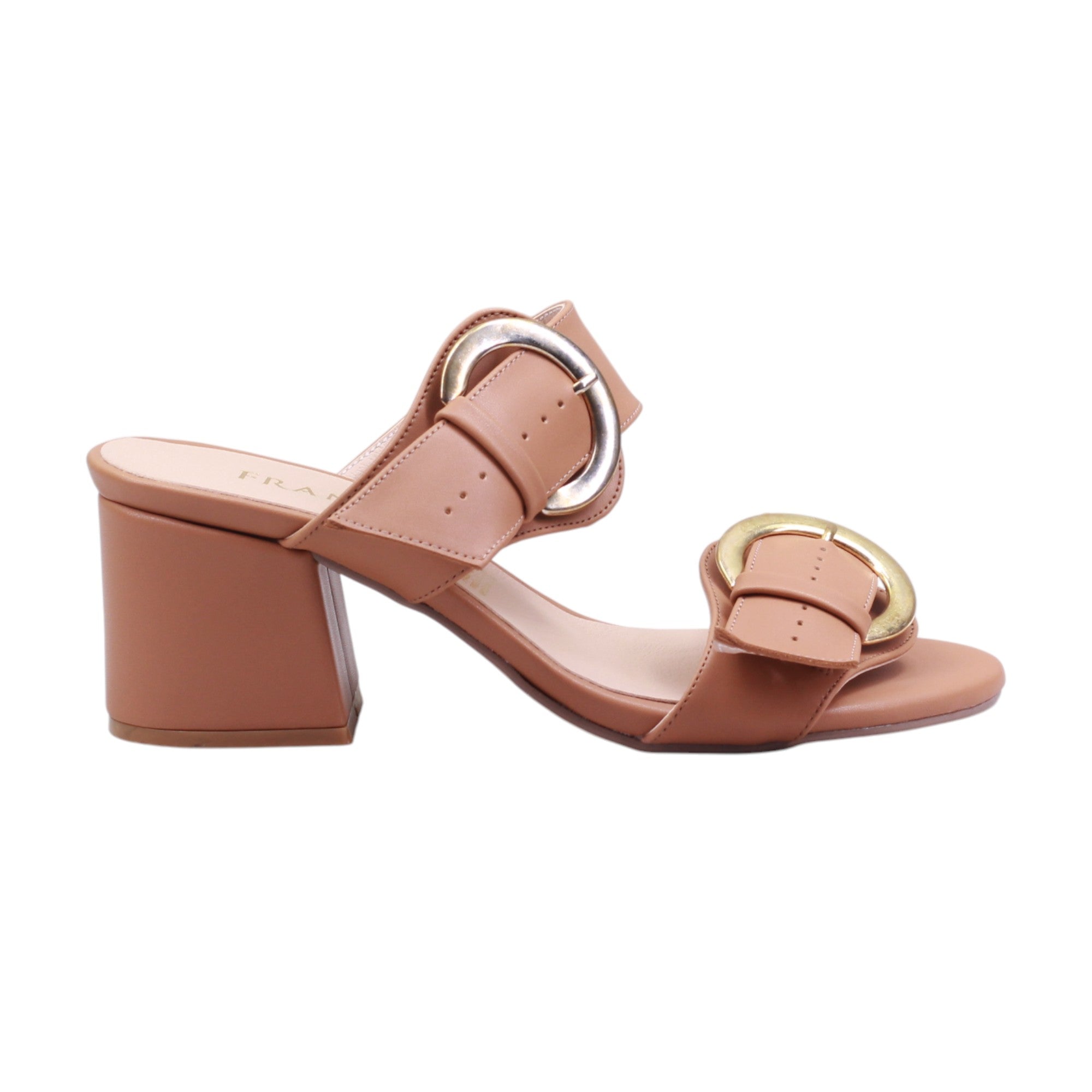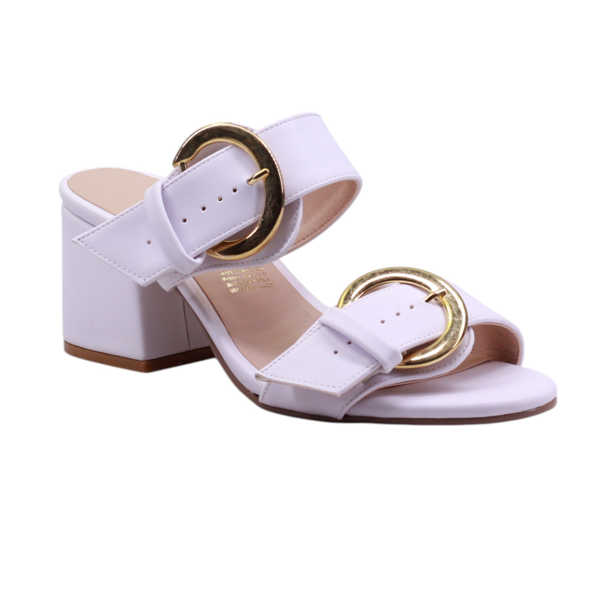 Sandalia de tacón medio con doble tira y hebillas doradas