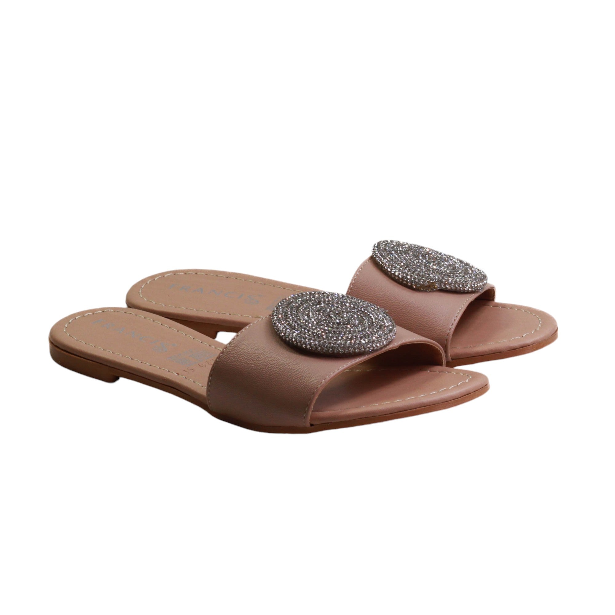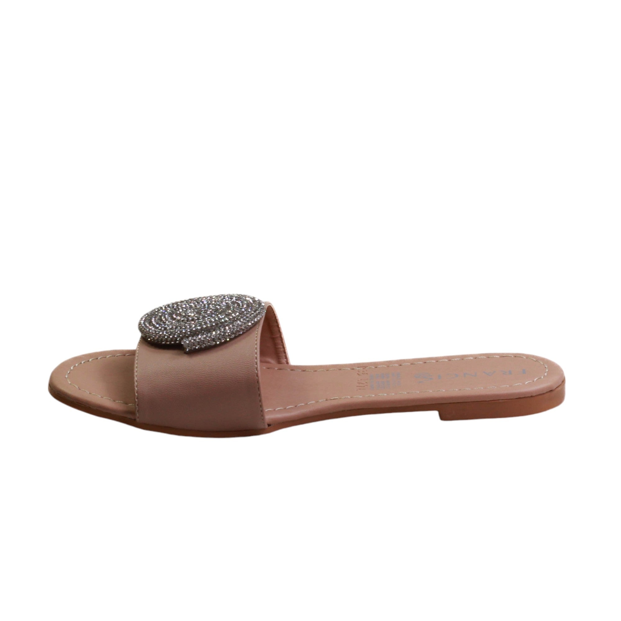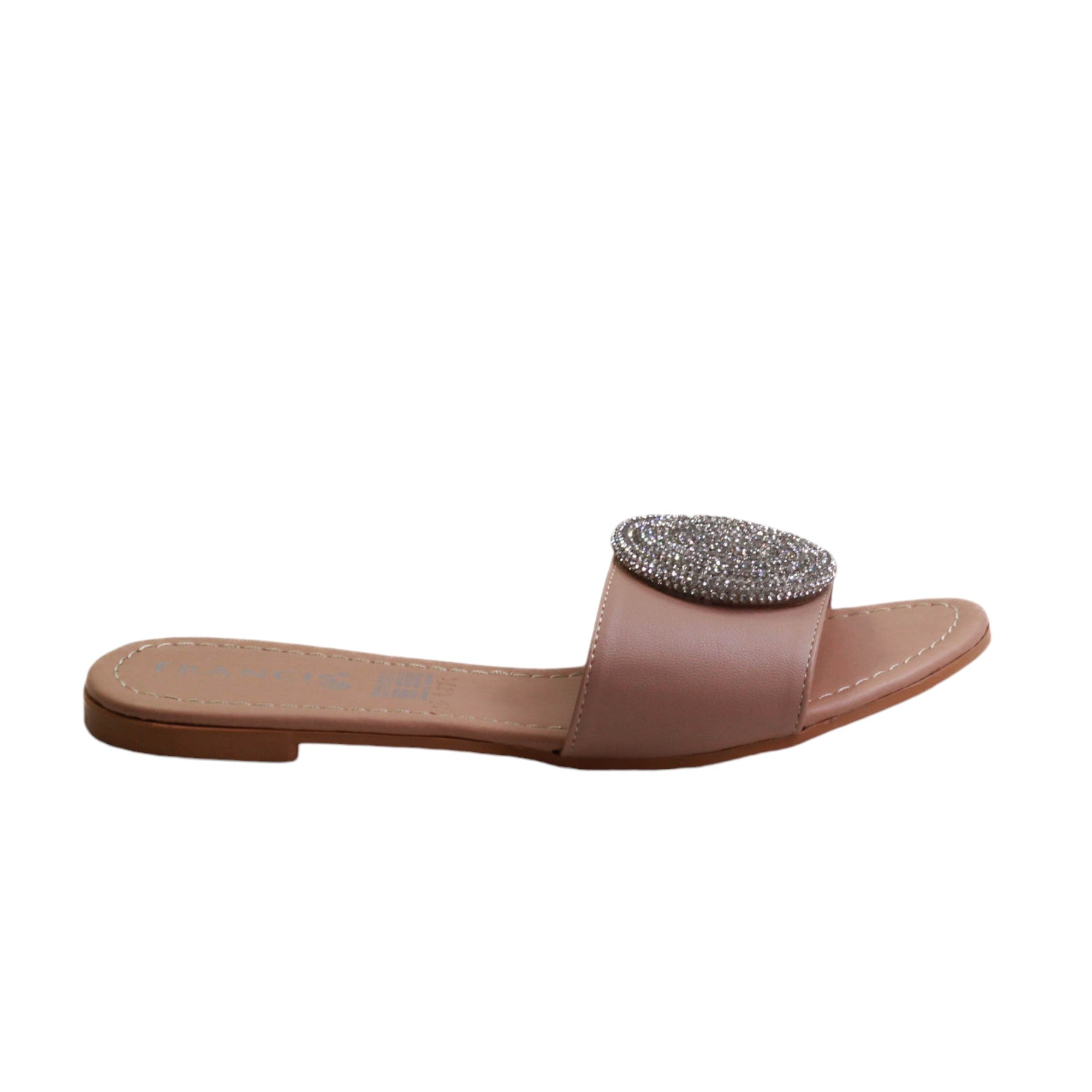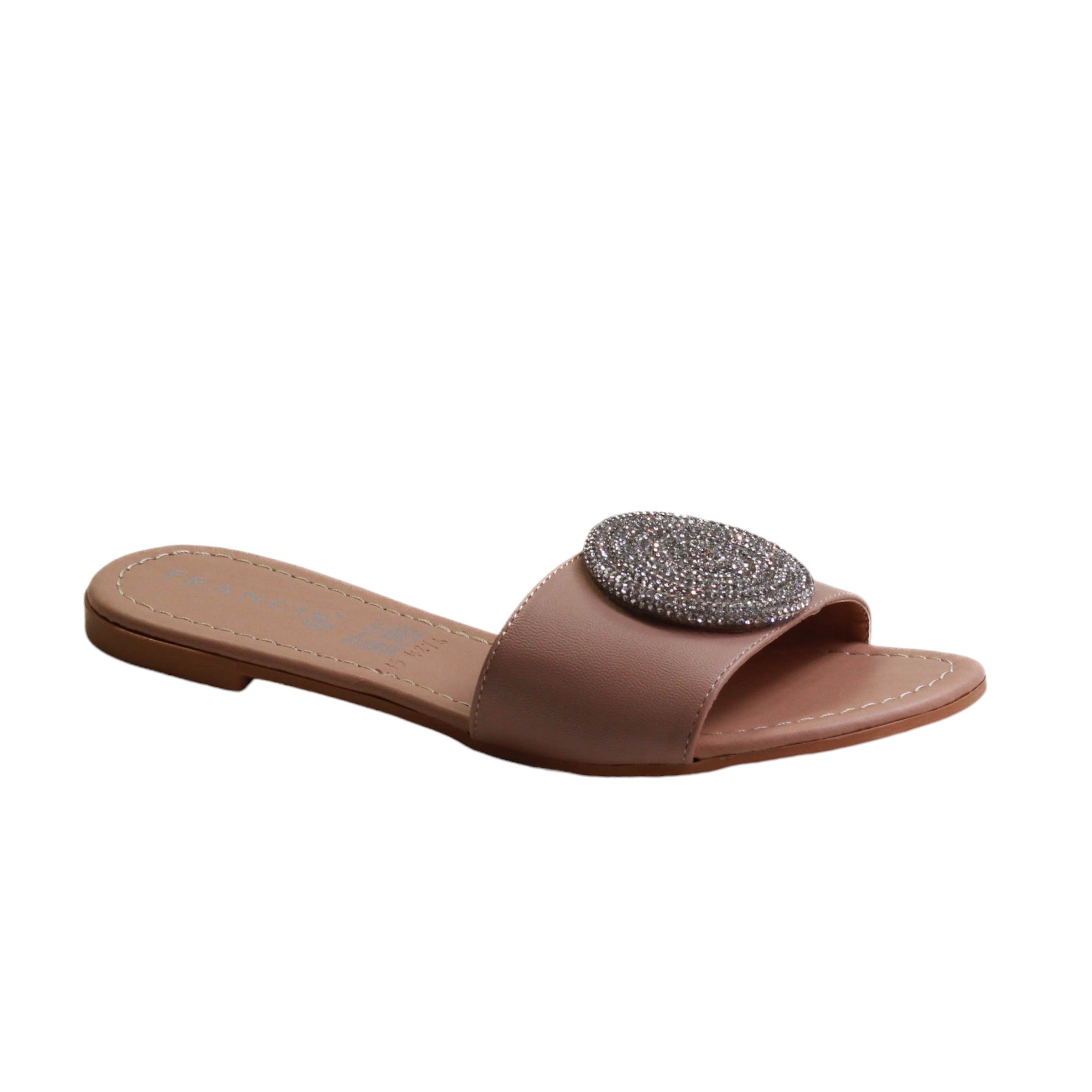 Zapatilla para dama marca Francis en color maquillaje y negro. Sandalia de descanso con estampado en pedreria. esta sandalia destaca por su plantilla de confort y su atractiva vista.