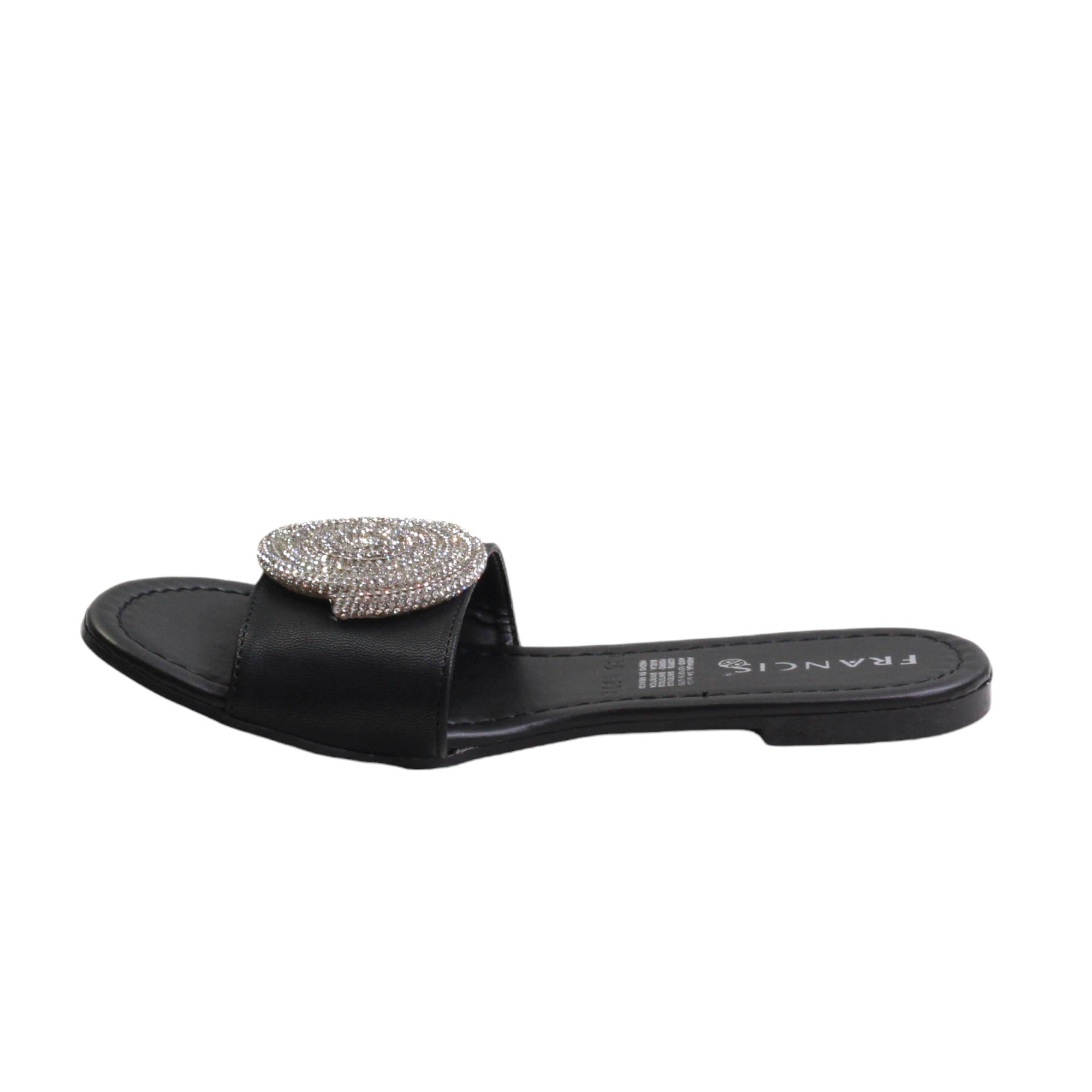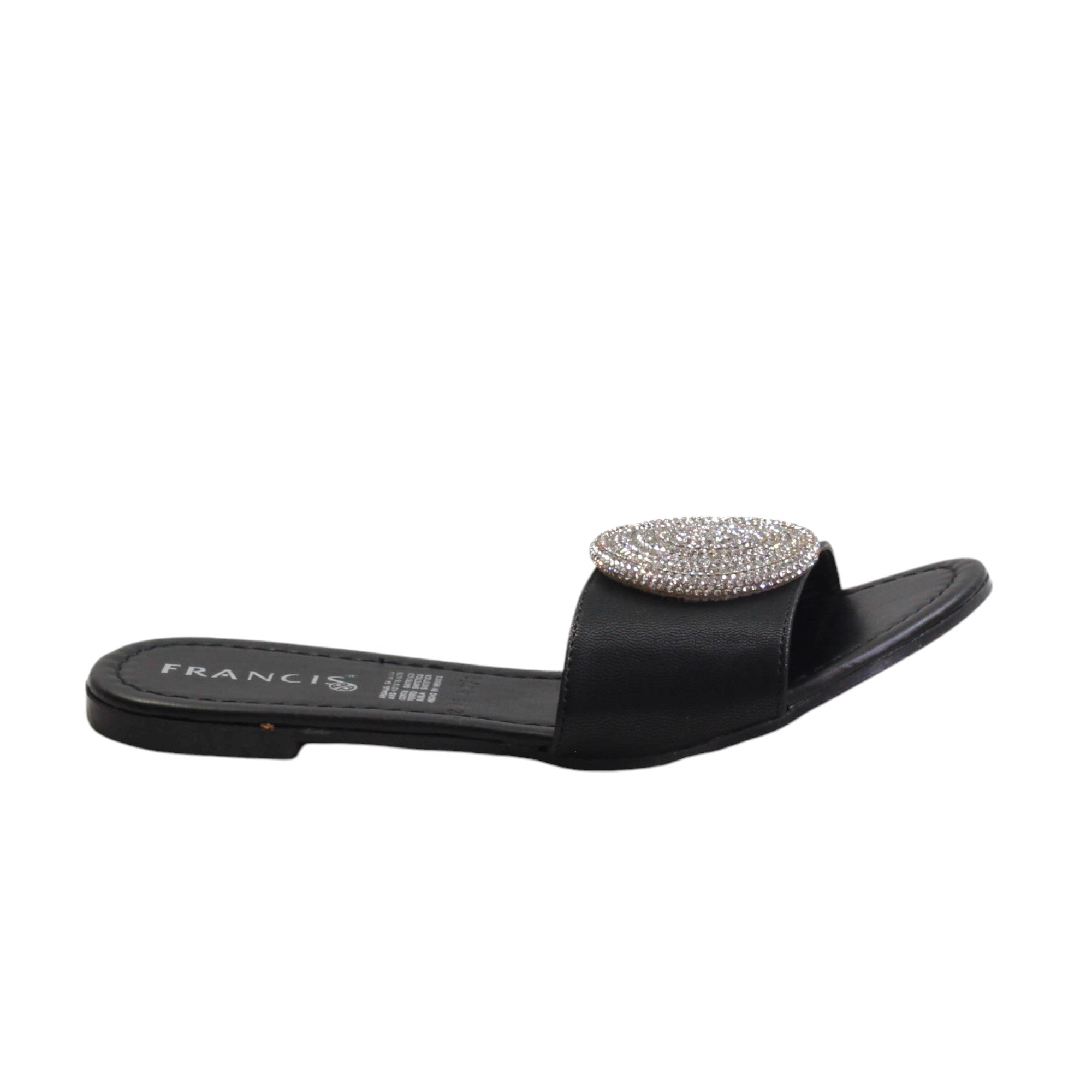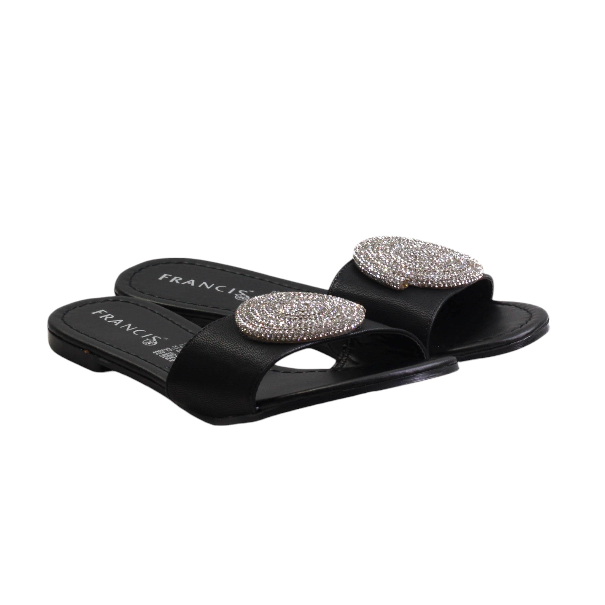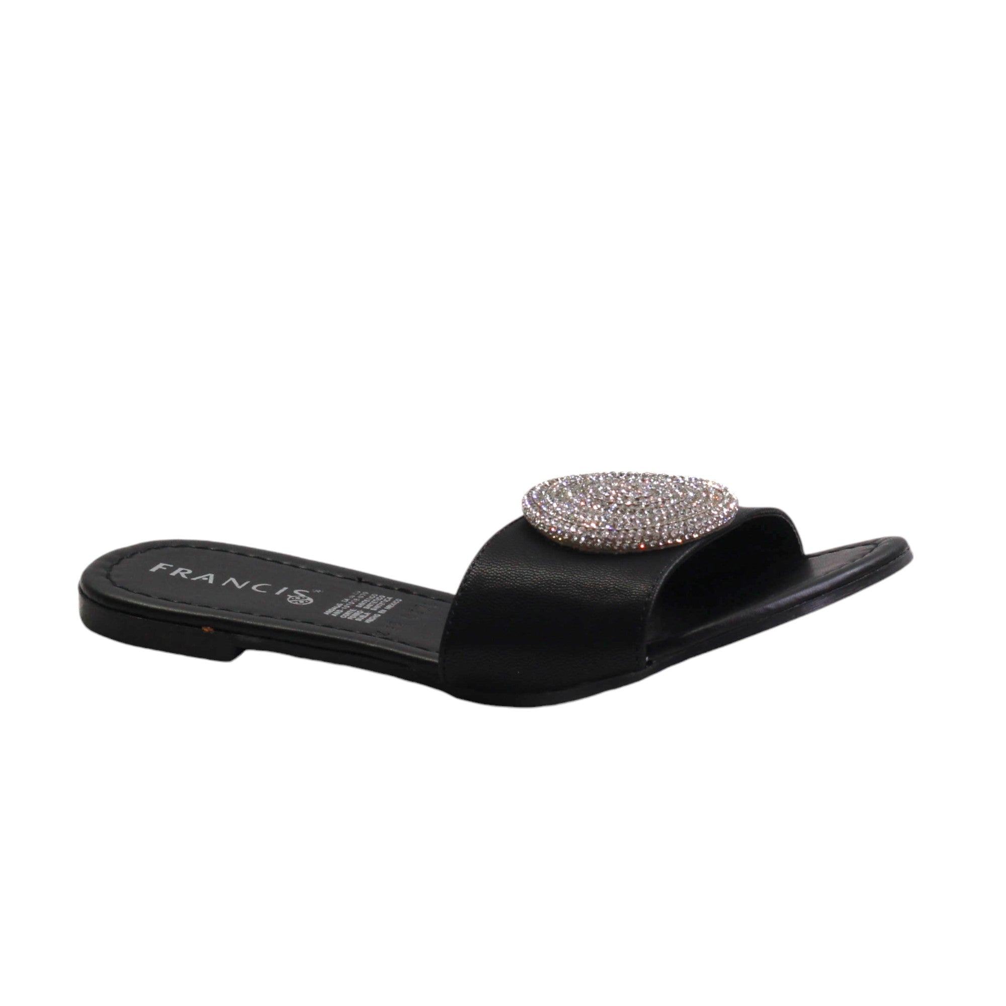 Zapatilla para dama marca Francis en color maquillaje y negro. Sandalia de descanso con estampado en pedreria. esta sandalia destaca por su plantilla de confort y su atractiva vista.