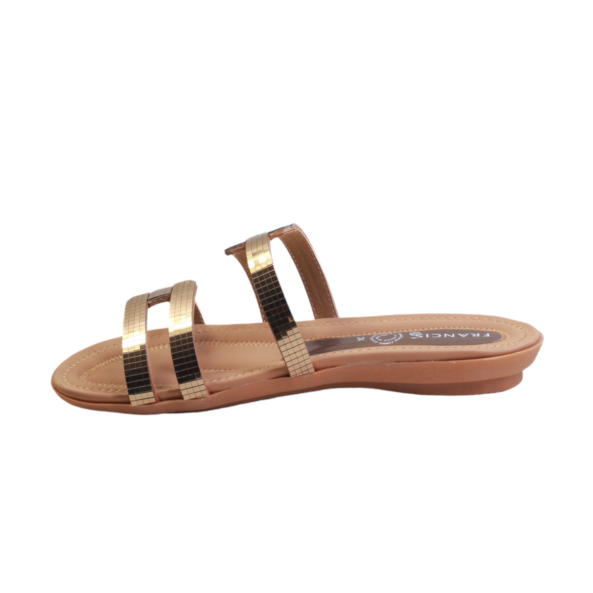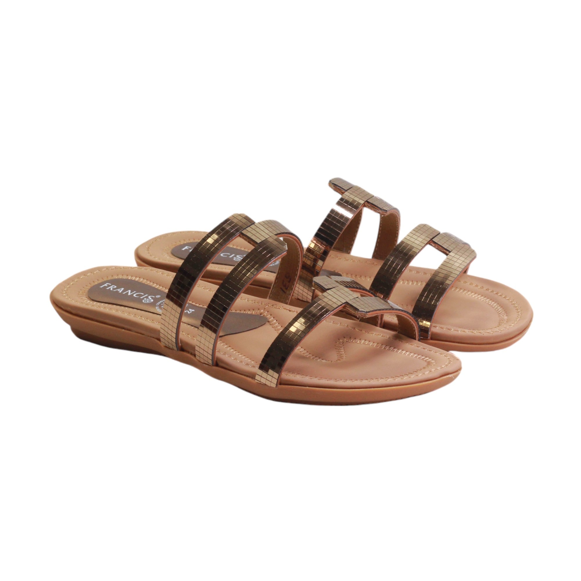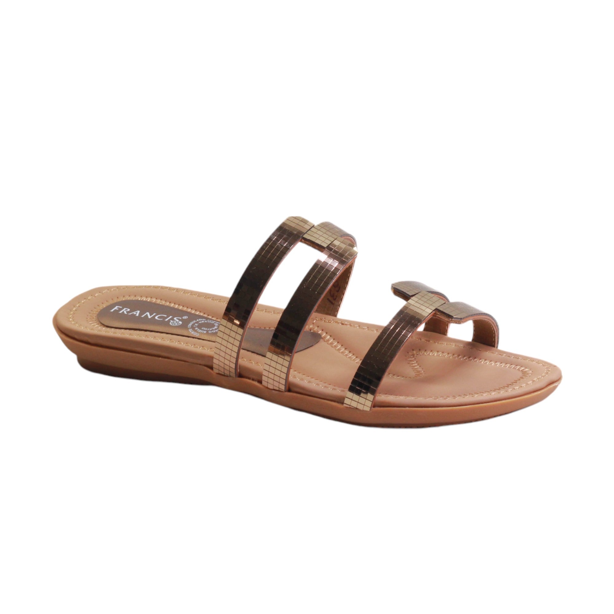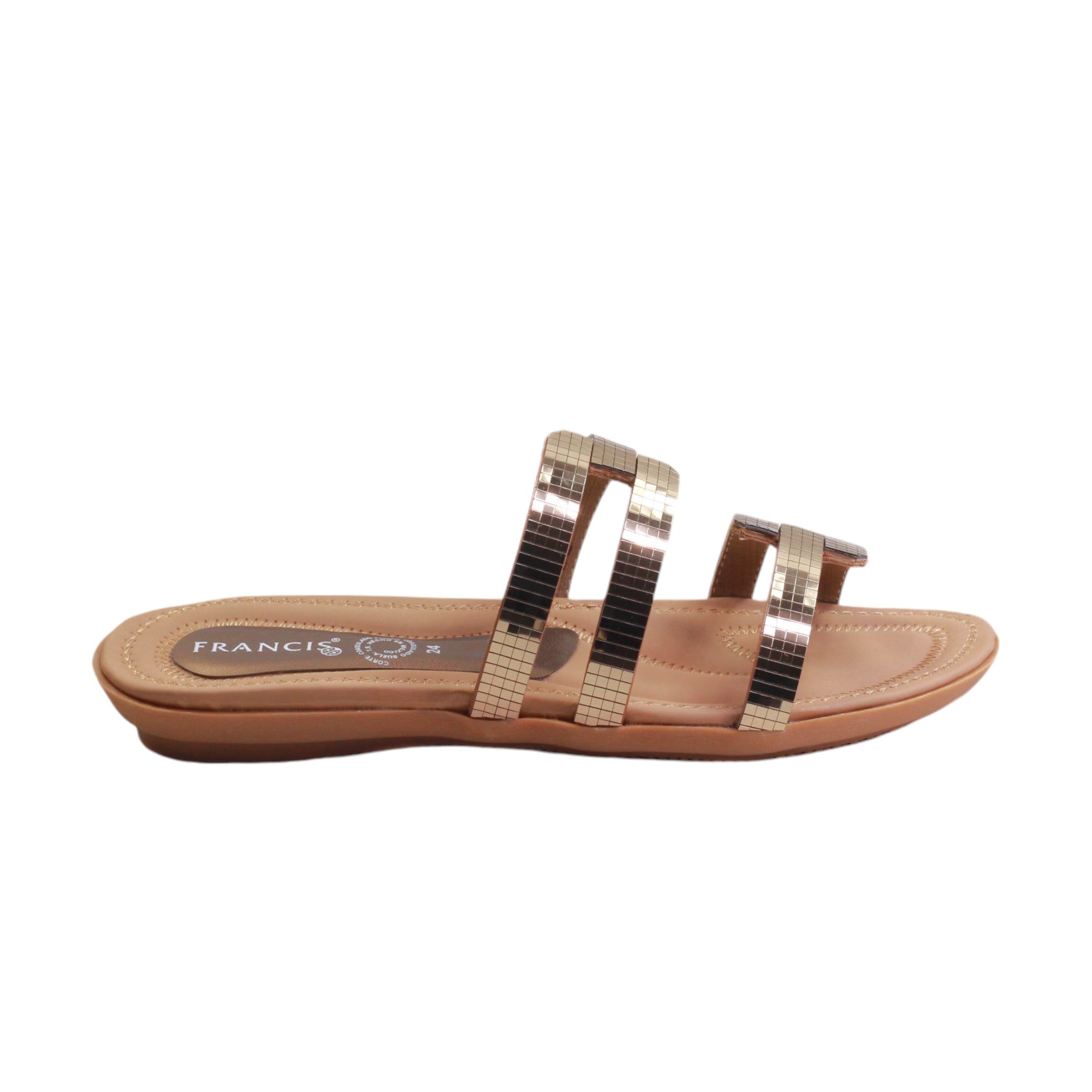 Sandalia para dama marca Francis en color bronce. Este modelo es de metedera, cuenta con diseño en adornos rectangulares, es una sandalia clásica, lo cual hace que no pase de moda, su tacón de 1.00 cm es adecuado para el uso diario. Perfectas para casa o playa. Modelo que no puede faltar en tu guardarropa.