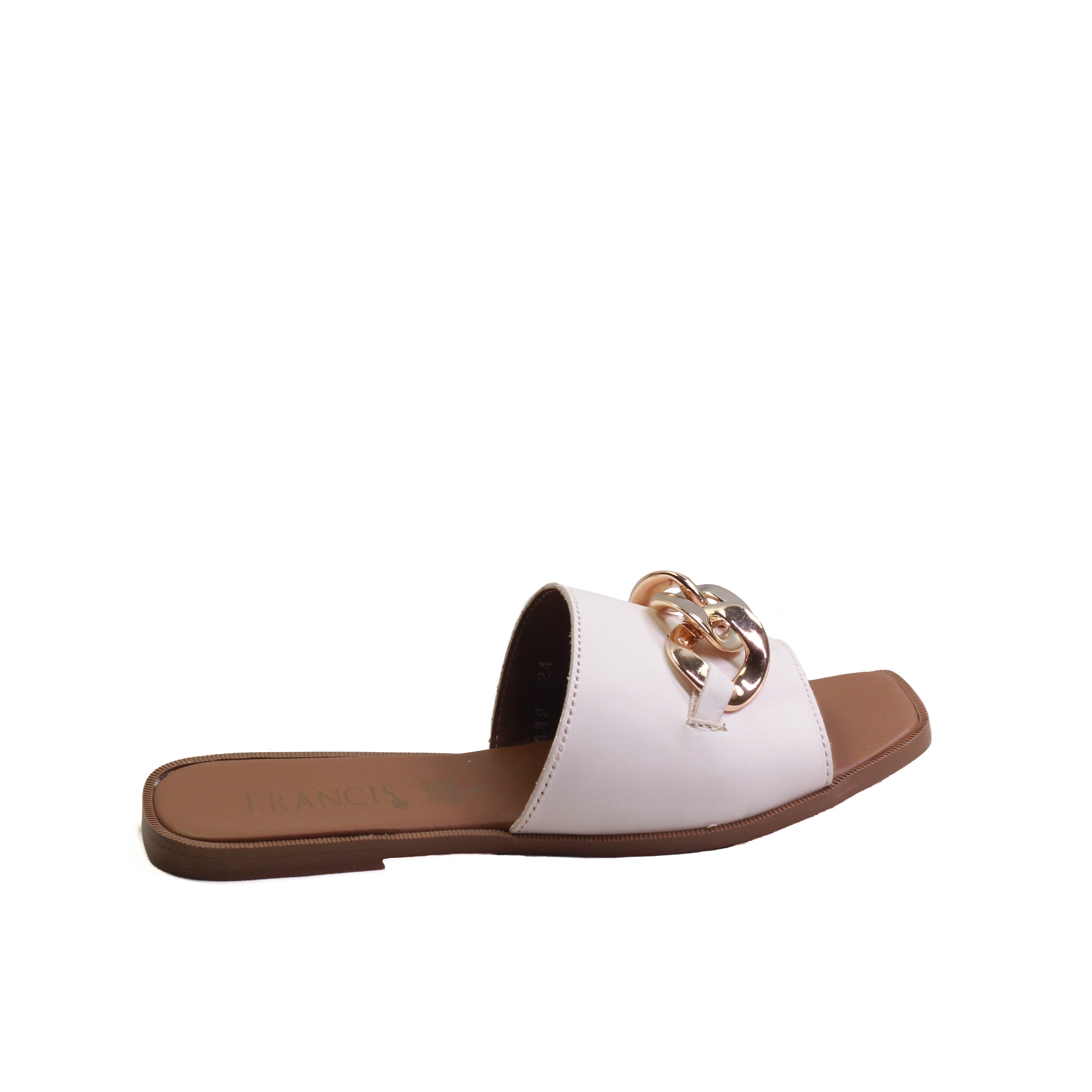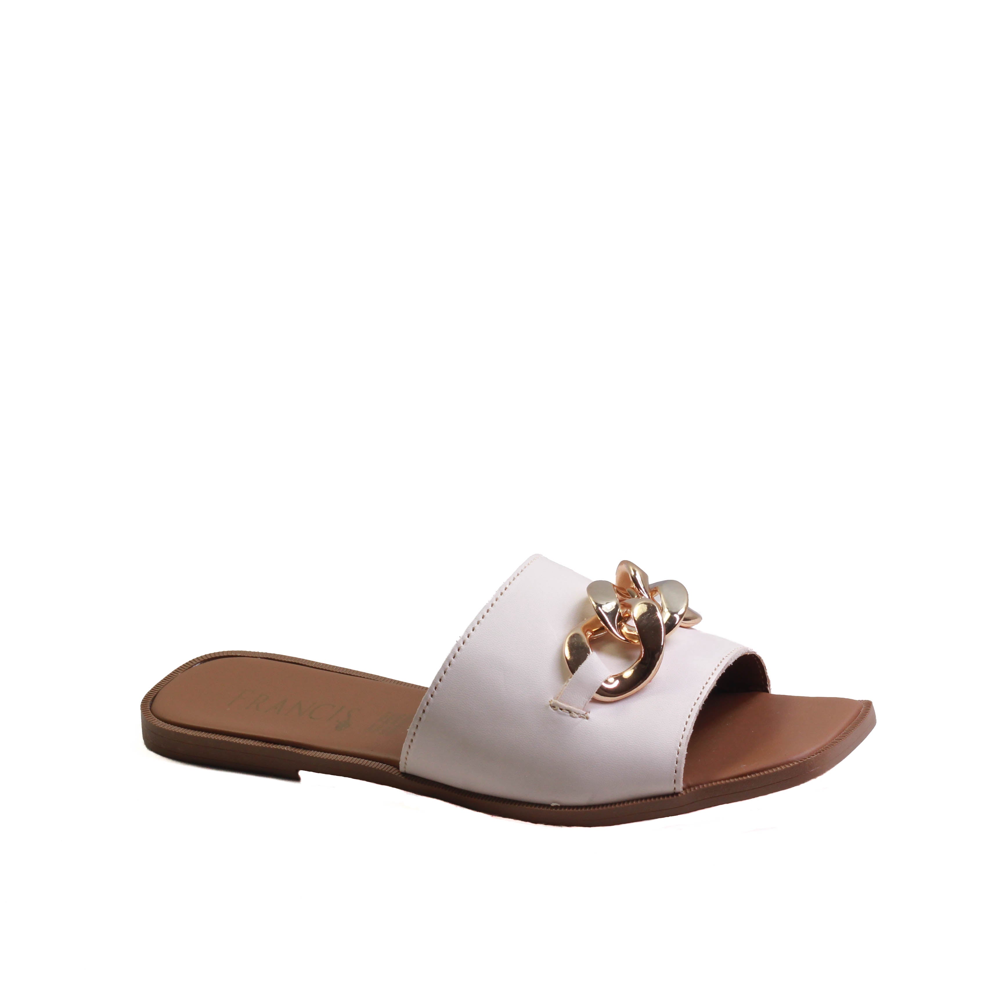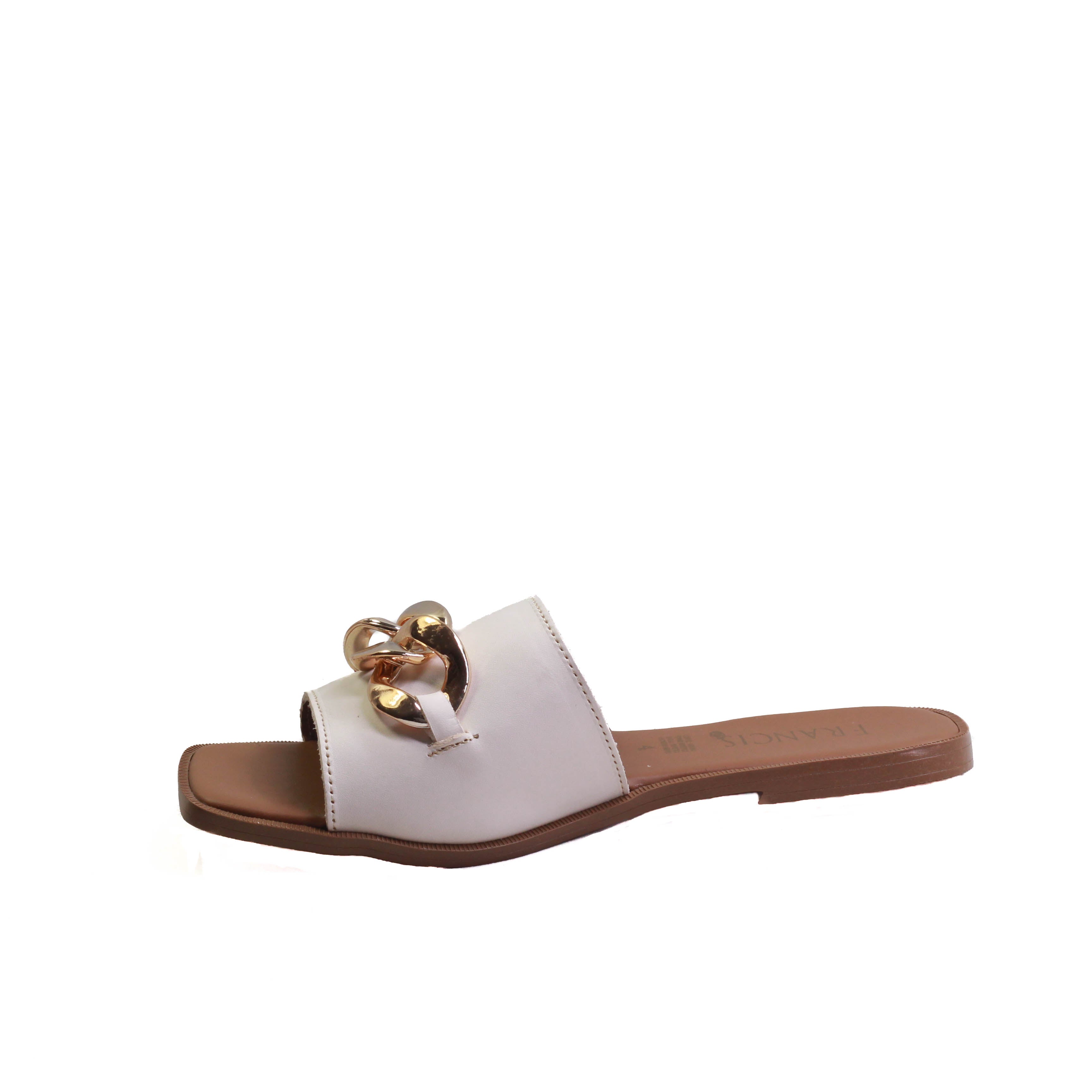 Sandalia para dama marca Francis en colores blanco y negro. Es una sandalia 100% de cuero con adorno frontal de eslabón dorado, cuenta con plantilla confortable para que tus caminatas sean agradables paso a paso.