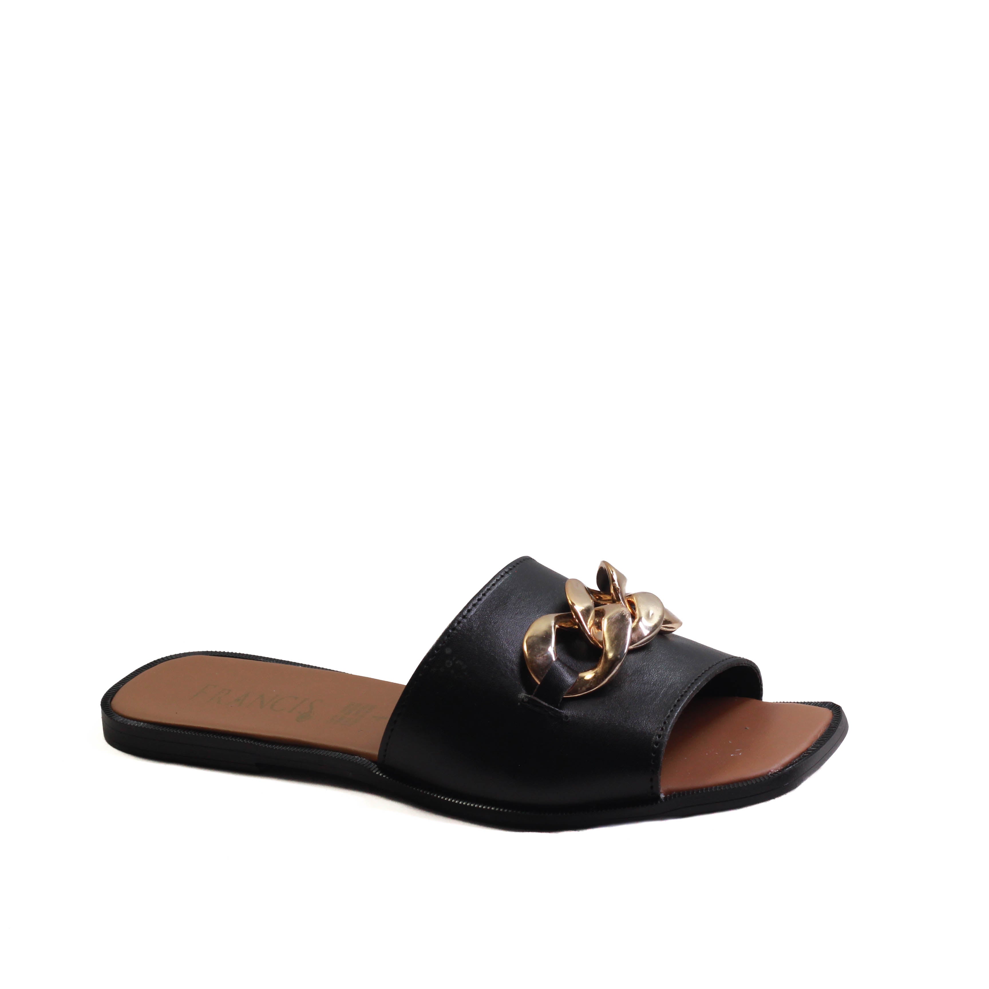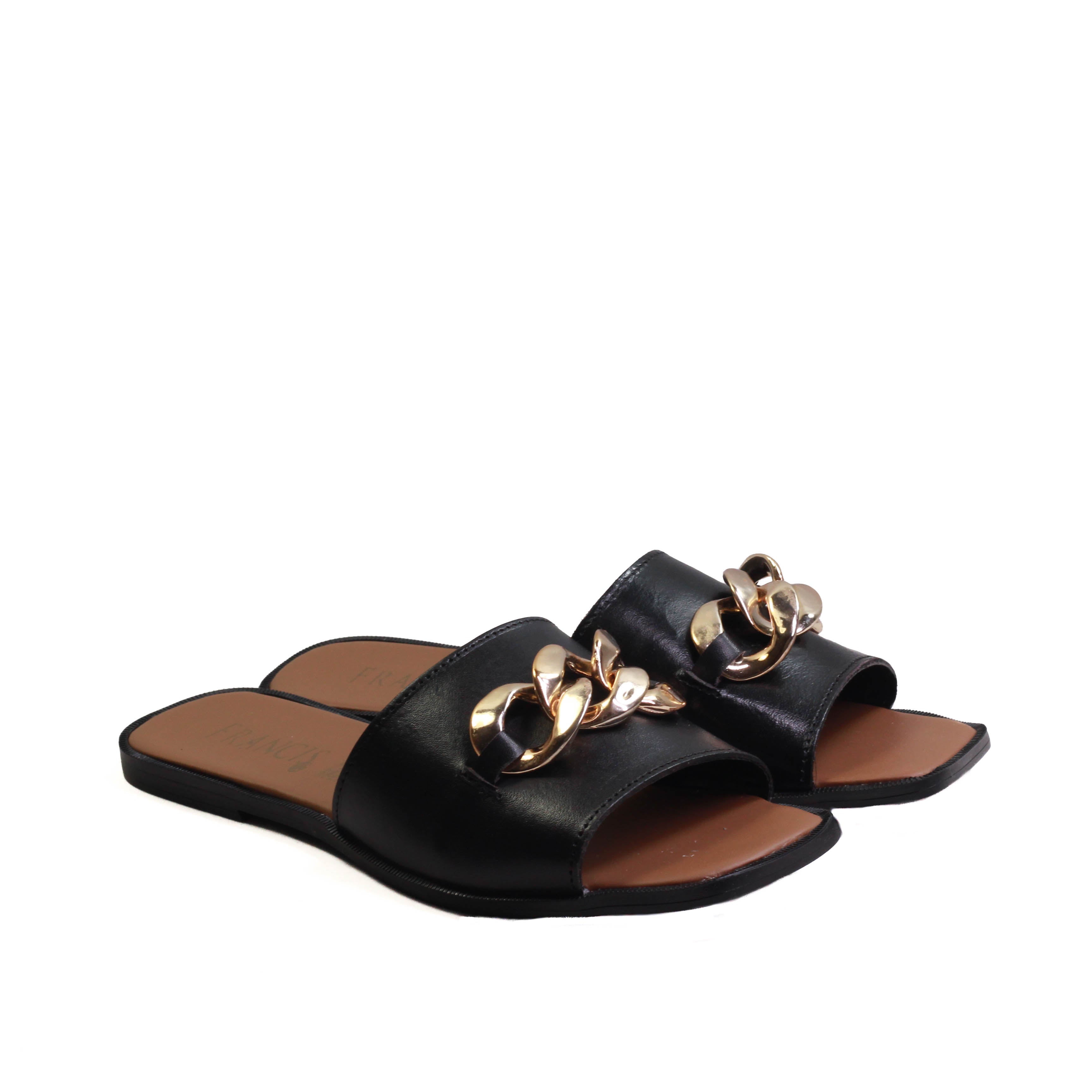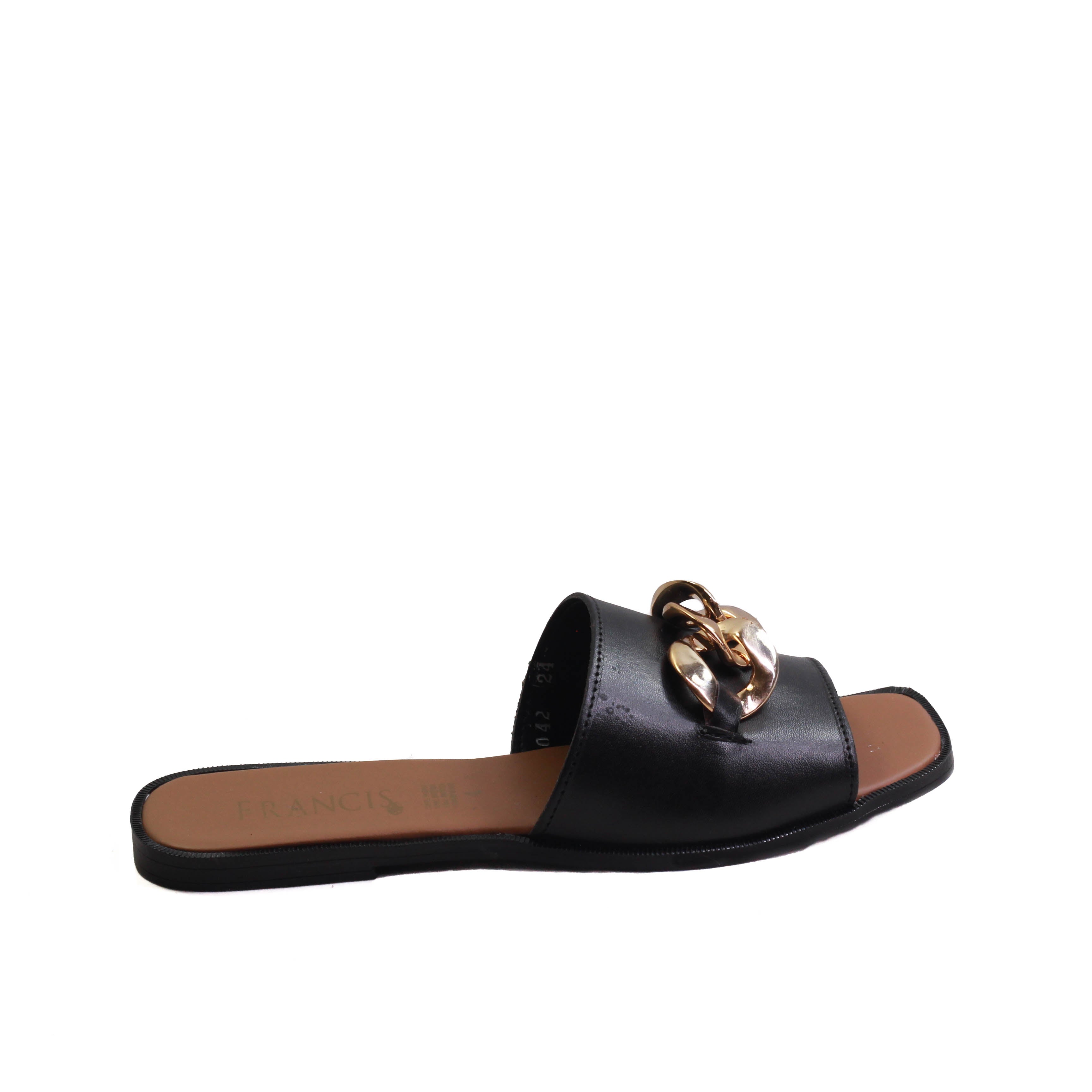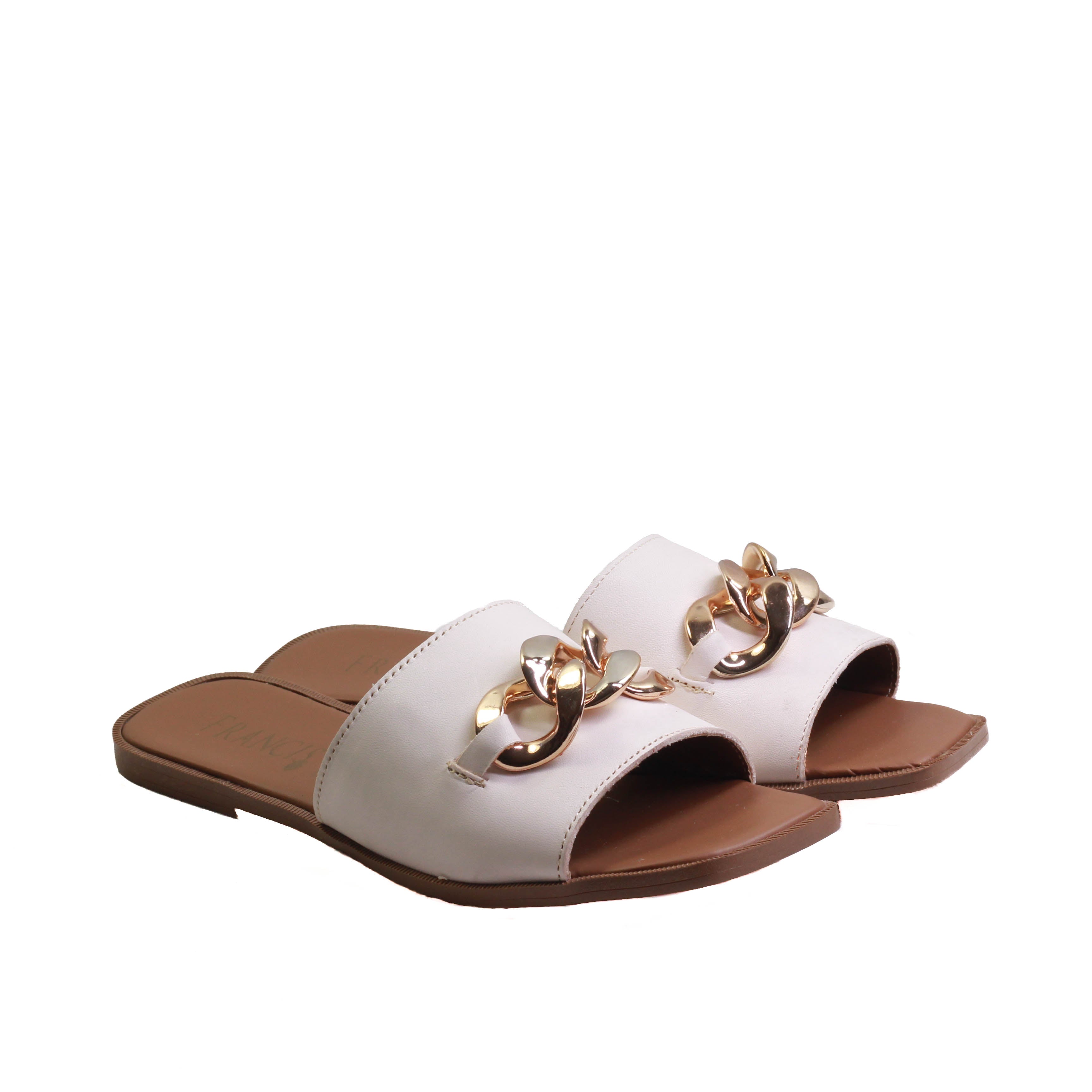 Sandalia para dama marca Francis en colores blanco y negro. Es una sandalia 100% de cuero con adorno frontal de eslabón dorado, cuenta con plantilla confortable para que tus caminatas sean agradables paso a paso.