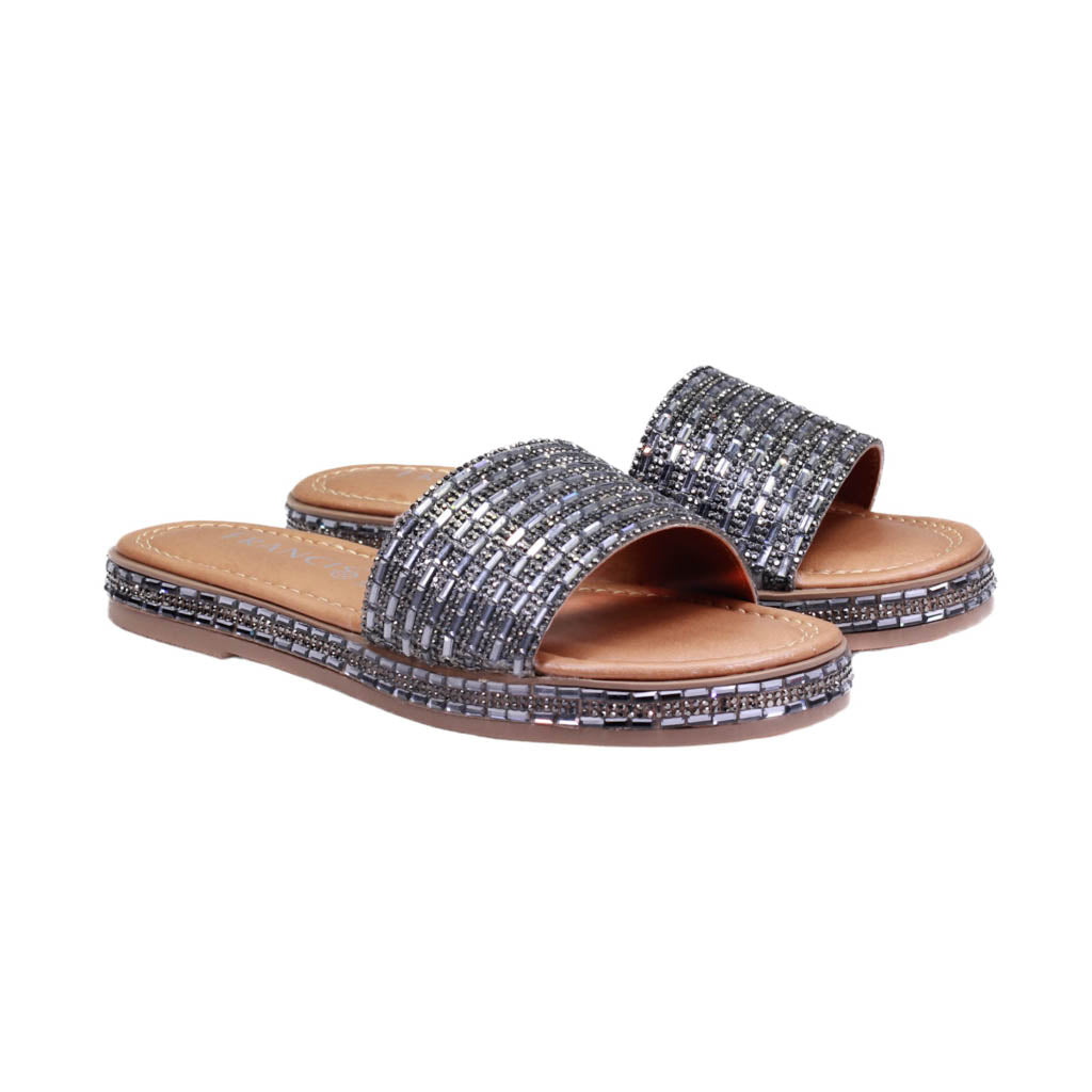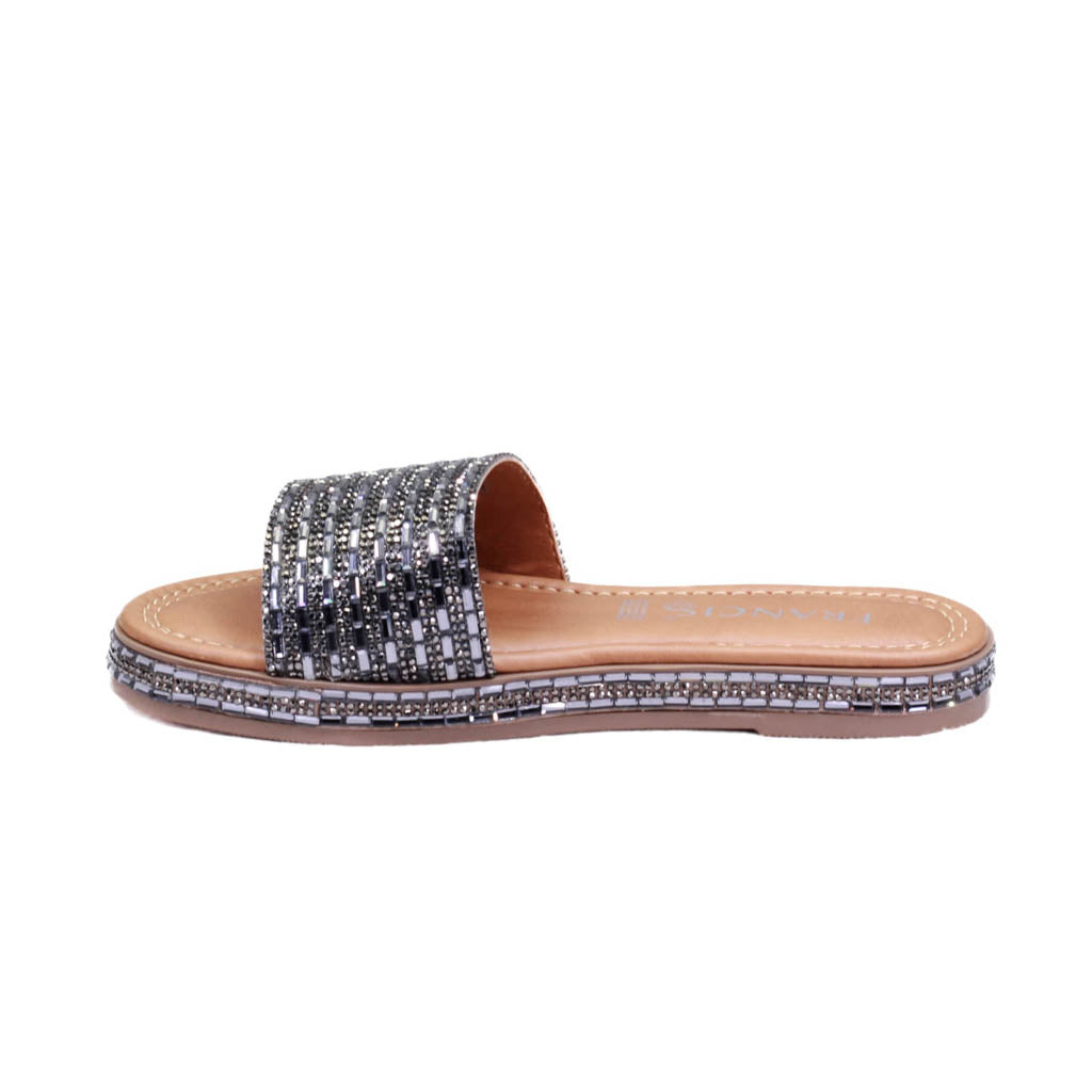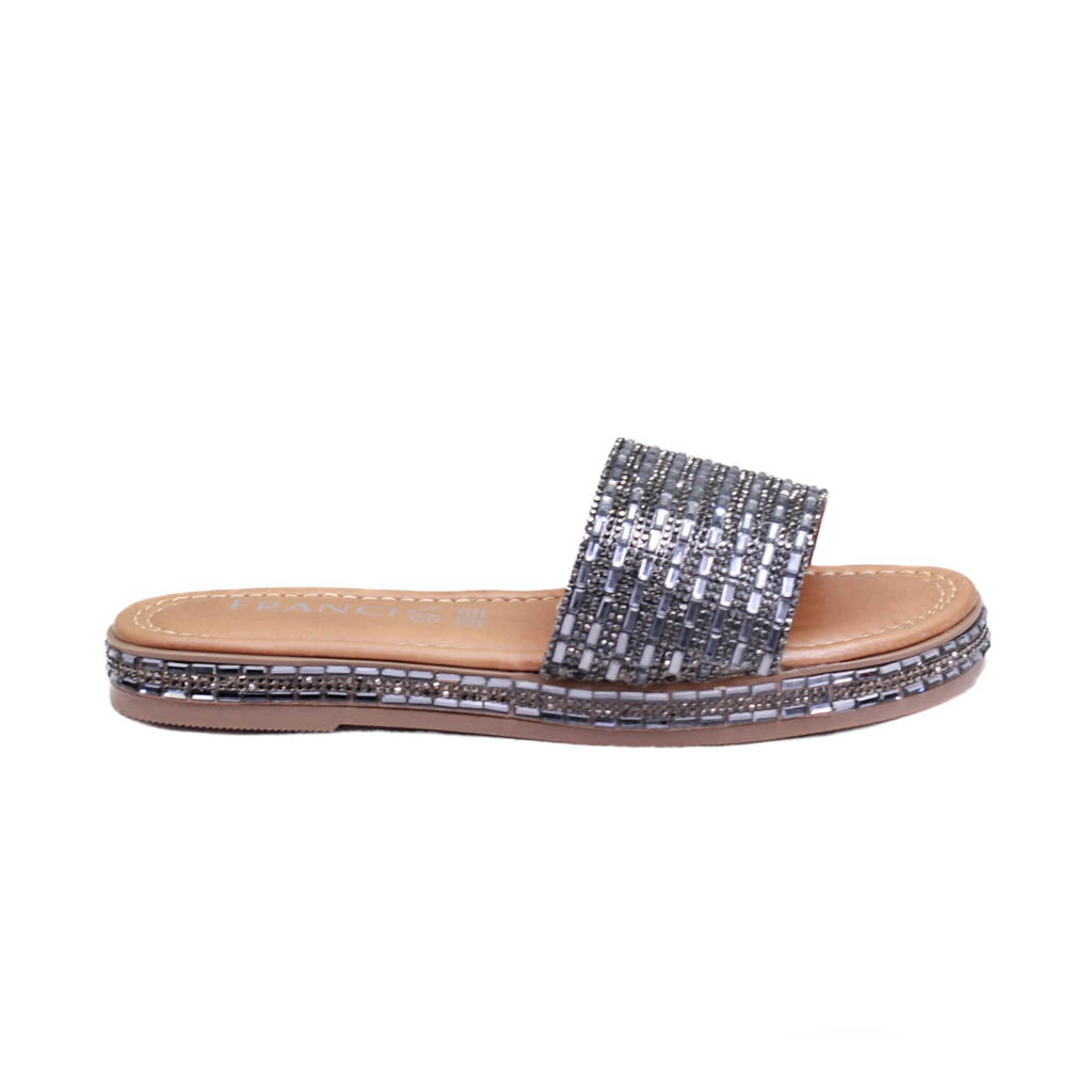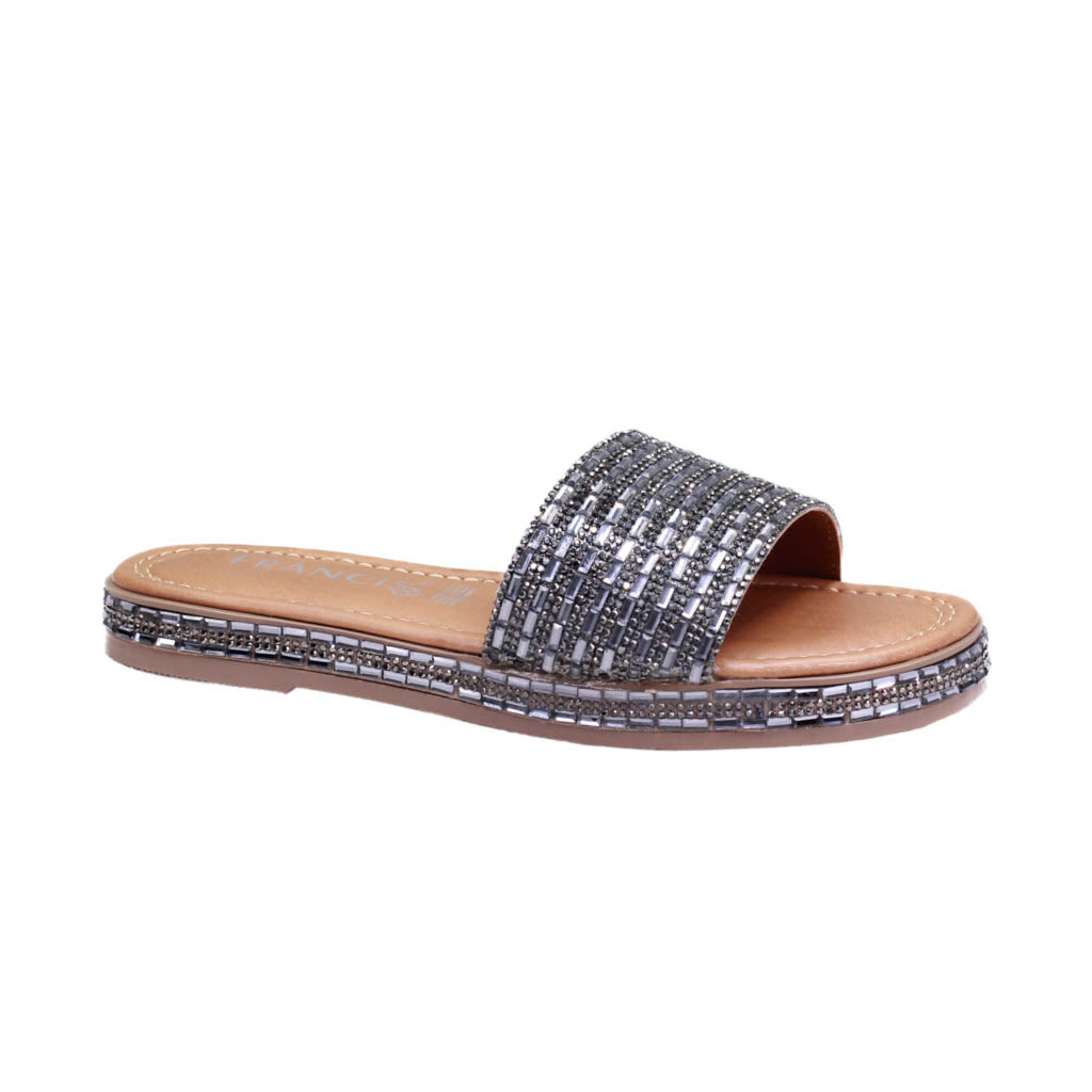 Sandalia para dama marca Francis en color grafito. Bonito diseño con pedrería en diferentes tonos, este modelo se destaca por su acabado en tono plateado combinado con estas llamativas piedras.