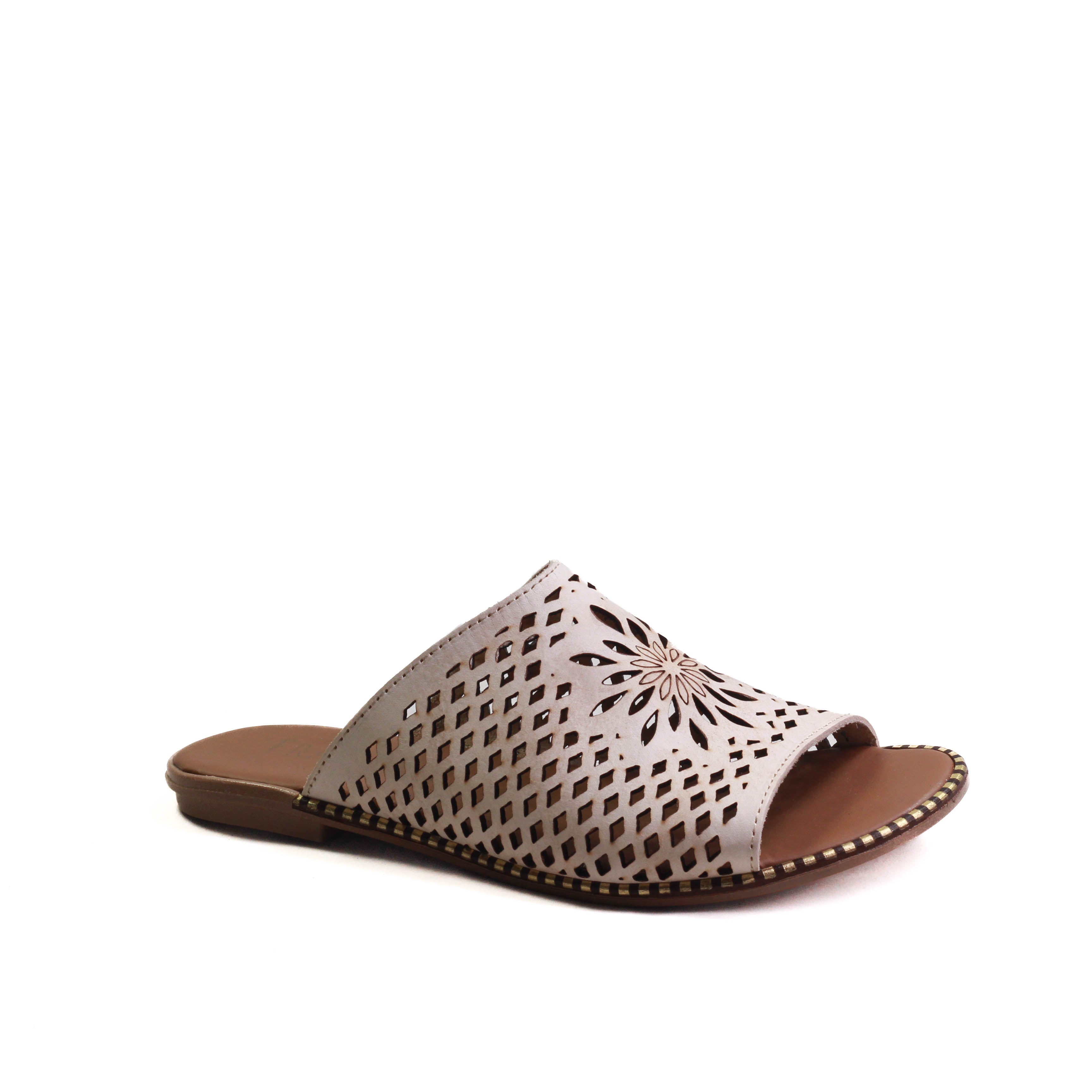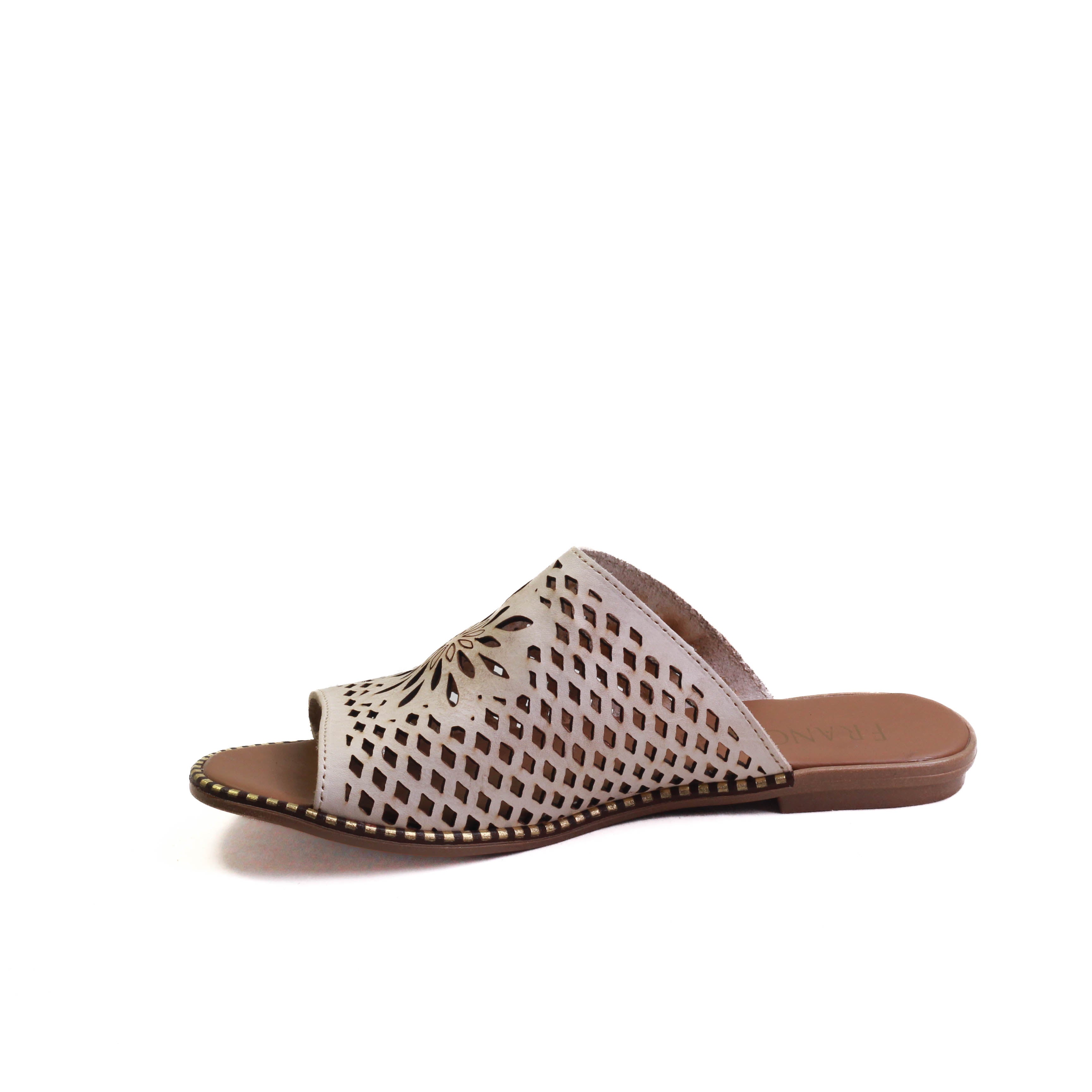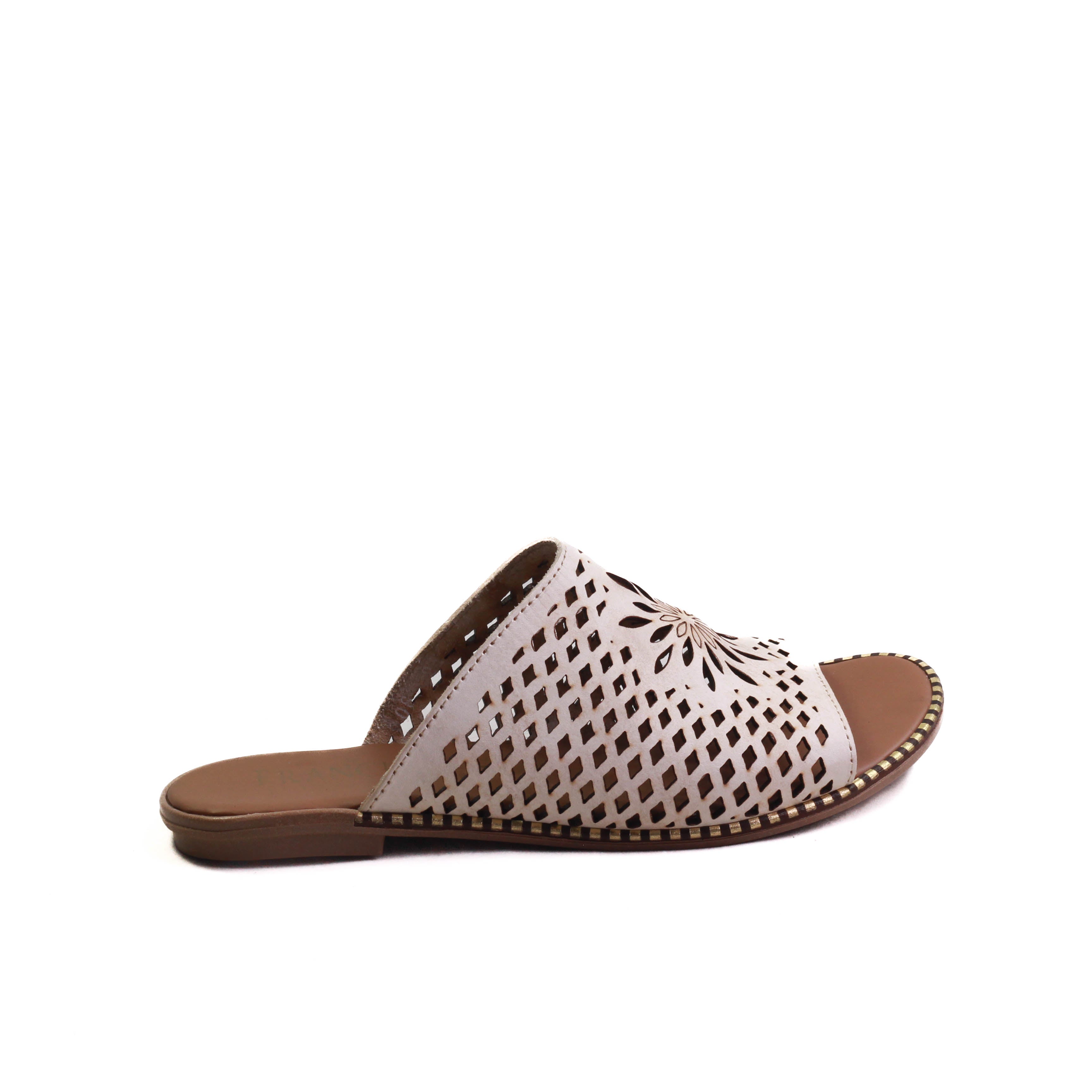Sandalia para dama marca Francis en colores blanco y tan. Es una sandalia 100% de cuero con diseño en perforaciones en el corte con una flor en la parte media, cuenta con plantilla confortable para que tus caminatas sean agradables paso a paso.