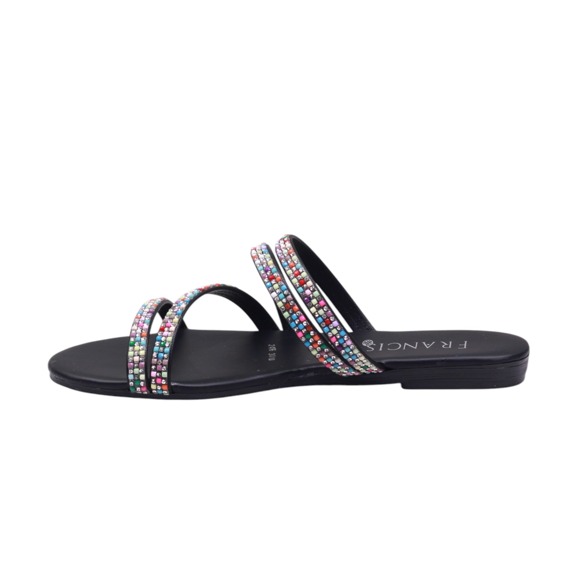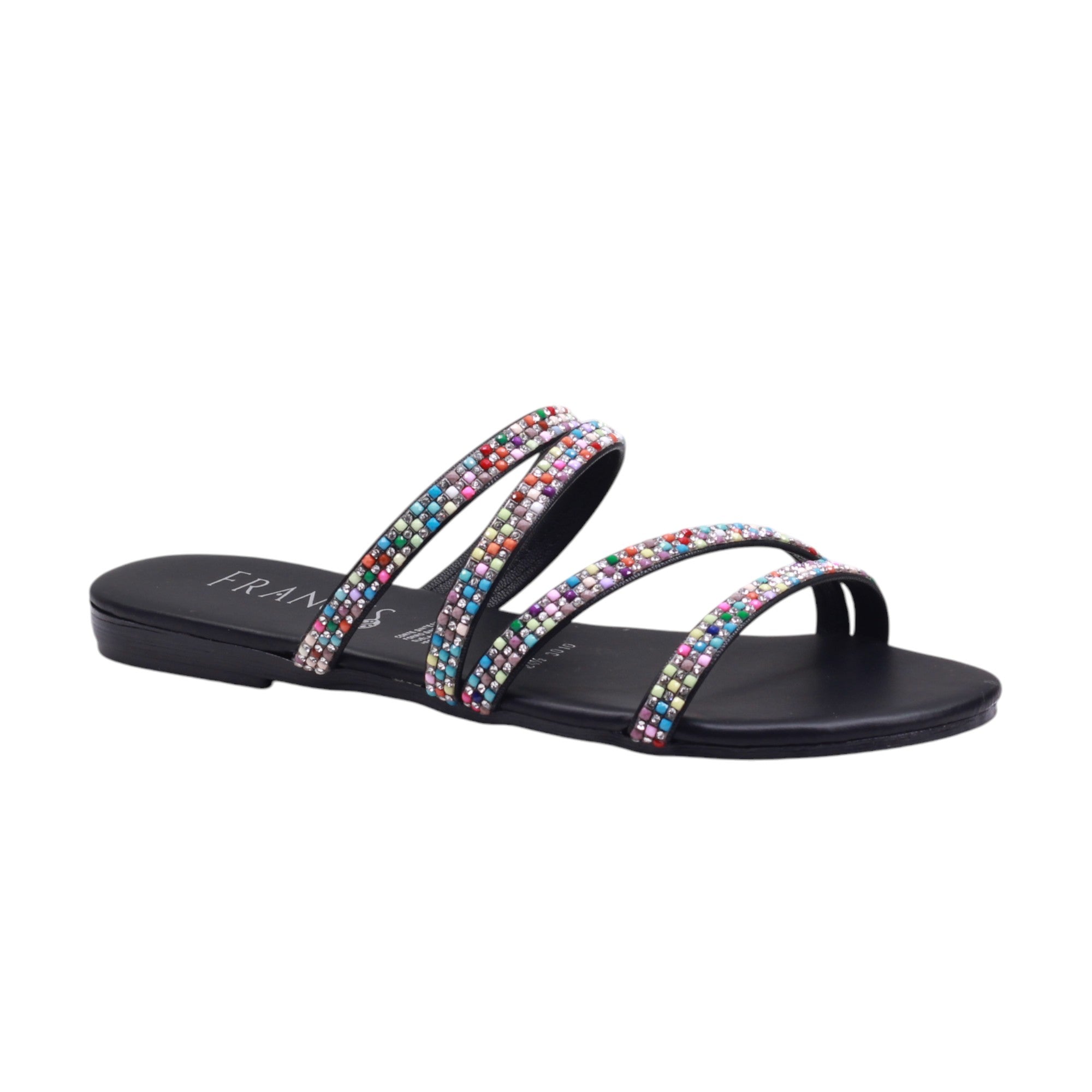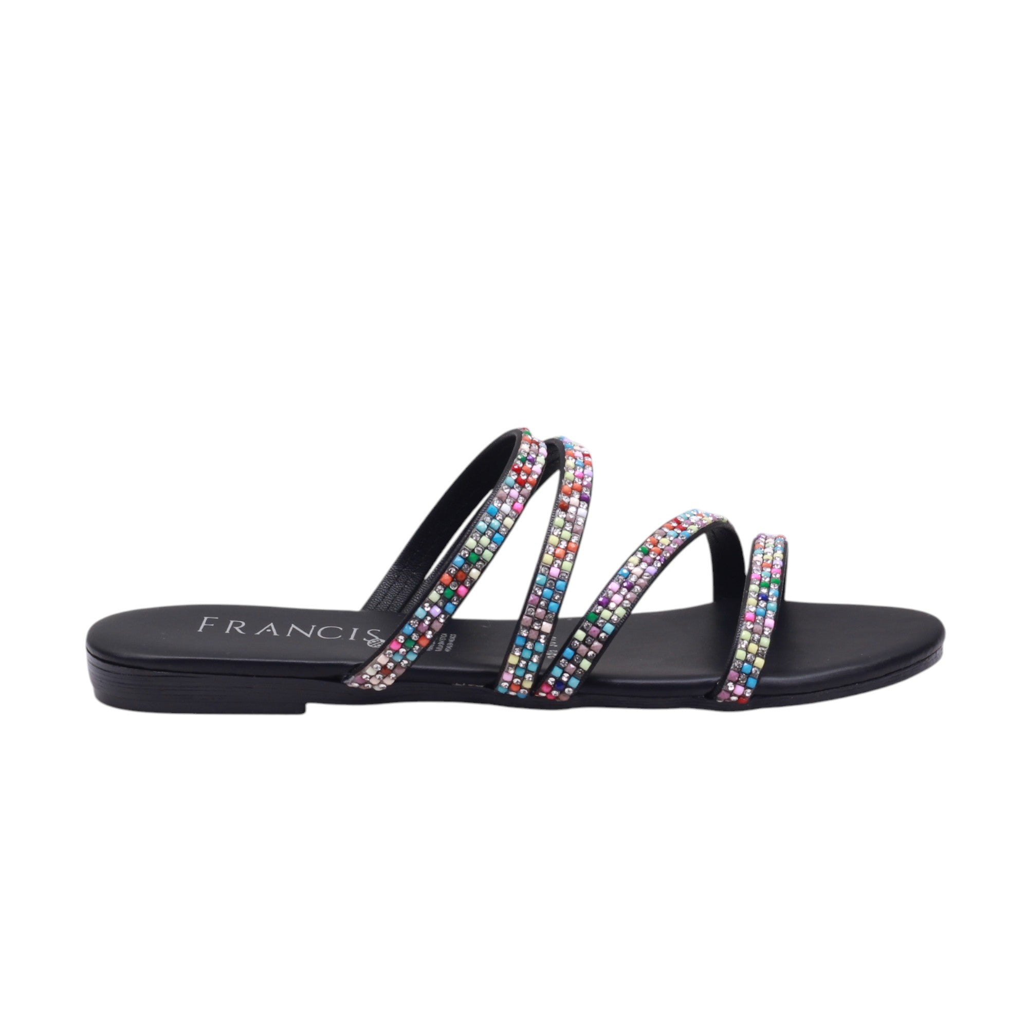 Sandalia para dama marca Francis en color negro. Este modelo cuenta con un elegante tacón bajo y cuatro tiras cubiertas en pedrería artificial de diferentes colores para darle un toque de glamour a tu look. Perfecto para cualquier ocasión, te brinda comodidad y estilo al mismo tiempo. No te pierdas la oportunidad de lucir sofisticada con este diseño único.