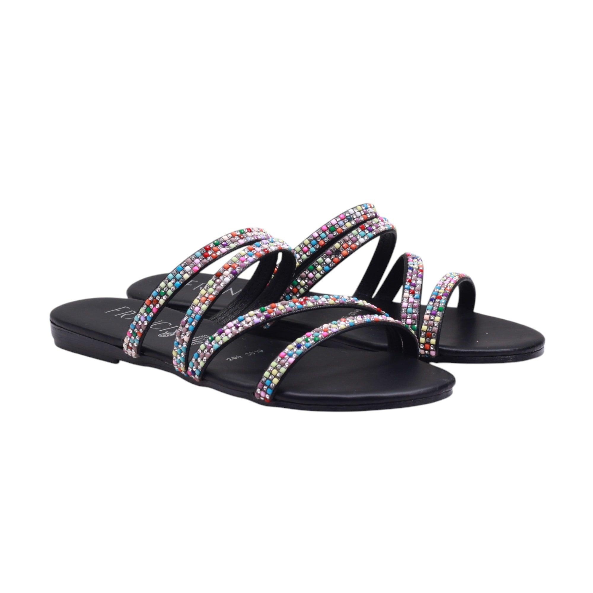Sandalia para dama de cuatro tiras con pedrería de colores artificial