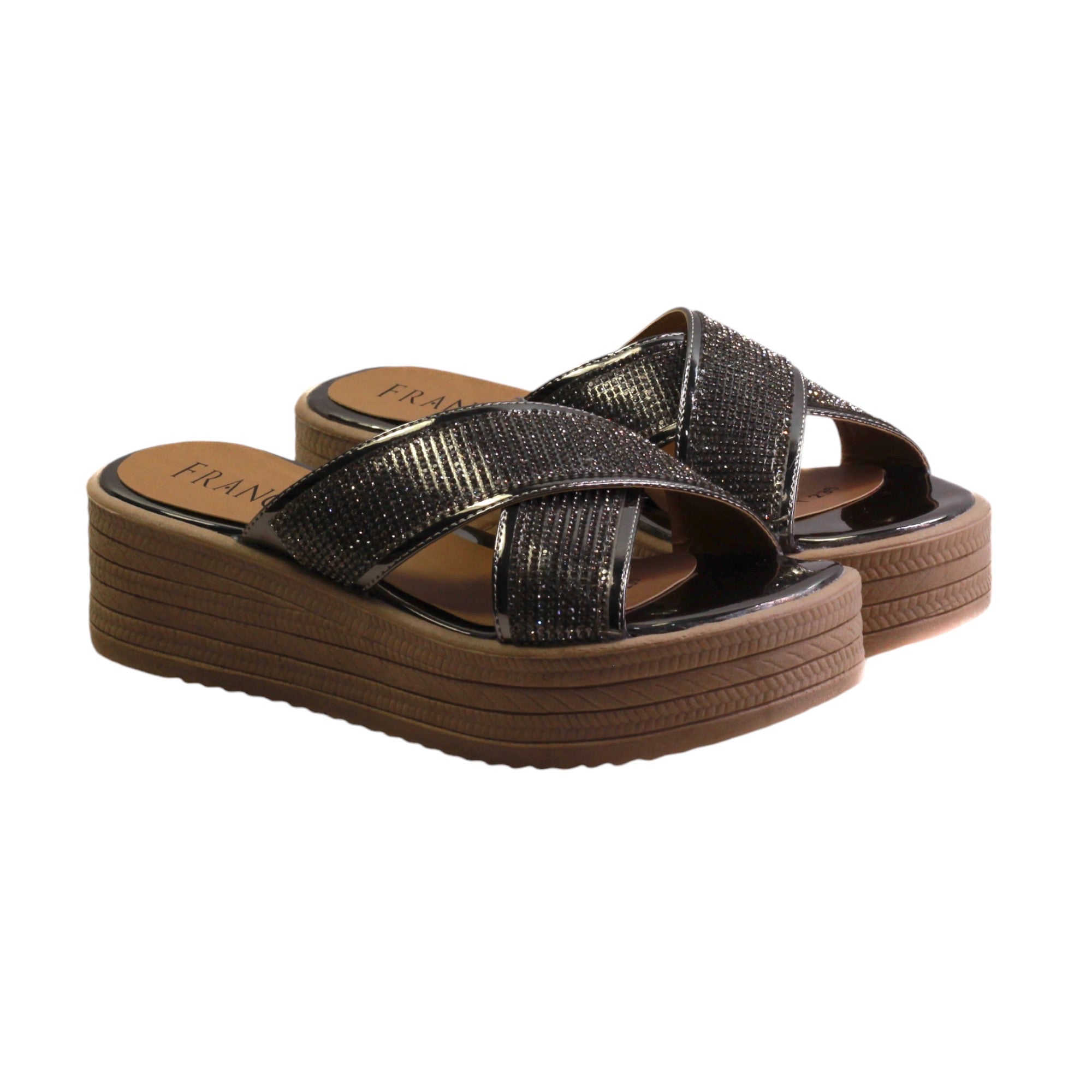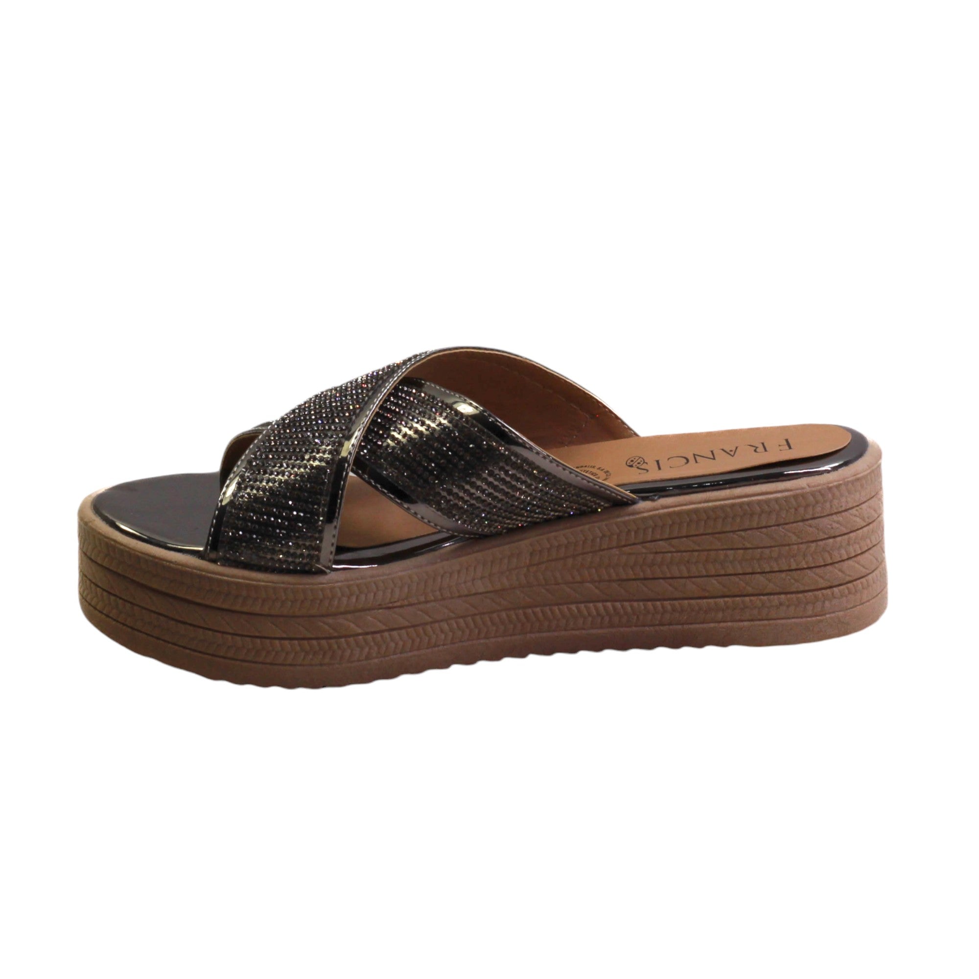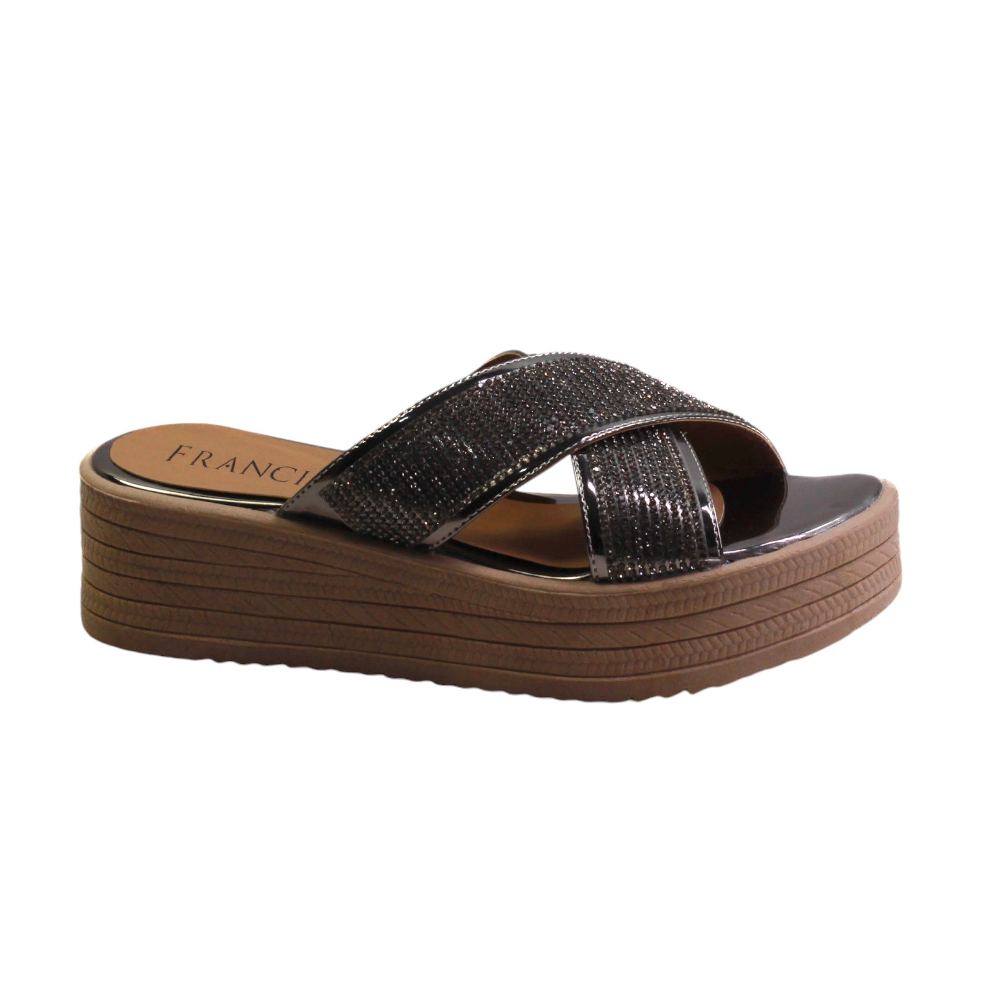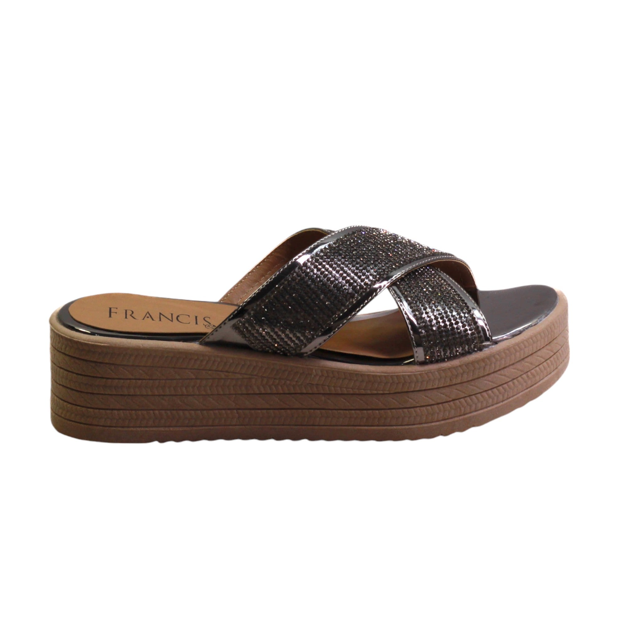 Sandalia para dama marca Francis en color Inox. Bonito modelo de plataforma plataforma gruesa alta para una mejor estabilidad al caminar. Doble tira en cruce con pedrería estampada..