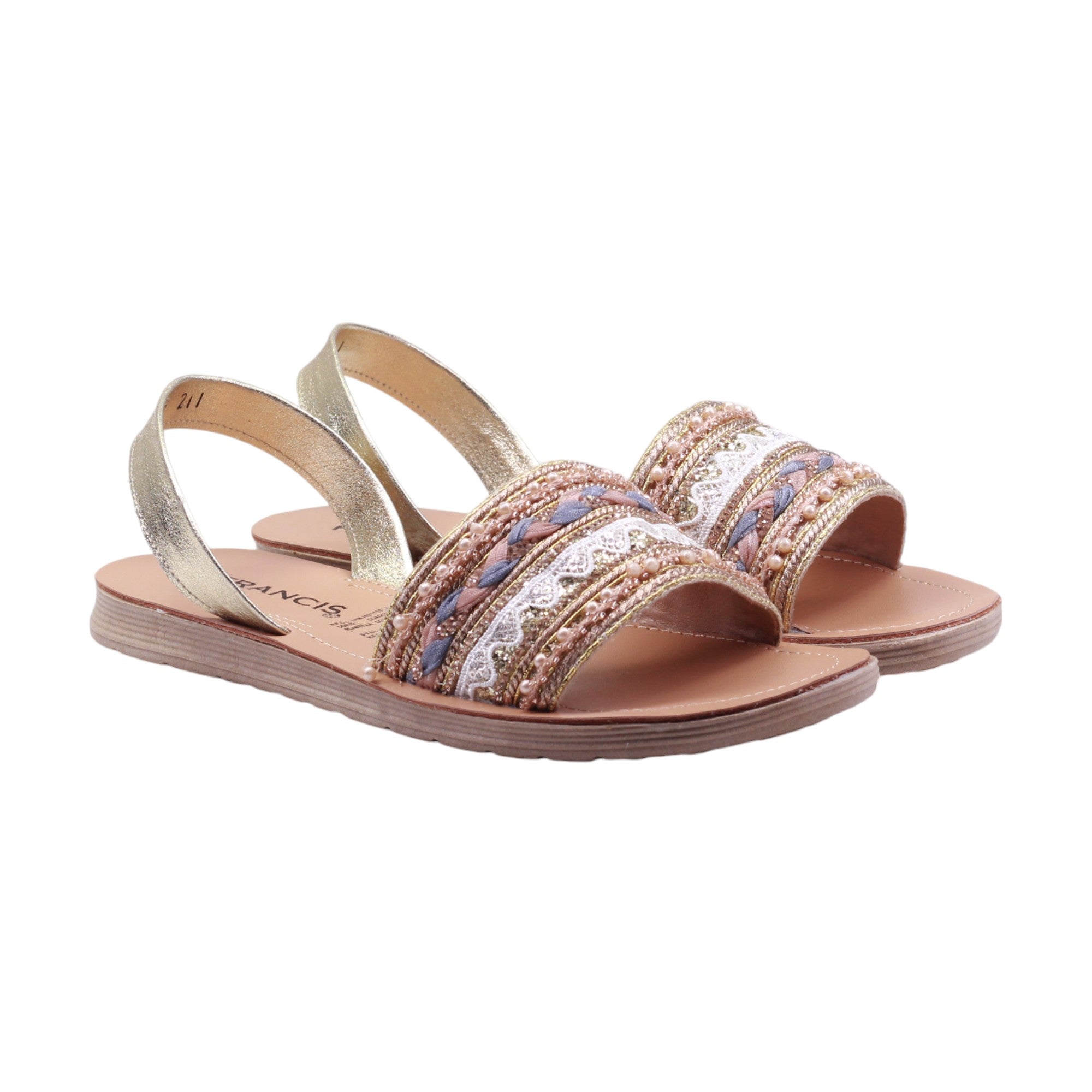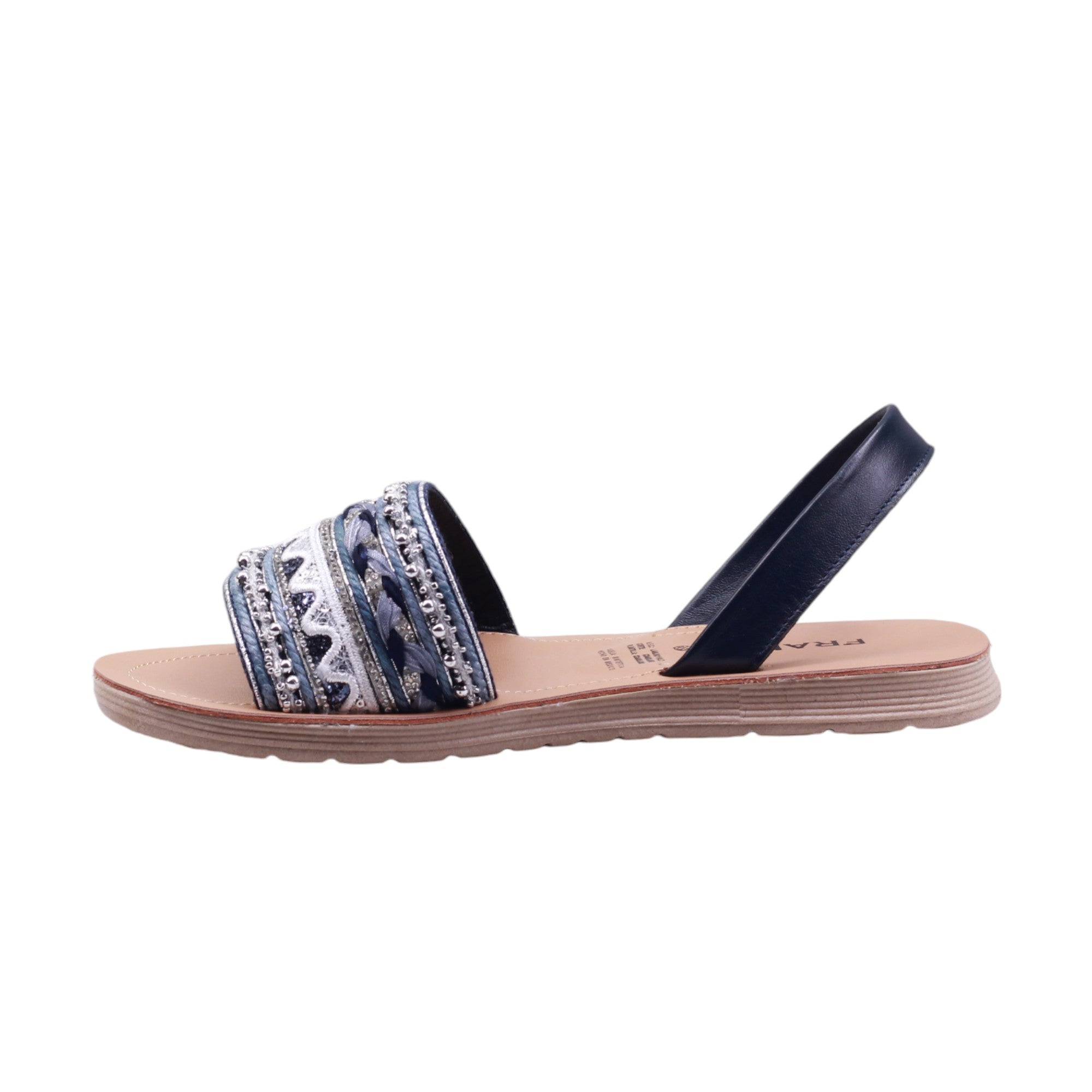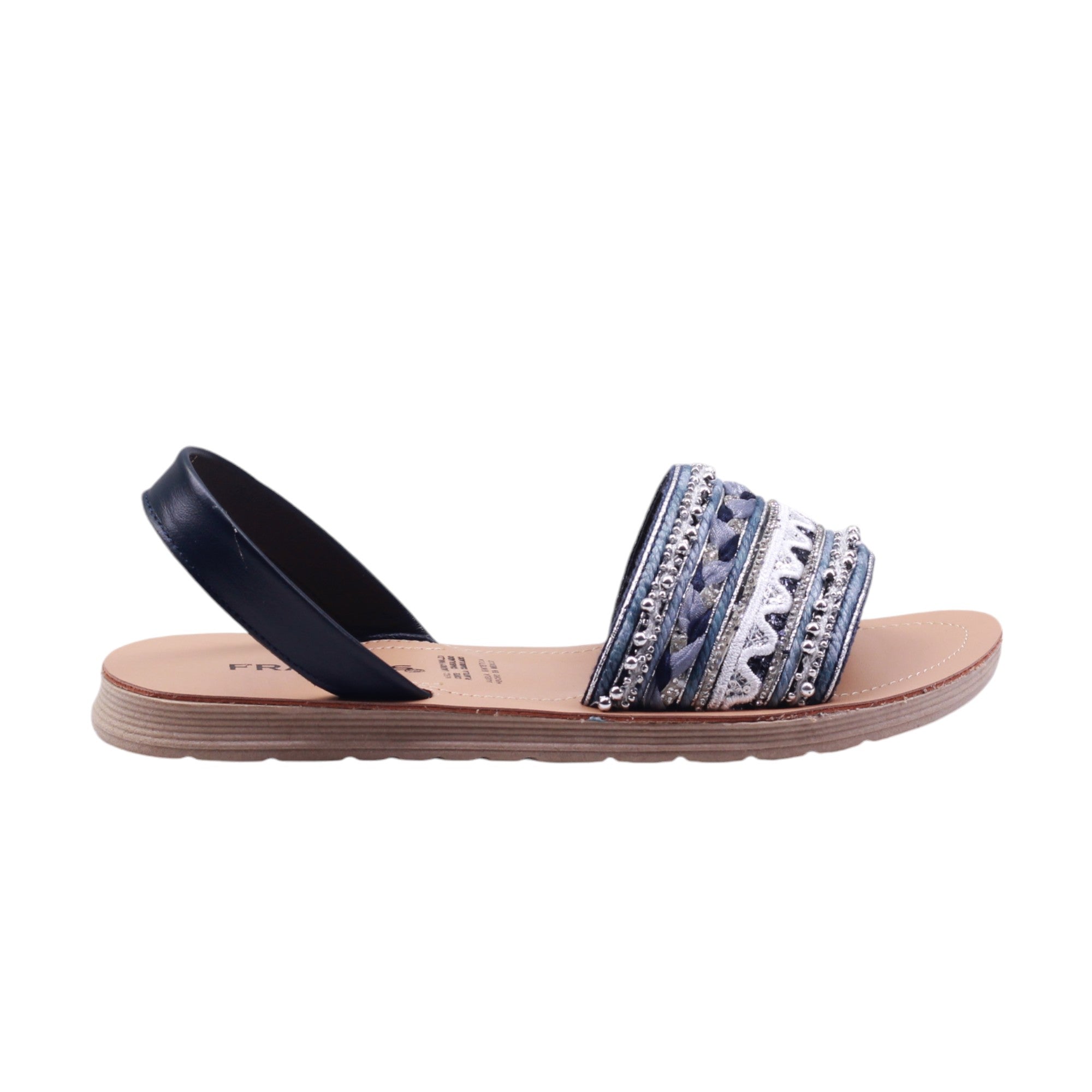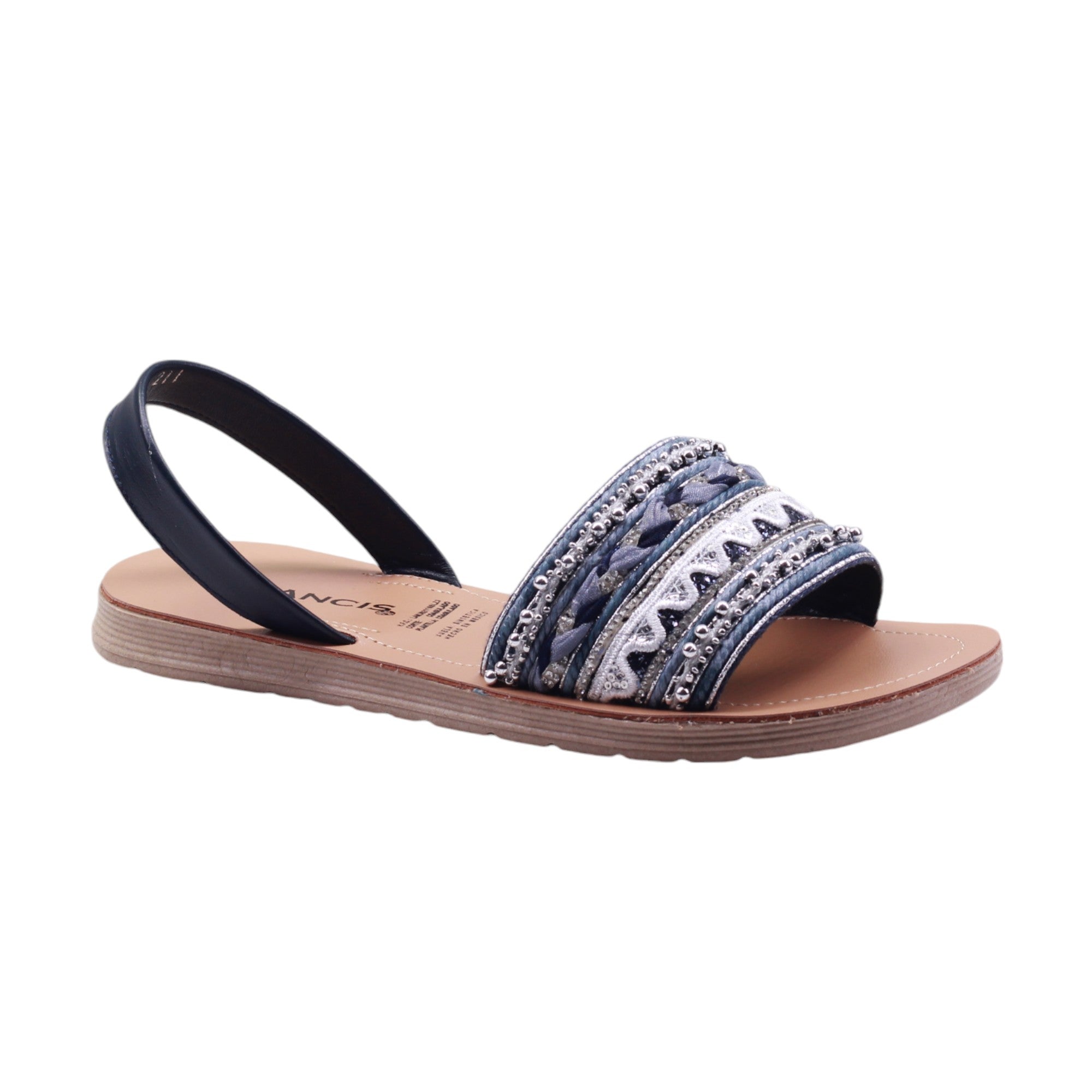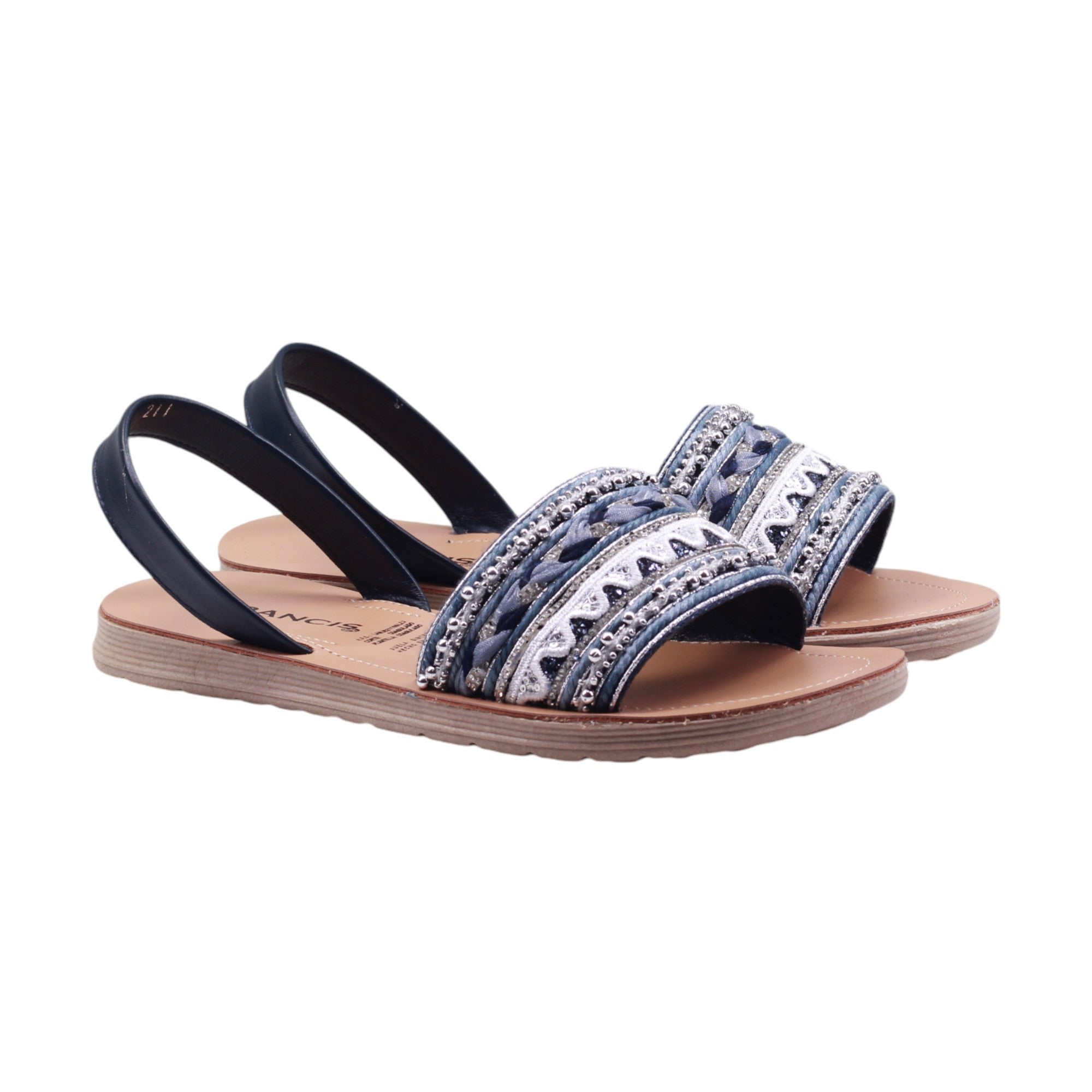 Sandalia para dama marca Francis en colores demin y maquillaje. Disfruta de un estilo versátil con nuestro modelo de tira trasera, con detalles de perlas y tejido. Perfecto para ocasiones casuales o para relajarte en casa con comodidad y elegancia. ¡Haz una declaración de moda con este diseño exclusivo!