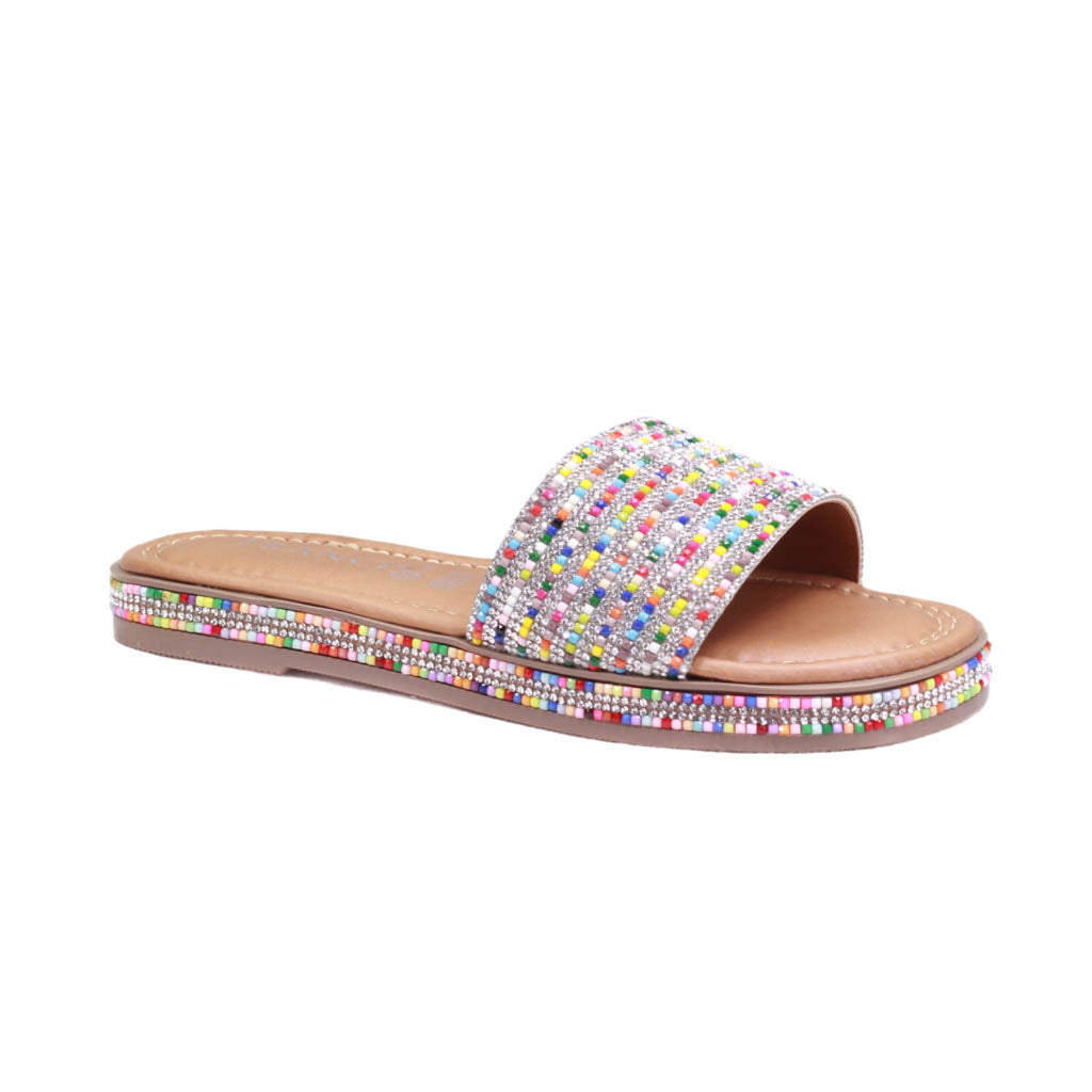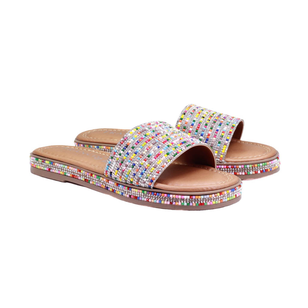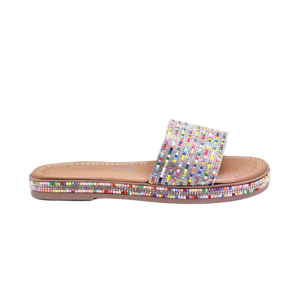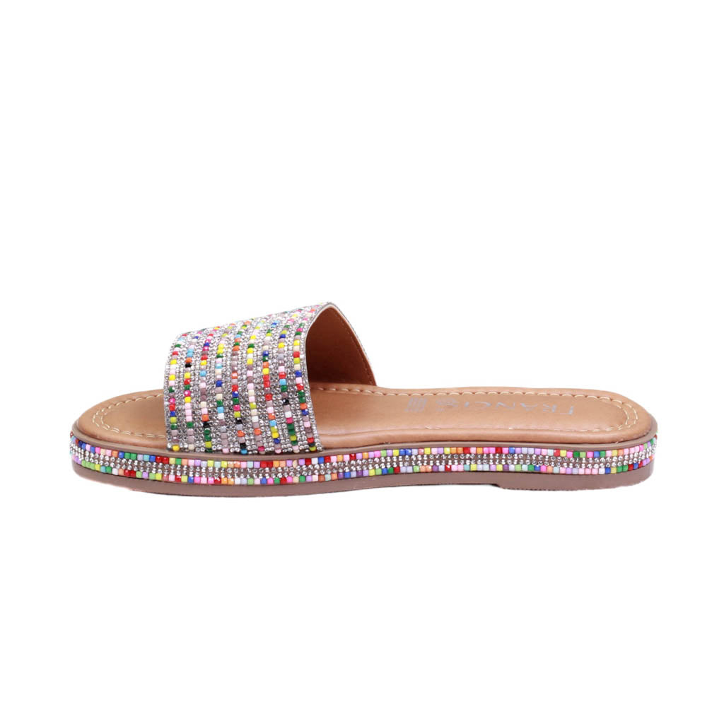 Sandalia para dama marca Francis en color plata multicolor. Bonito diseño con pedrería en diferentes tonos, este modelo se destaca por su acabado en tono plateado combinado con estas llamativas piedras.