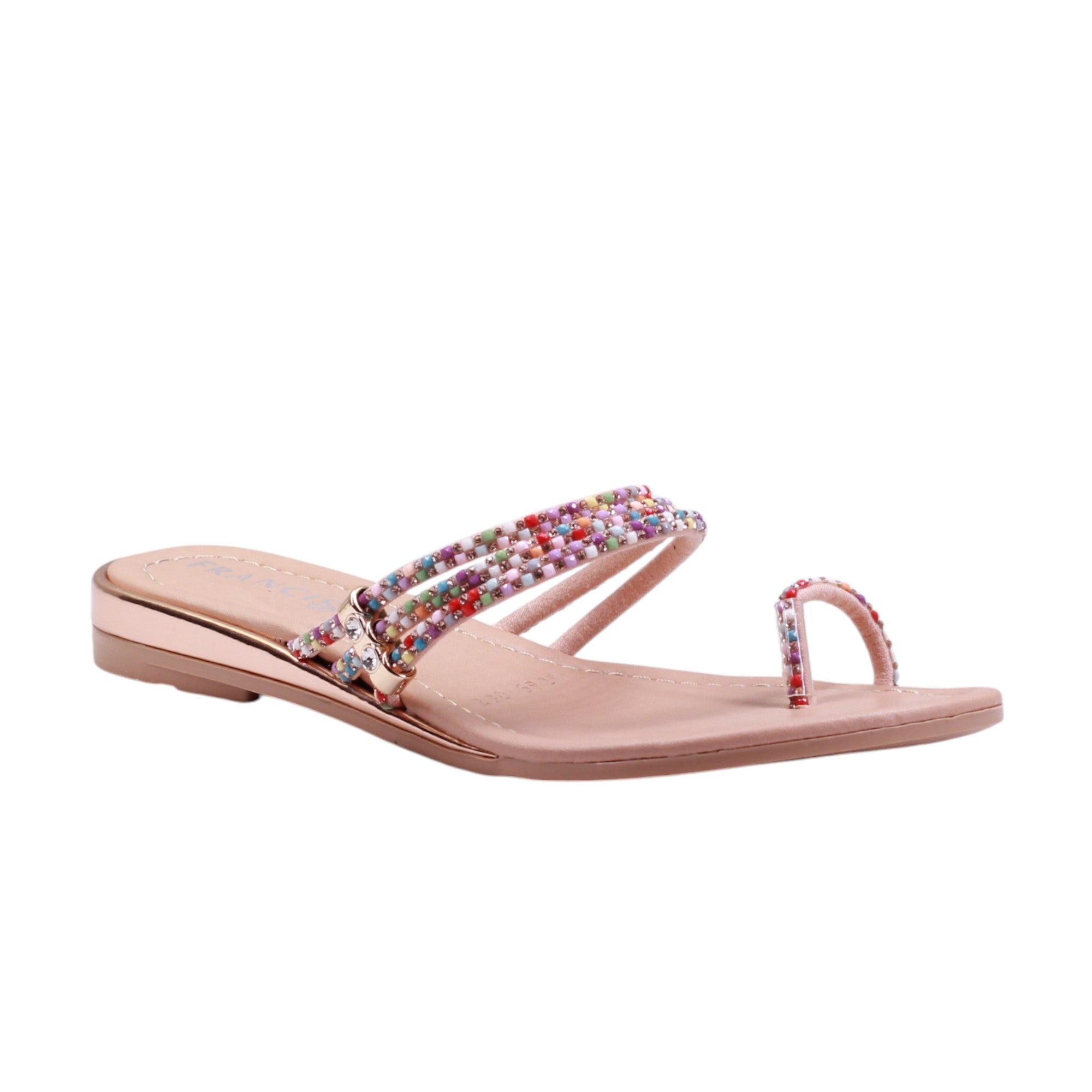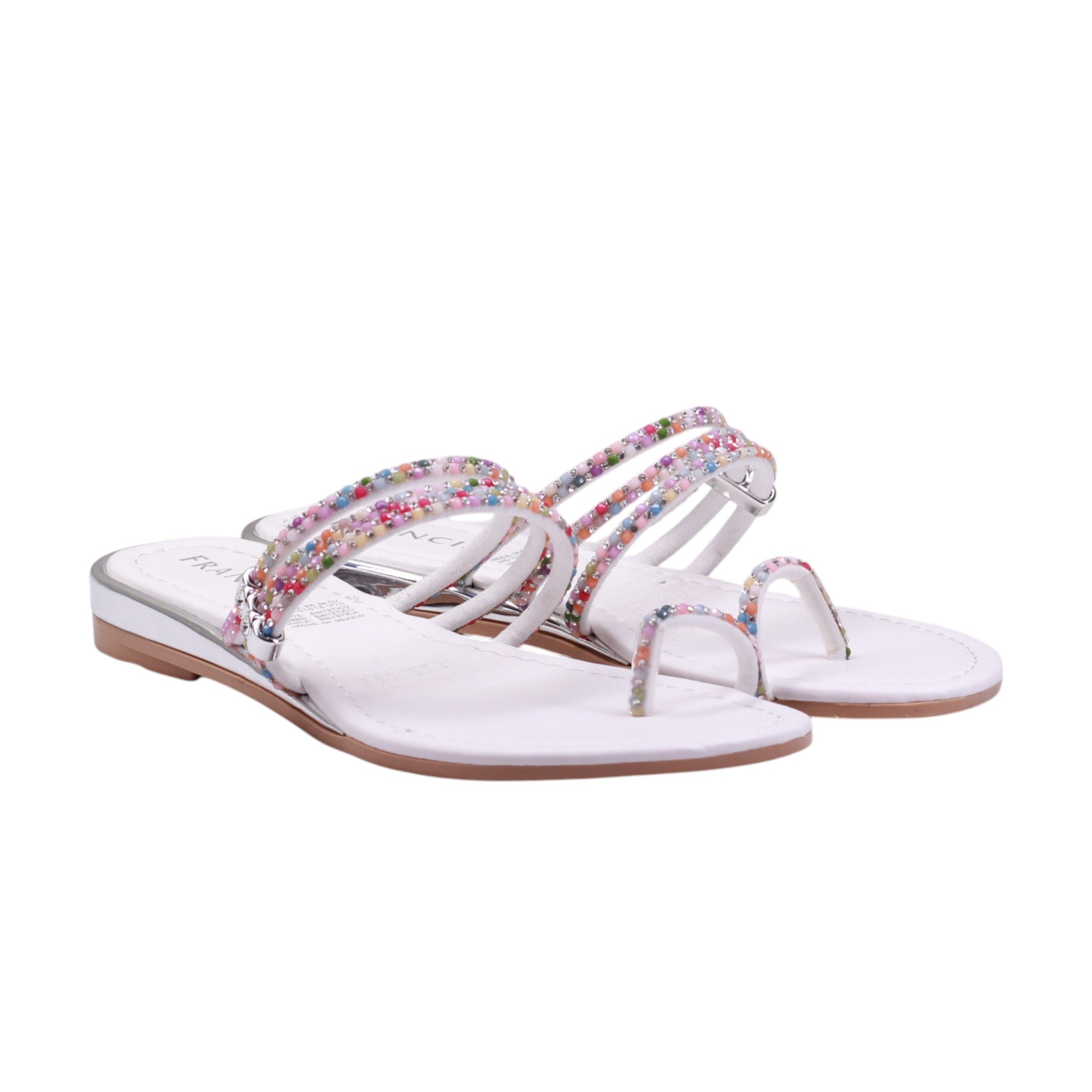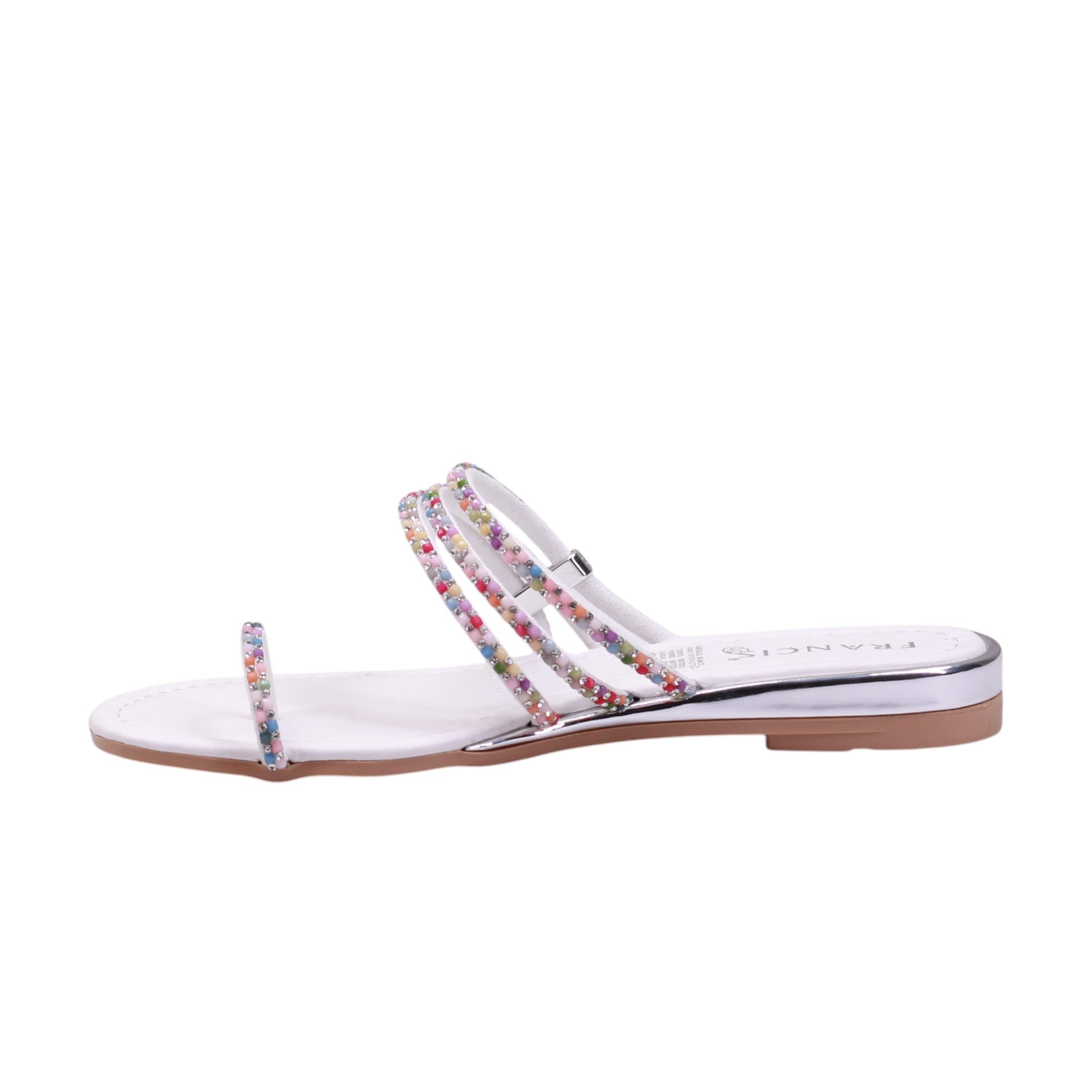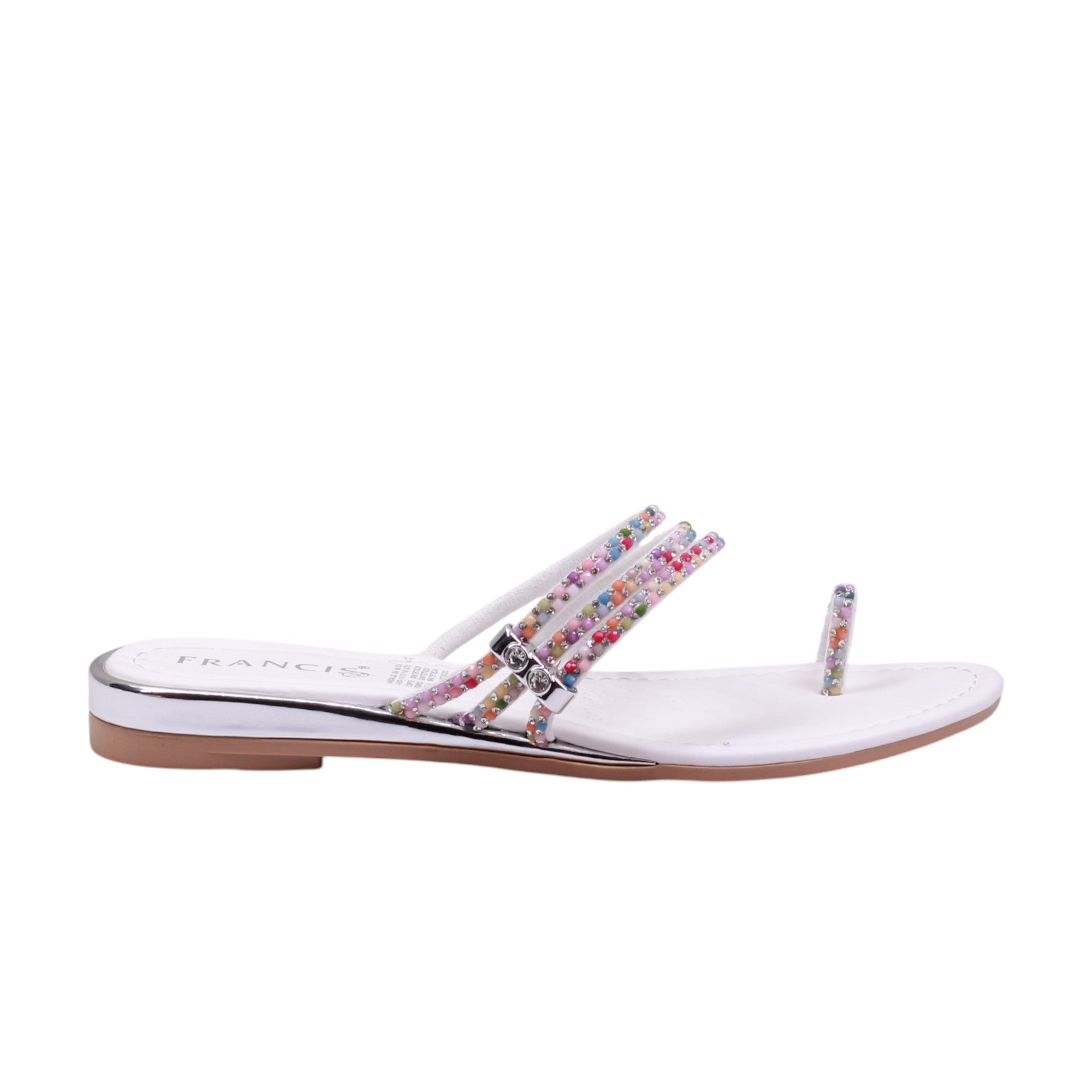 Calzado para dama marca Francisco es colores blanco y maquillaje. Dale un toque divertido a tu look con esta sandalia plana de diseño moderno. Elaborada con piel sintética blanca, cuenta con tres tiras delgadas decoradas con cuentas multicolor que le aportan un efecto vibrante y alegre. El diseño incluye una tira separadora para el dedo, ofreciendo mayor seguridad al caminar. Su suela plana con altura de 2.00 cm proporciona confort en cada paso.