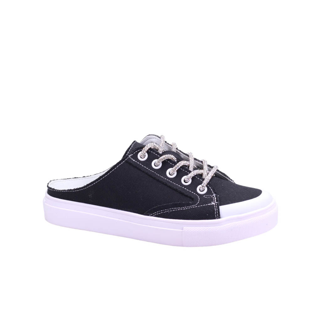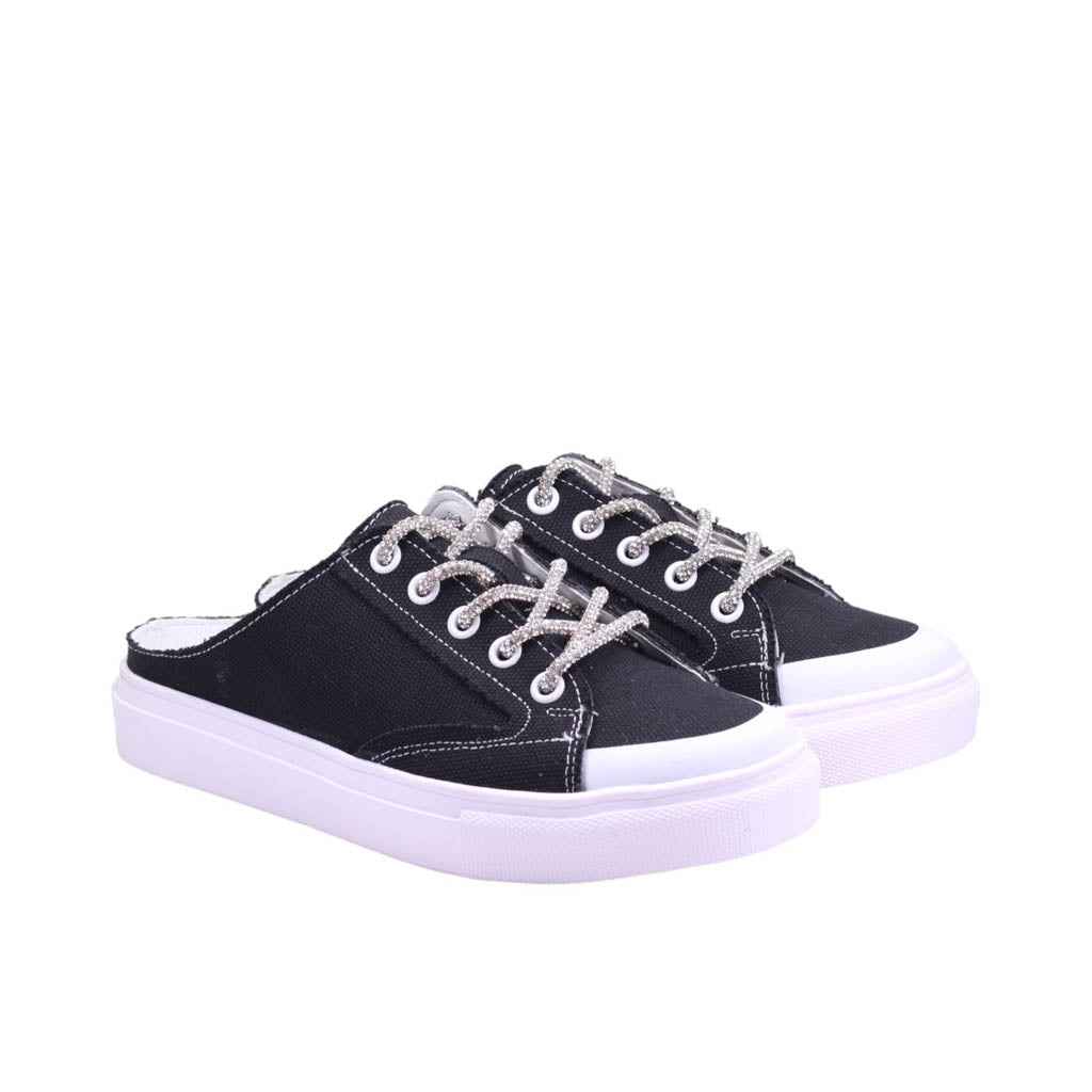 Tenis para dama destalonados con agujetas cubiertas en pedrería