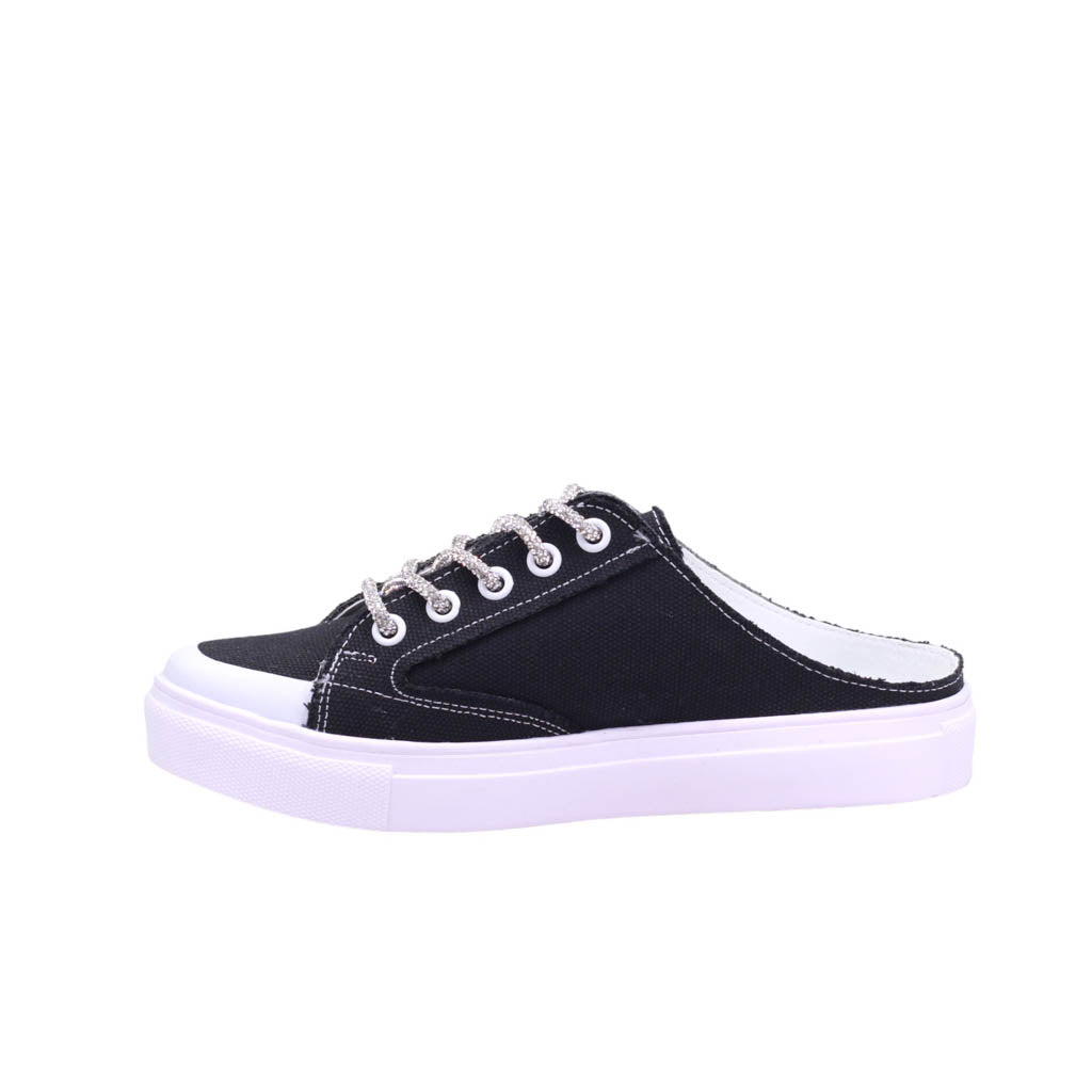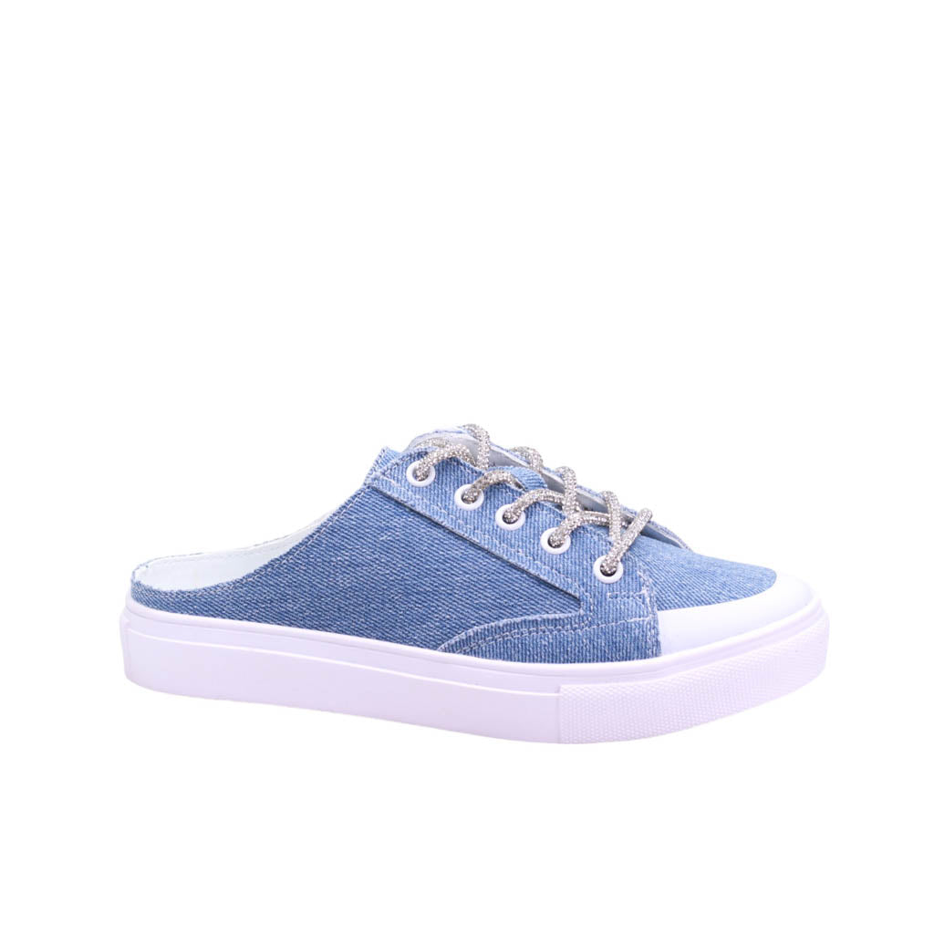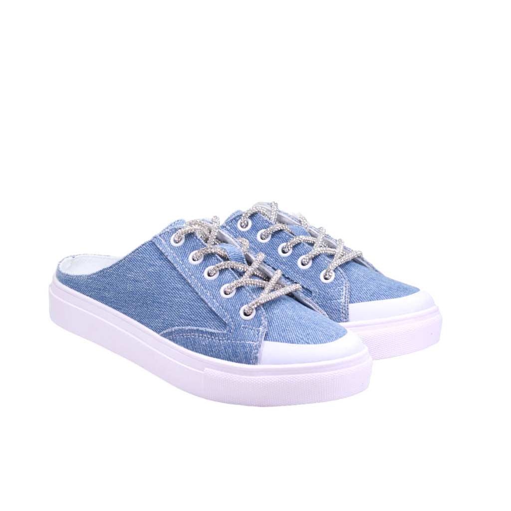 Tenis para dama en colores cielo y negro. Disfruta de la comodidad y estilo con nuestros tenis destalonados para dama. Su plataforma de 3.00 centímetros te brinda altura sin sacrificar comodidad. Además, su elegante acabado en mezclilla y agujetas tubulares cubiertas en pedrería te harán lucir a la moda en cualquier ocasión.