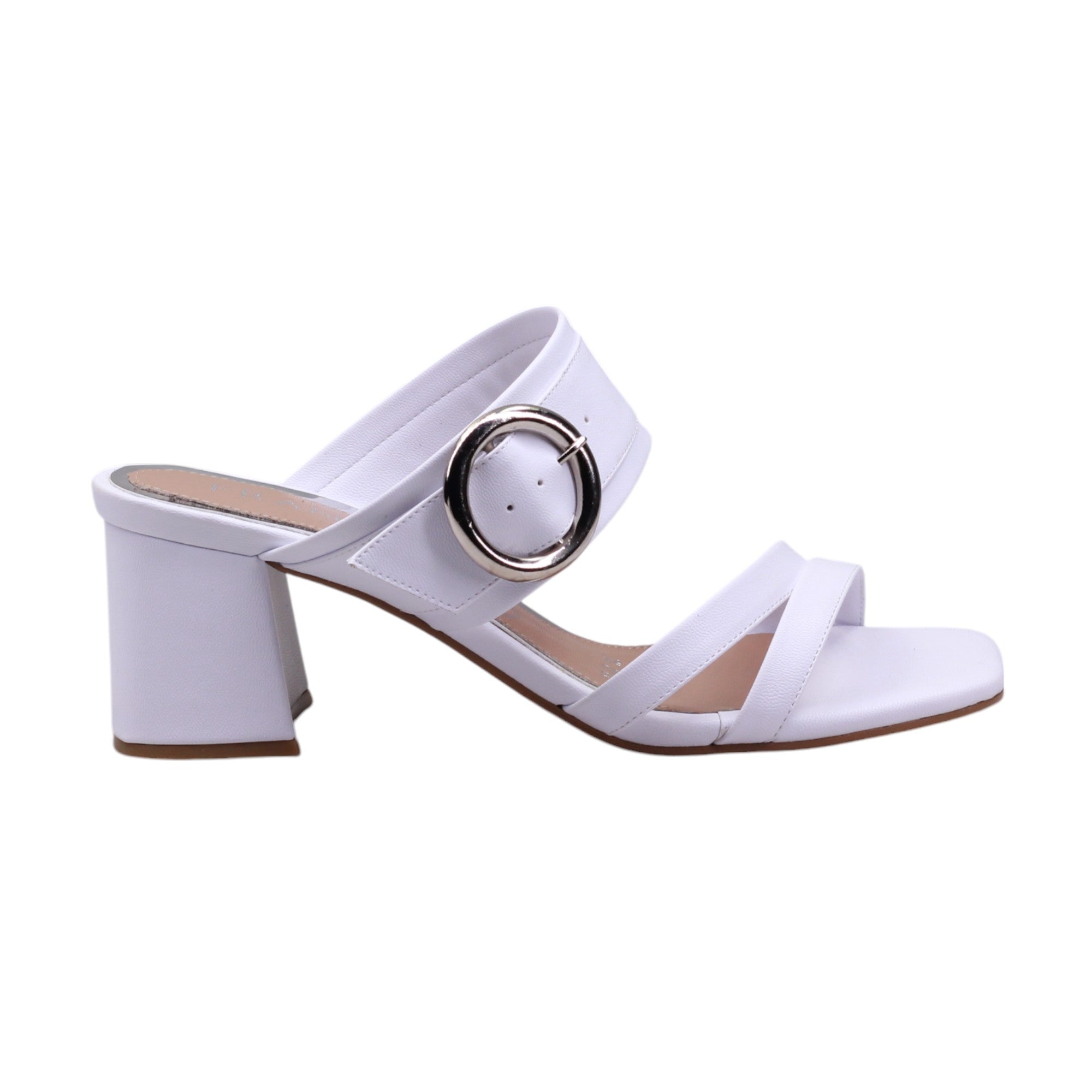 Zapatilla para dama marca Francis en colores blanco y negro. Este modelo de tacón ancho de 5.00 cm presenta una hebilla redonda grande y una doble tira delgada en la parte delantera para mayor comodidad y estilo. Ideal para eventos formales, proporcionando un equilibrio perfecto entre altura y estabilidad.