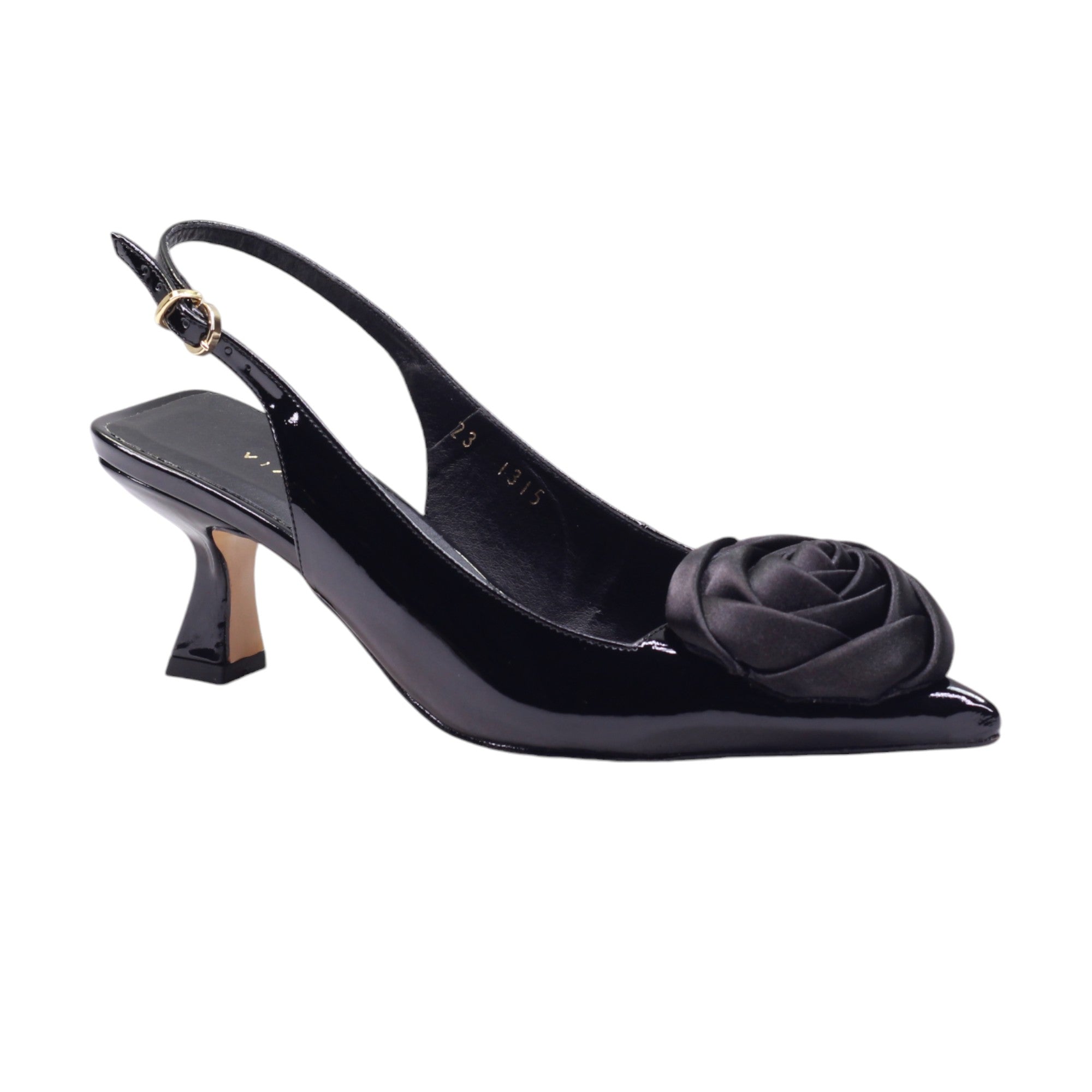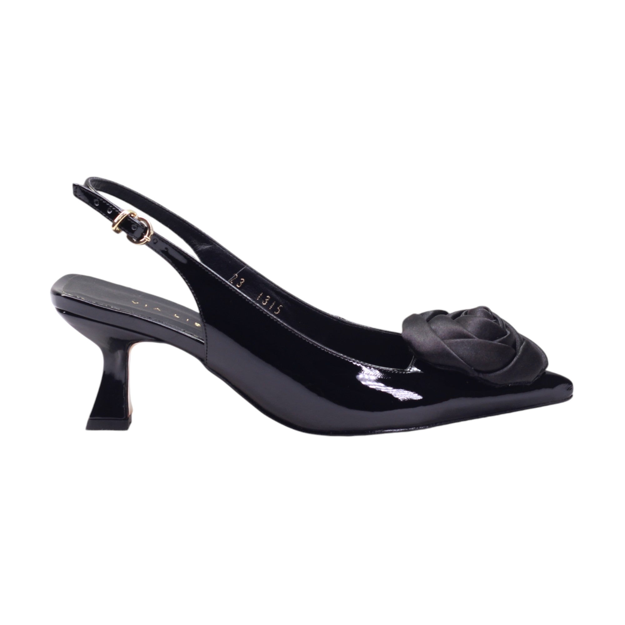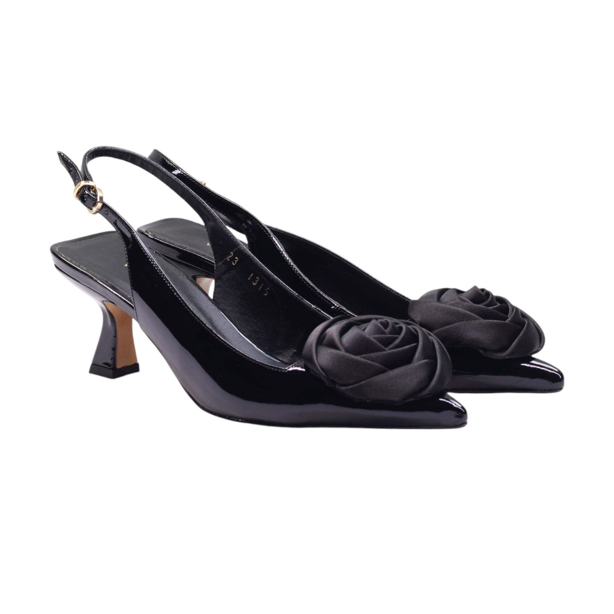 Zapatilla para dama marca Francis en colores Maquillaje y negro charol. Este modelo destalonado es una excelente opción para cualquier ocasión. Con su tira delgada y hebilla, brinda un ajuste cómodo y seguro. Además, su tacón de 5.5 cm te da la altura perfecta y su corte adornado con una rosa grande agrega un toque elegante y sofisticado.