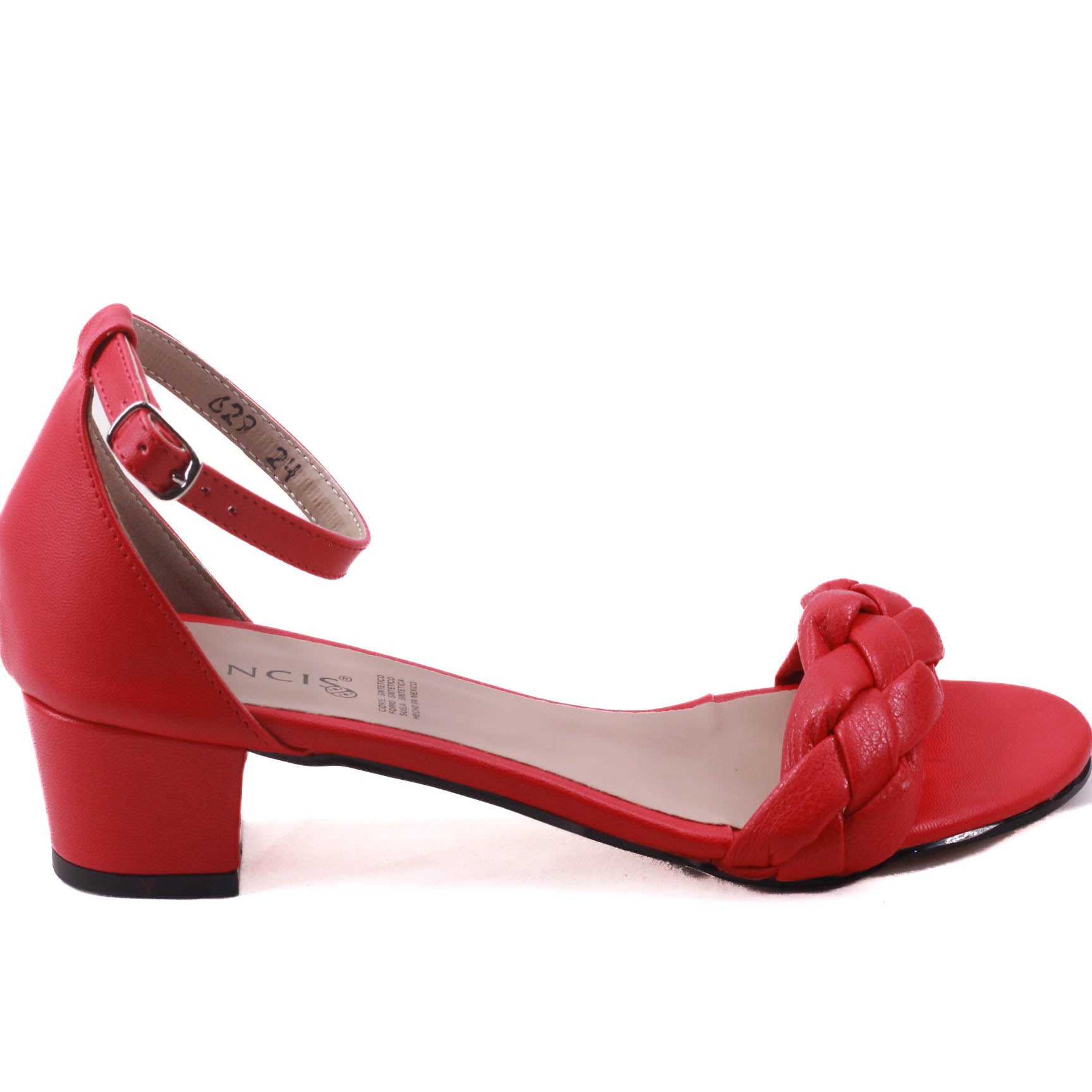 Zapatilla para dama con tacón cuadrado bajo y tira trenzada al frente.
