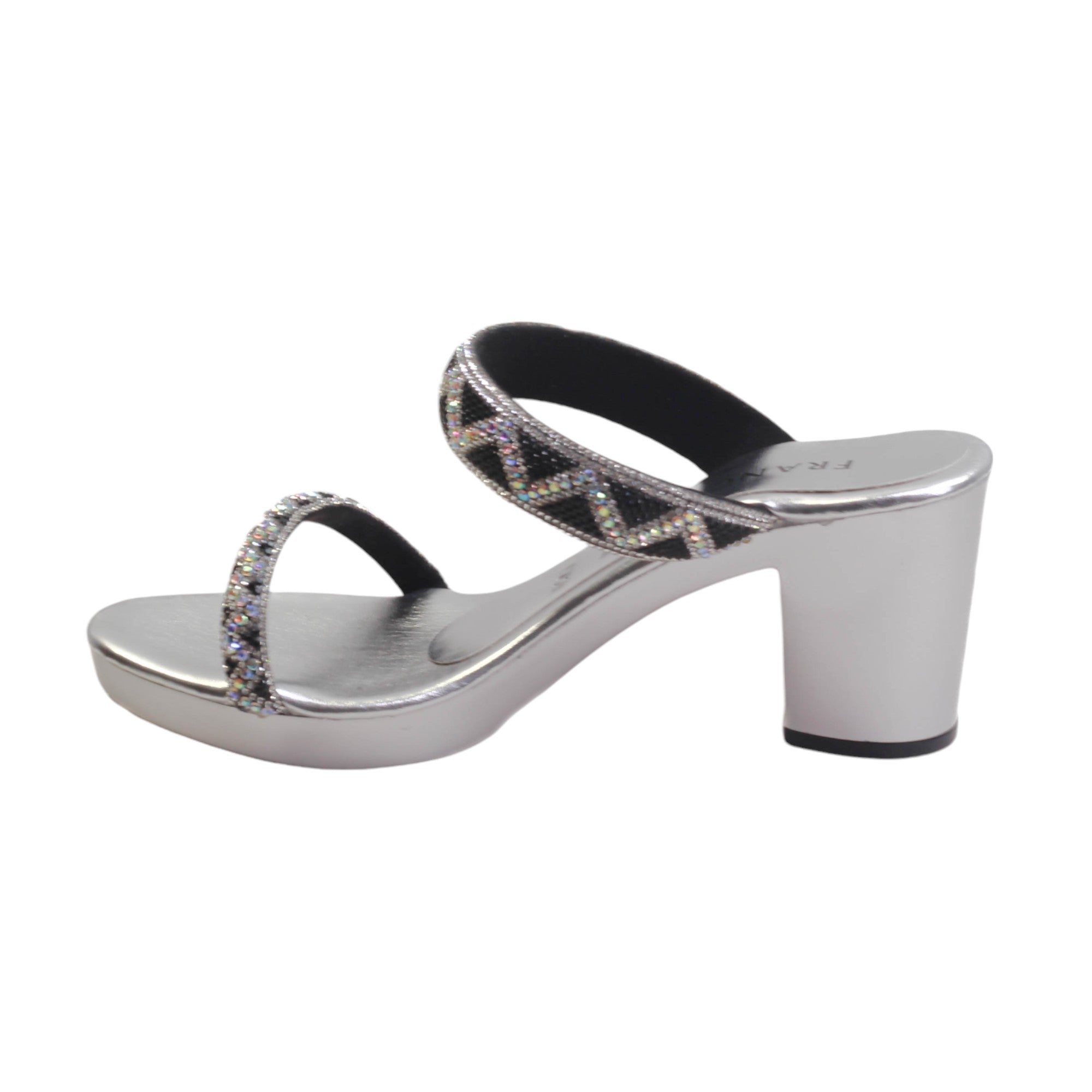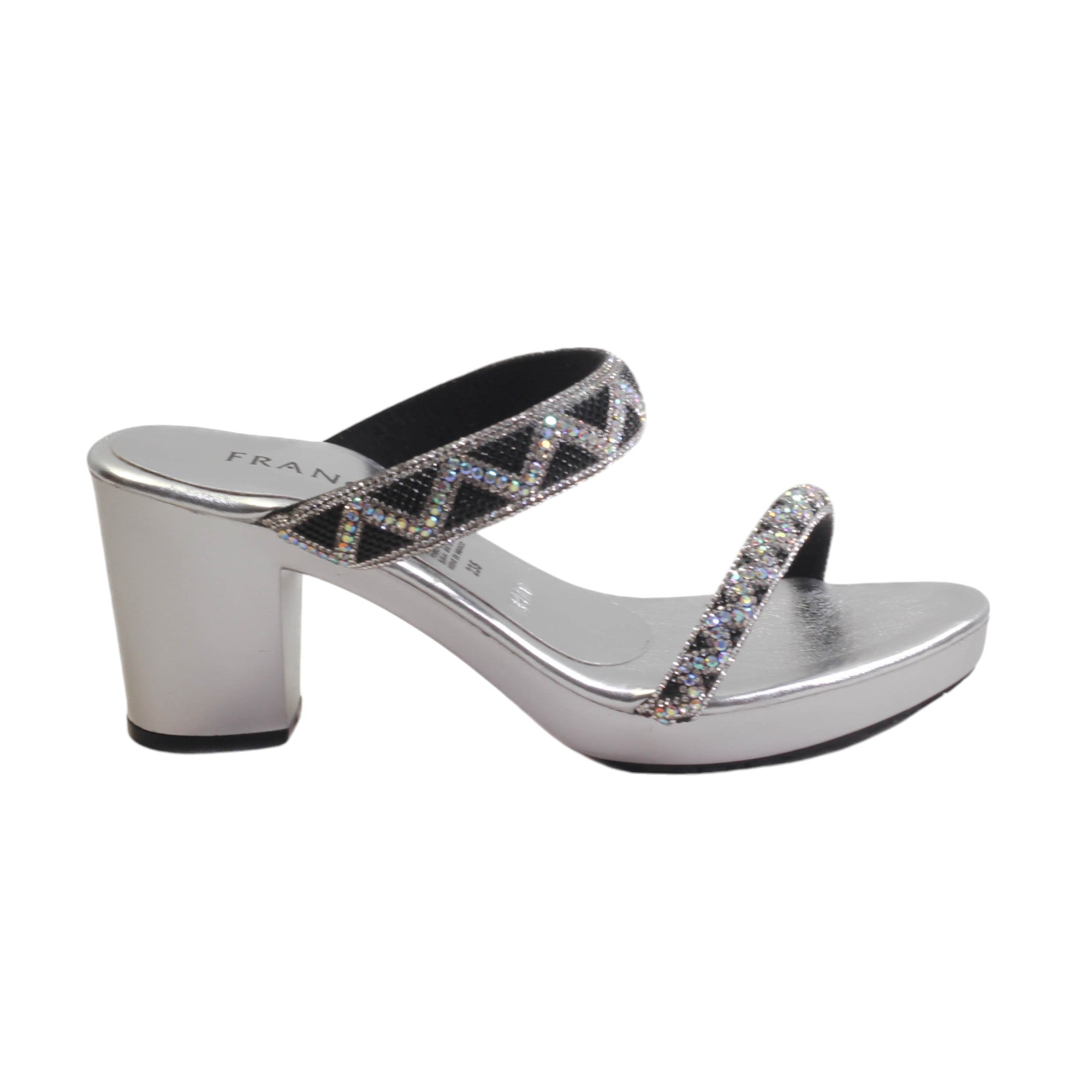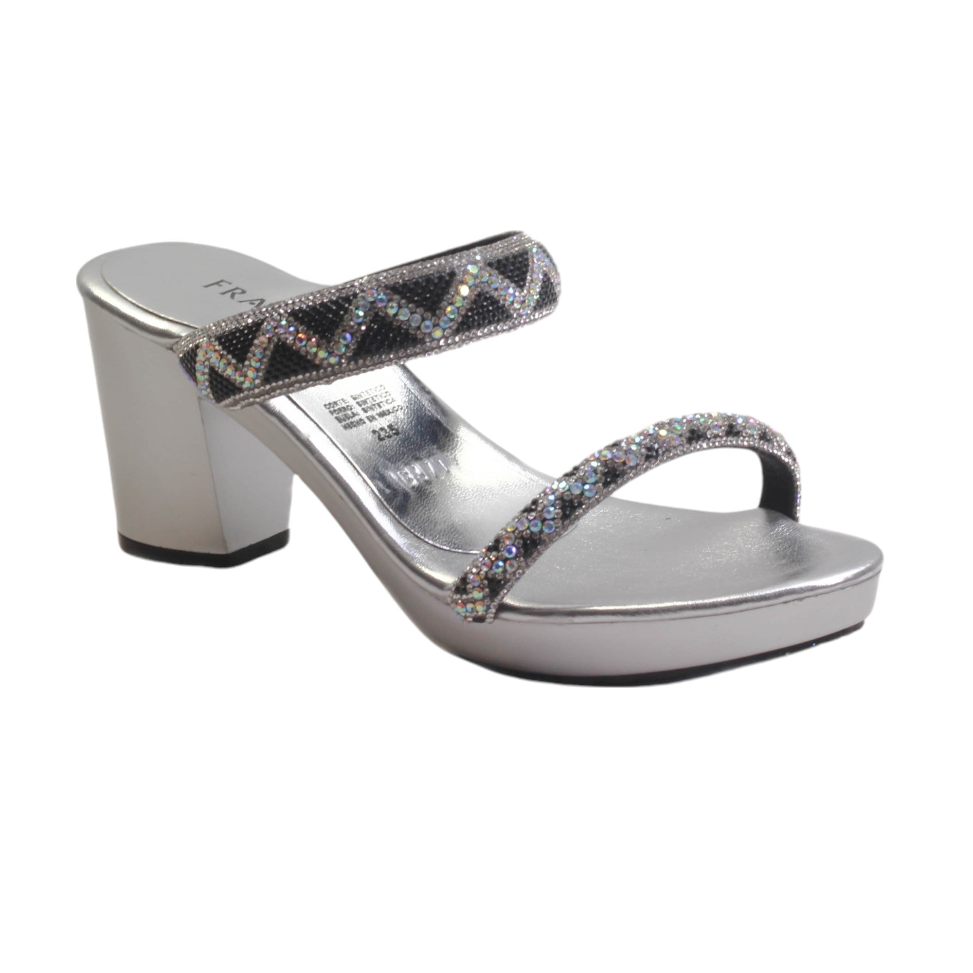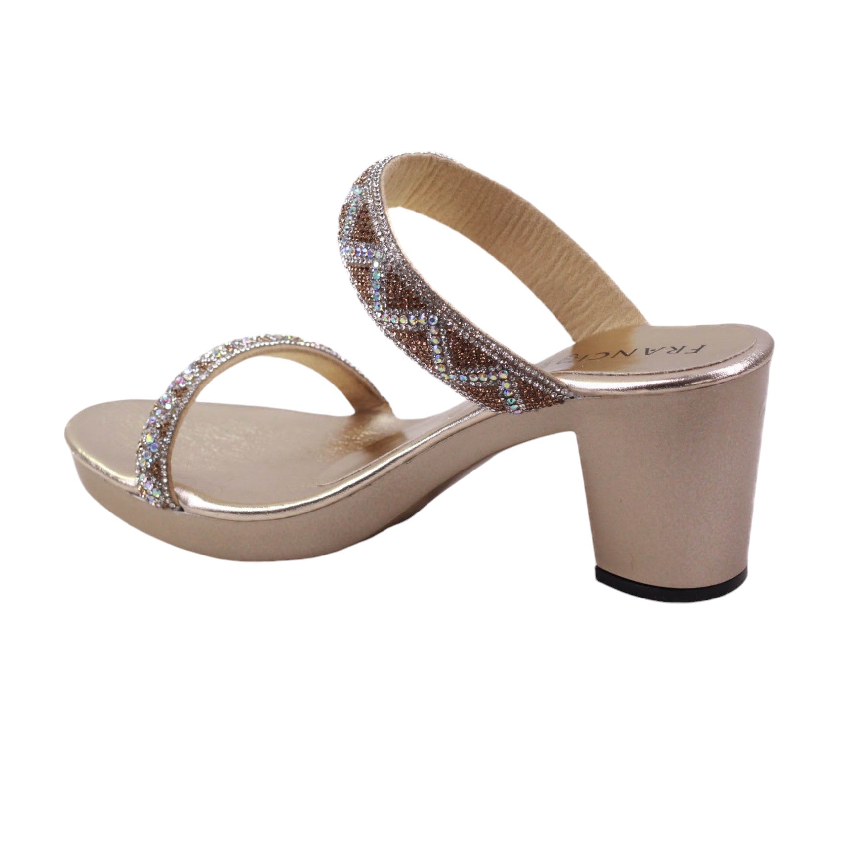Zapatilla para dama marca Francis en colores oro tornasol y negro. Es un modelo atractivo con tacón medio ancho. Cuenta con tiras cubiertas por pedrería en distintos tonos, lo cual lo hace un modelo atractivo a la vista.