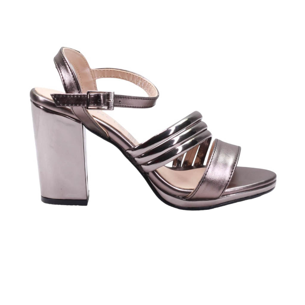 Zapatilla para dama de tacón ancho con tiras en diagonal acabado espejo