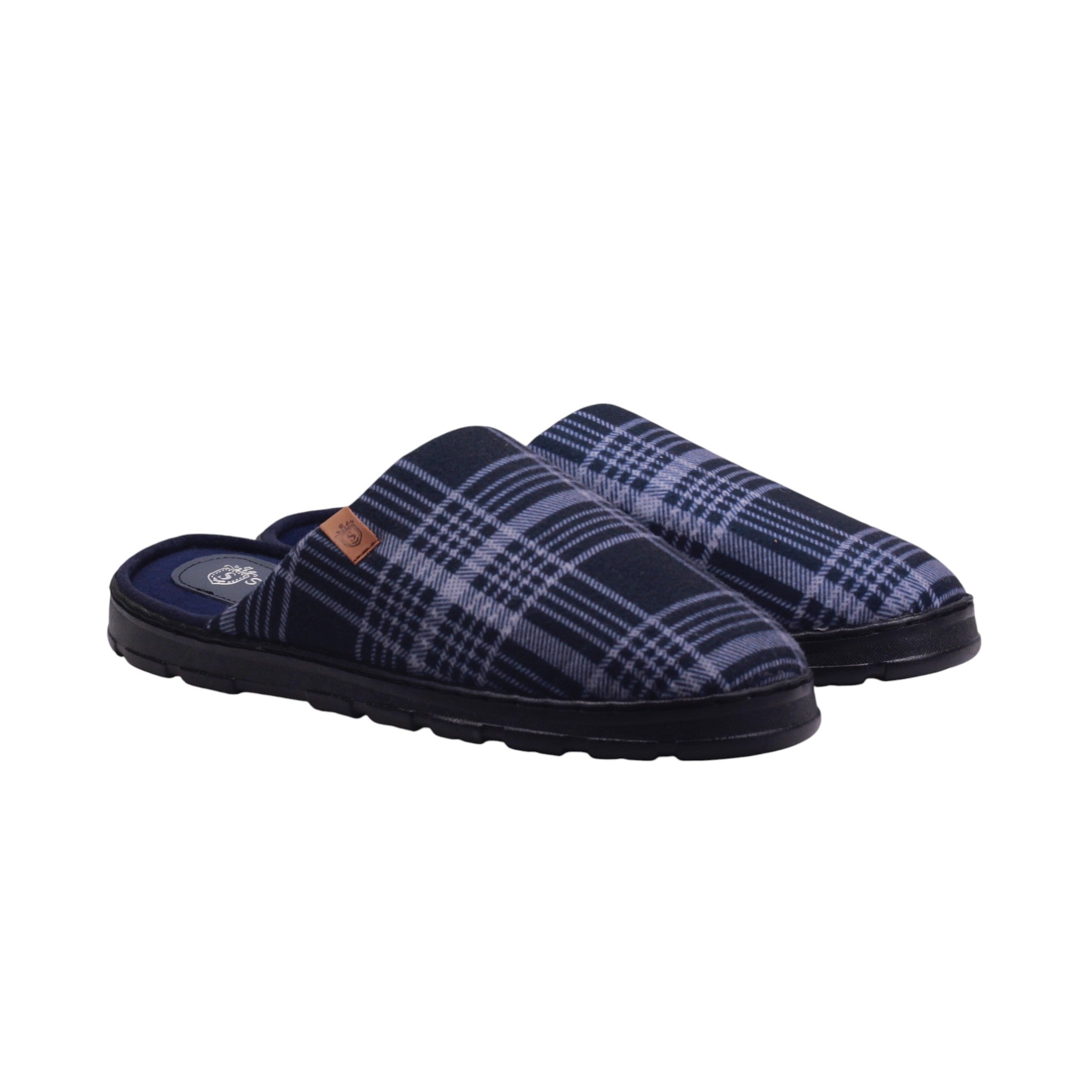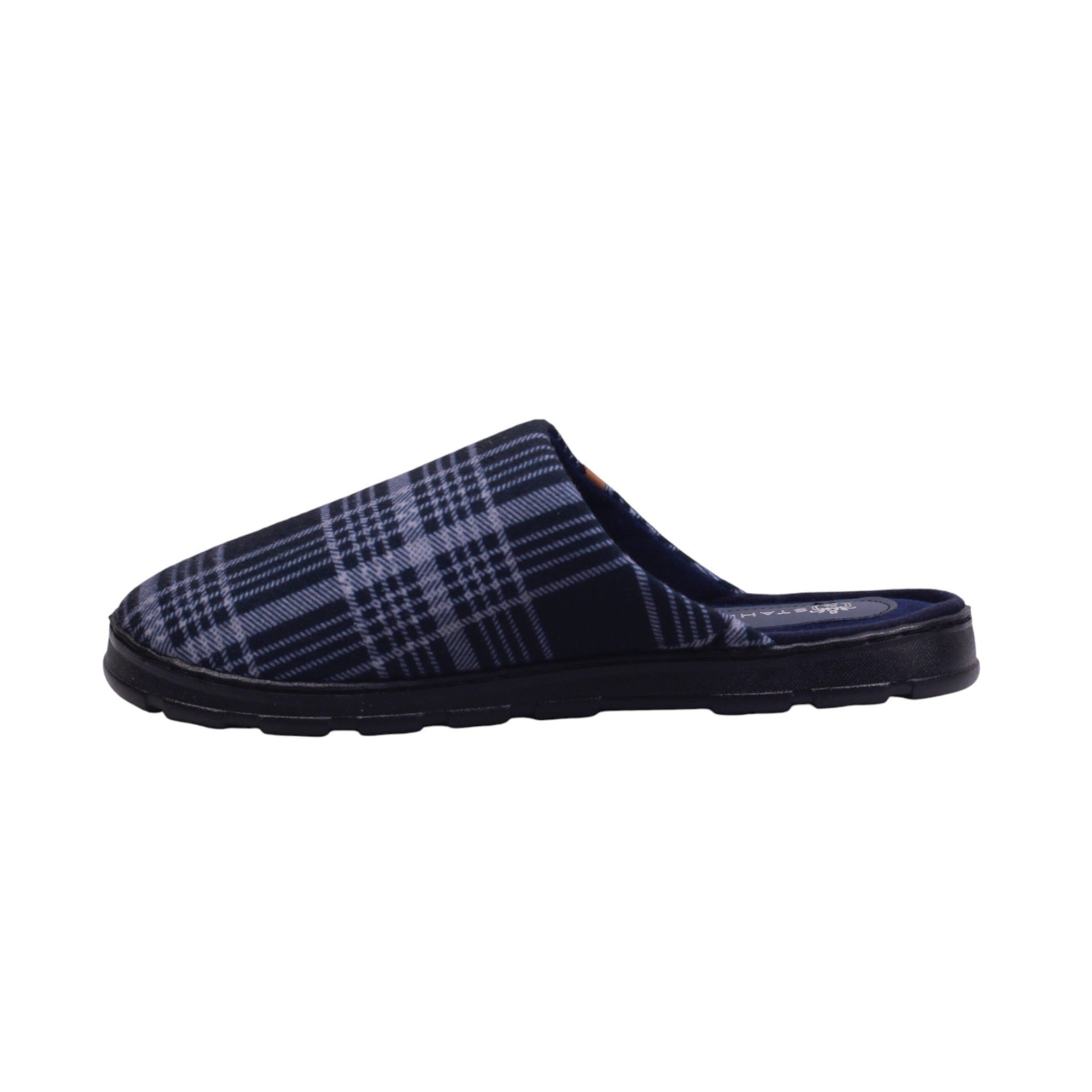 Pantufla de caballero elaborada con corte y forro textil. Su diseño cerrado al frente y abierto en talón facilita el calce, mientras que la suela ligera con textura antiderrapante brinda seguridad en cada paso.