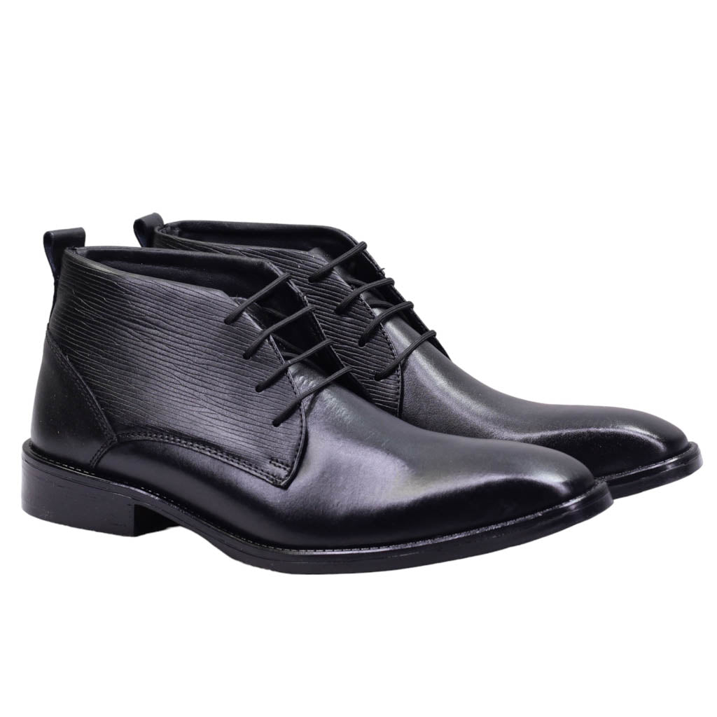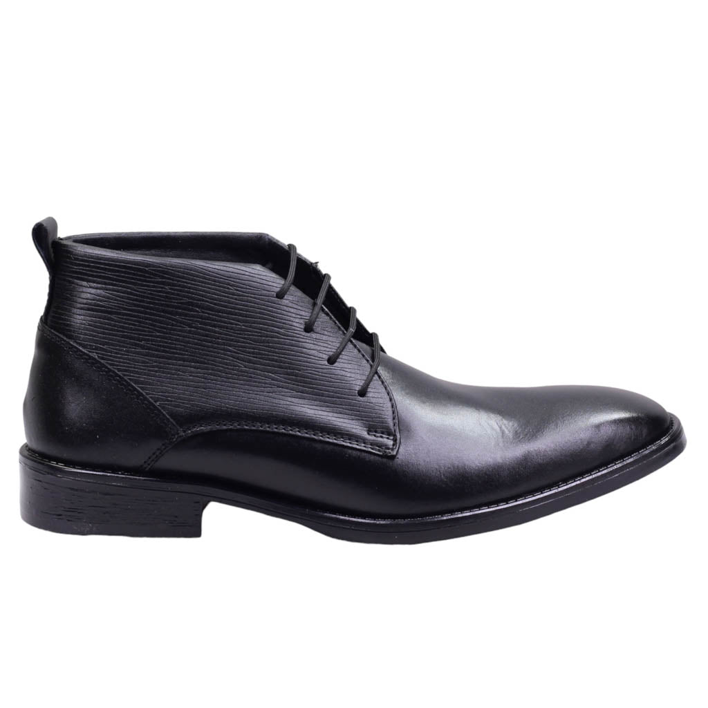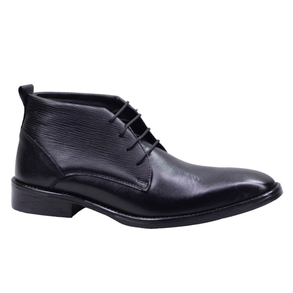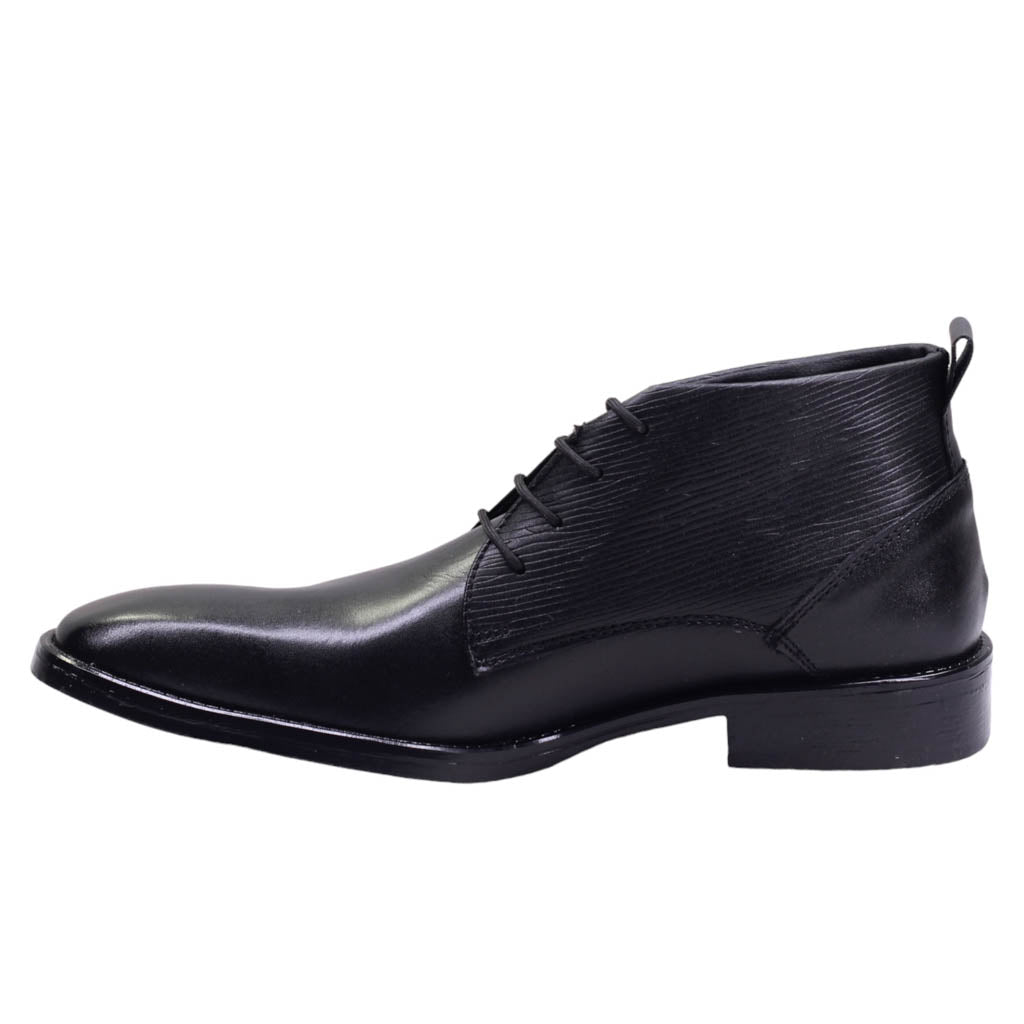 Botín para caballero marca Lugo conti en color negro.  Este modelo cuenta con un elegante acabado en piel lisa y grabada, que le brinda un toque de sofisticación. Su ajuste con agujetas permite una óptima sujeción al pie, mientras que su plantilla de confort brinda una experiencia cómoda al caminar. Ideal para un estilo casual y refinado.