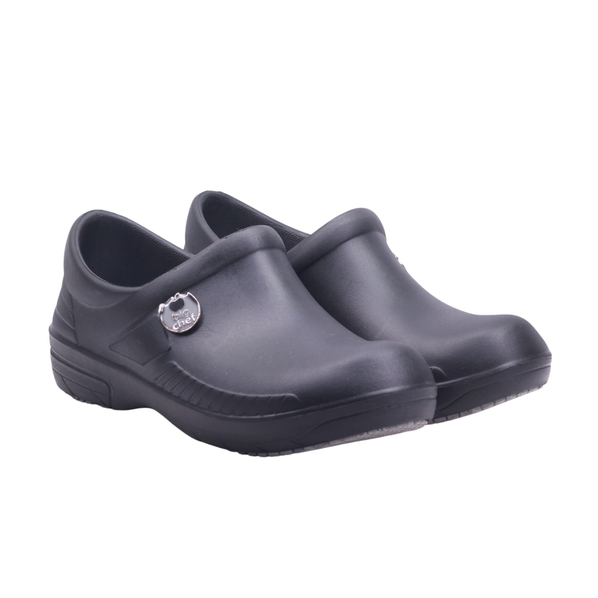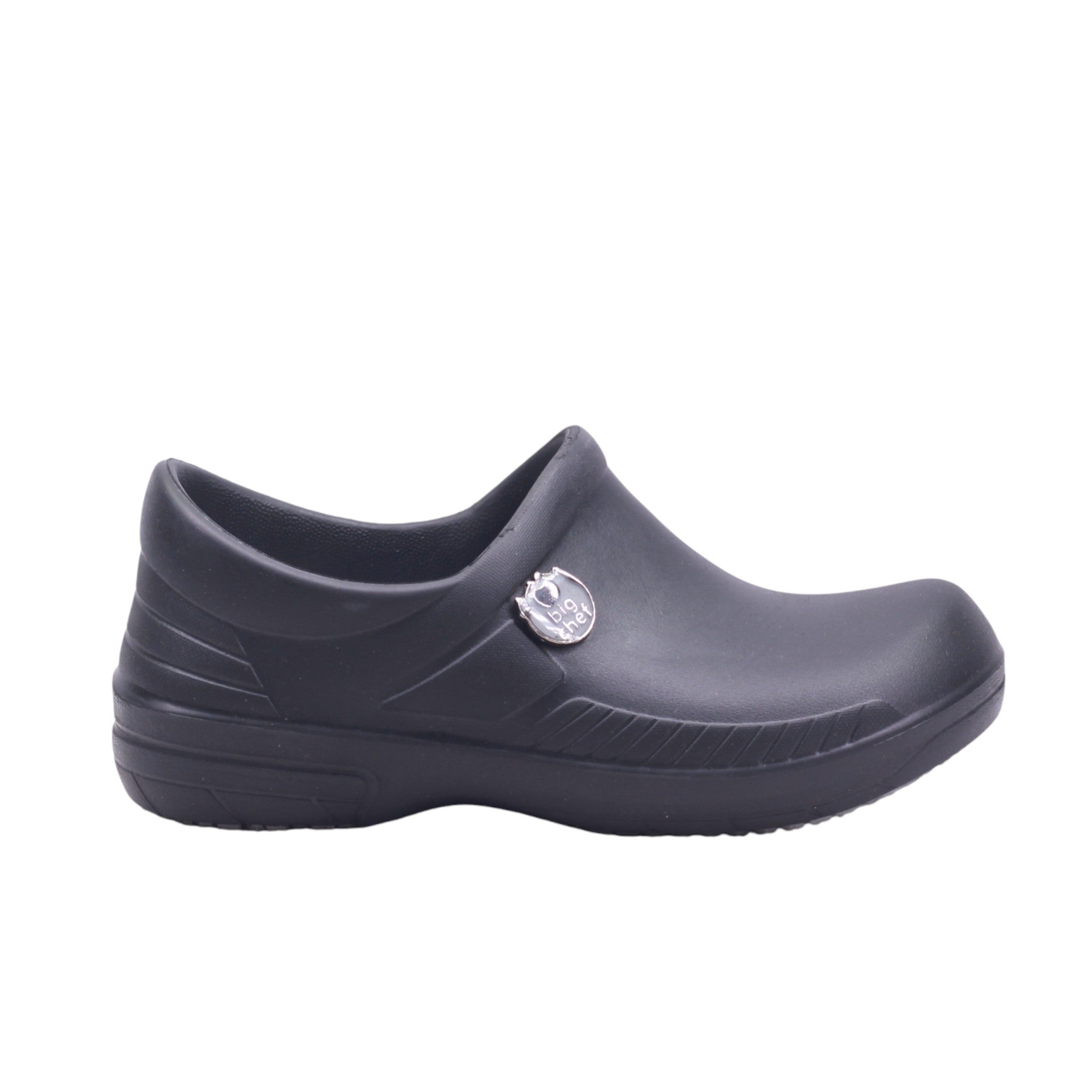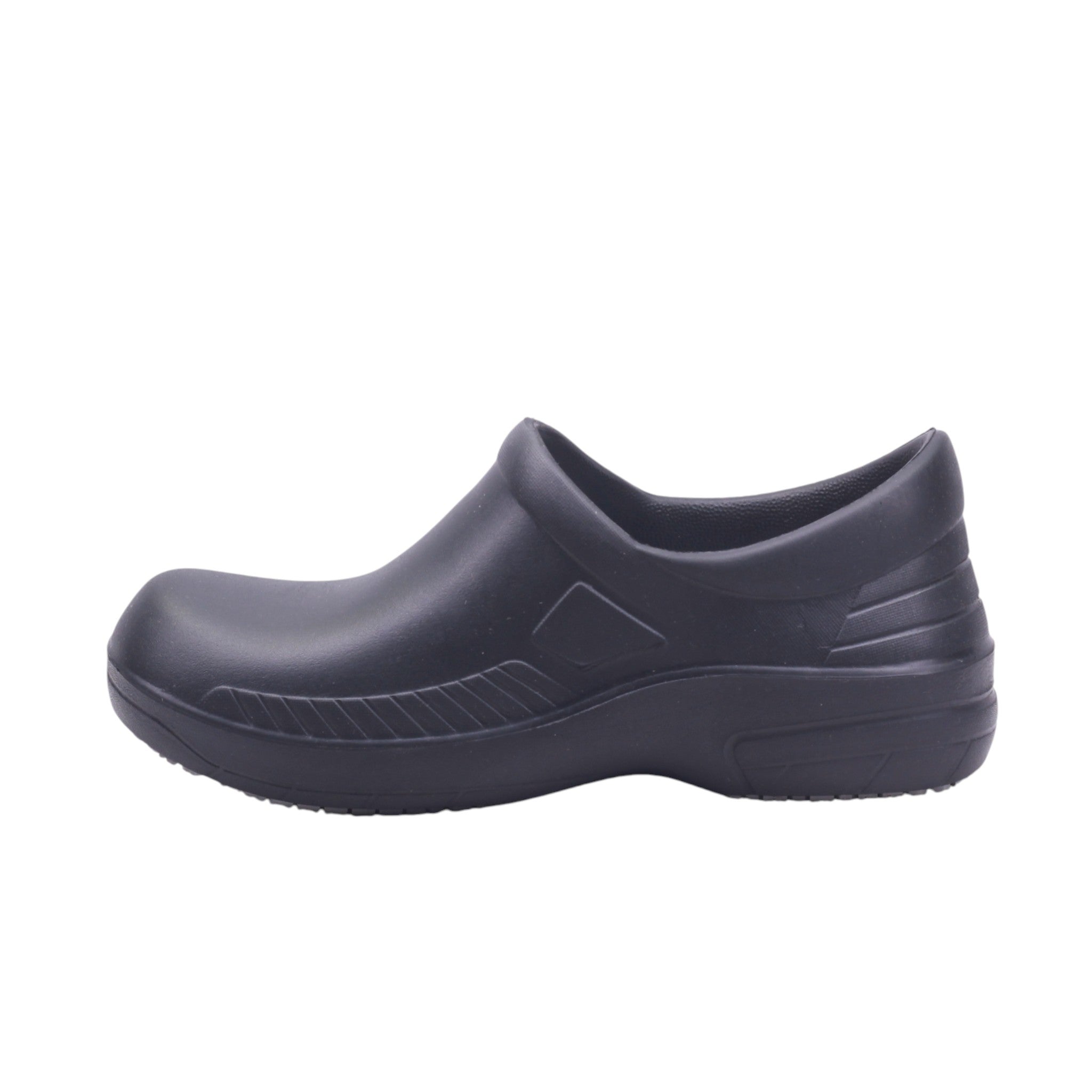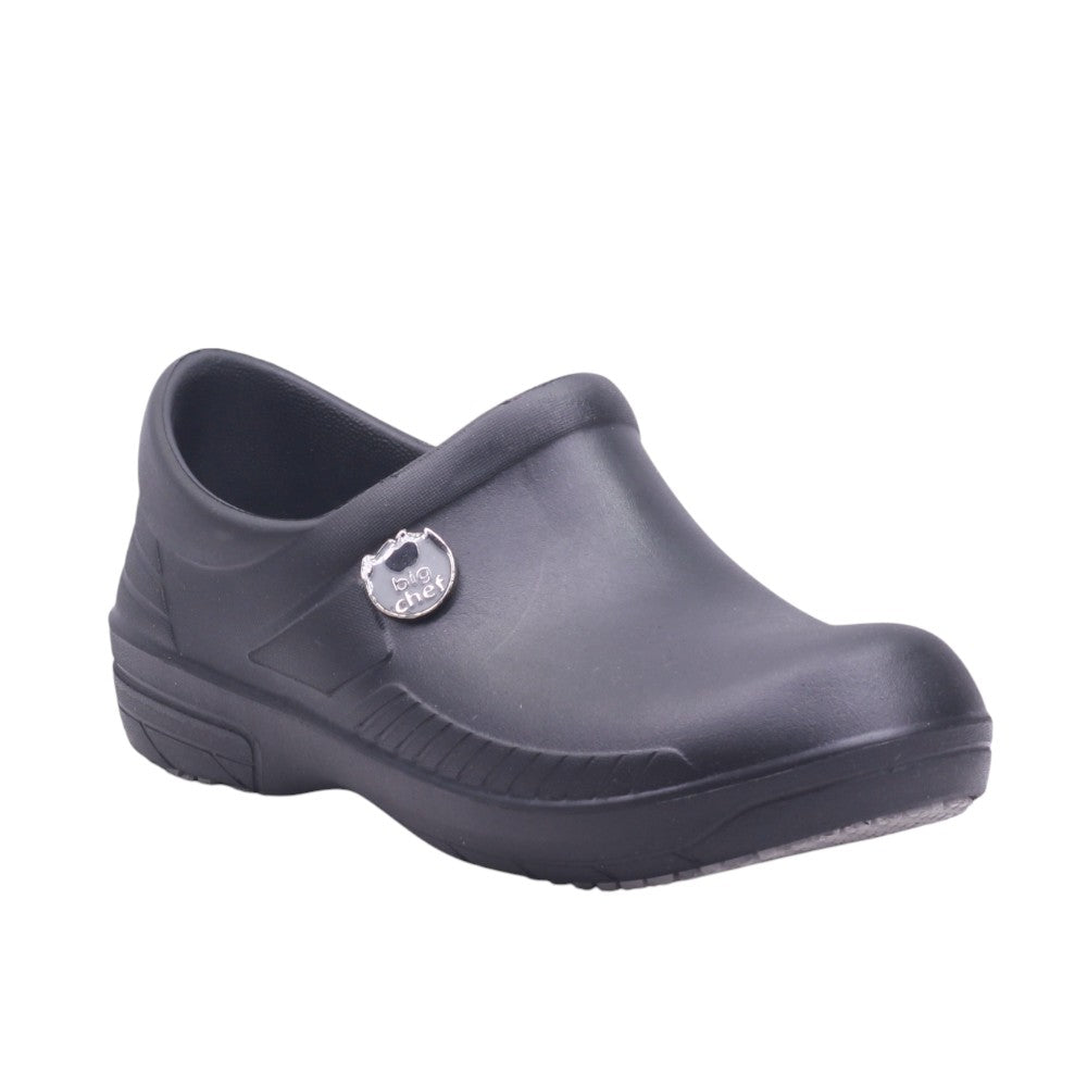 Calzado tipo zueco para hombre, en color negro, con corte, forro y suela sintética, diseñado para brindar seguridad, confort y resistencia en entornos laborales exigentes. Su altura de 3.0 cm proporciona soporte adecuado sin comprometer la estabilidad. El diseño incluye puntera cerrada y talón cubierto, ideal para cumplir con normas de higiene y protección en cocinas, hospitales o laboratorios. El exterior presenta acabado liso y lavable, con detalles sutiles en relieve que aportan estructura y estilo discreto. La plantilla interna acolchada está pensada para jornadas prolongadas de pie, mientras que la suela antideslizante con dibujo de tracción mejora el agarre en superficies húmedas o lisas.