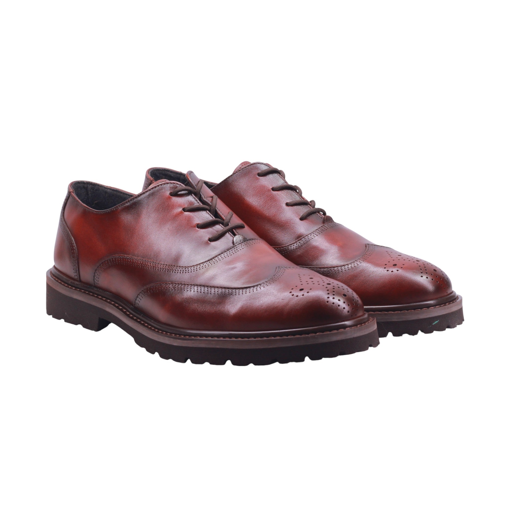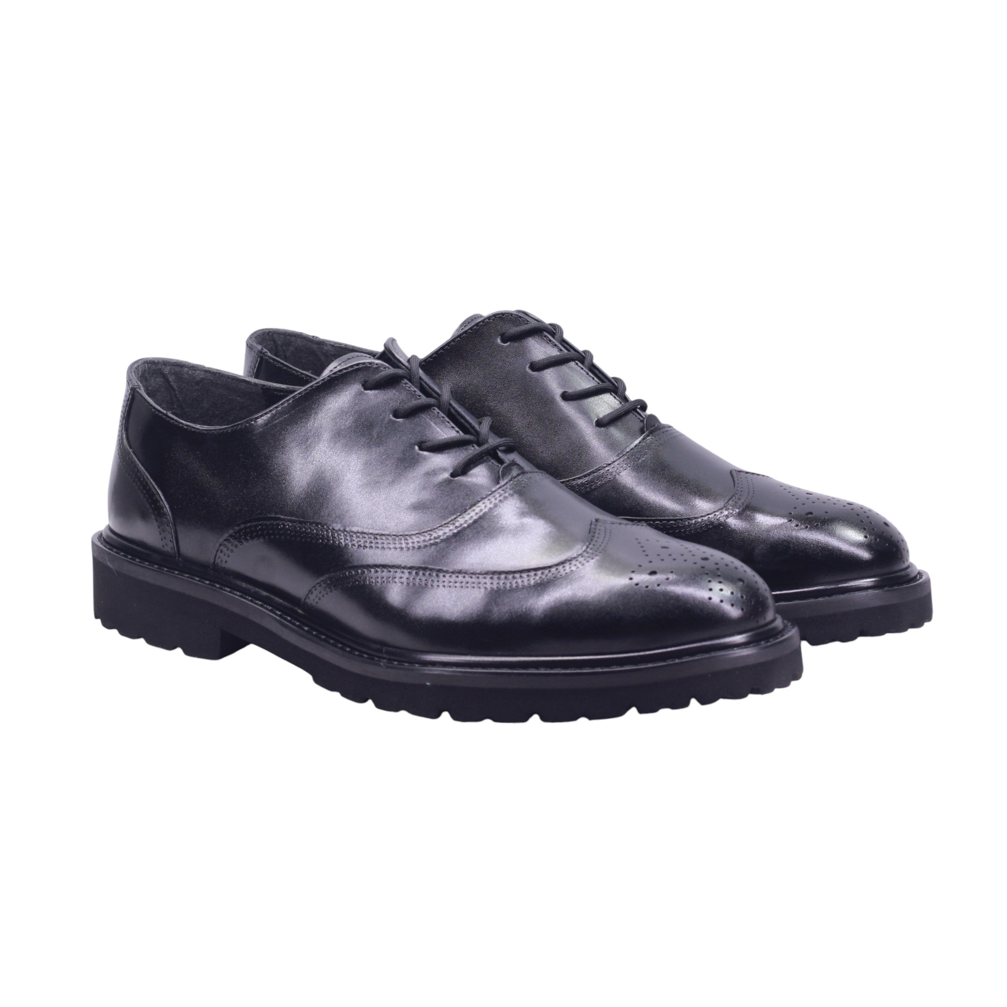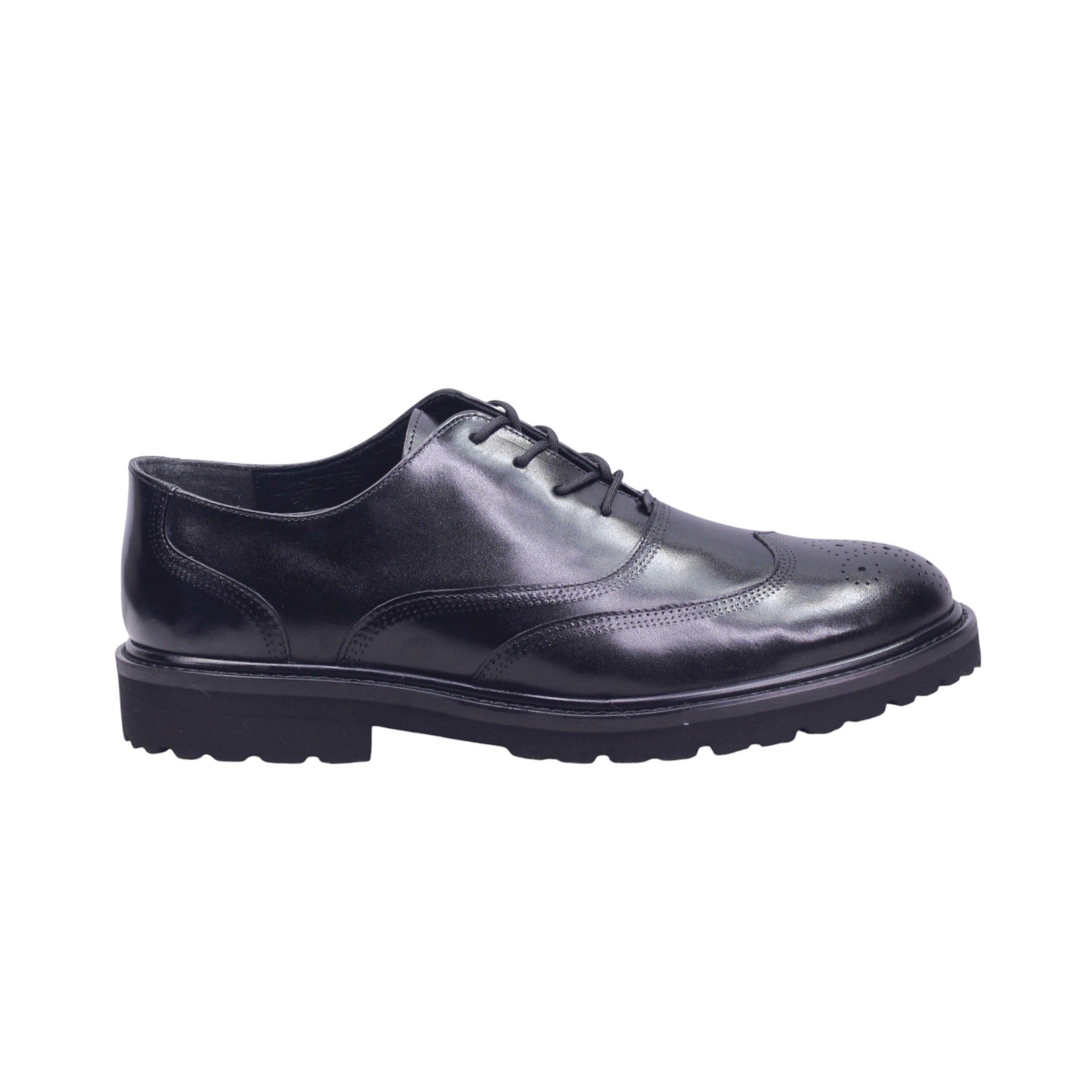 Zapato de vestir para caballero elaborado con corte de piel vacuna y forro de piel porcino, disponible en colores negro y tinto. Su diseño clásico con punta redonda incluye ajuste mediante agujetas frontales y detalles brogue perforados en la puntera y costuras decorativas que aportan elegancia y carácter.