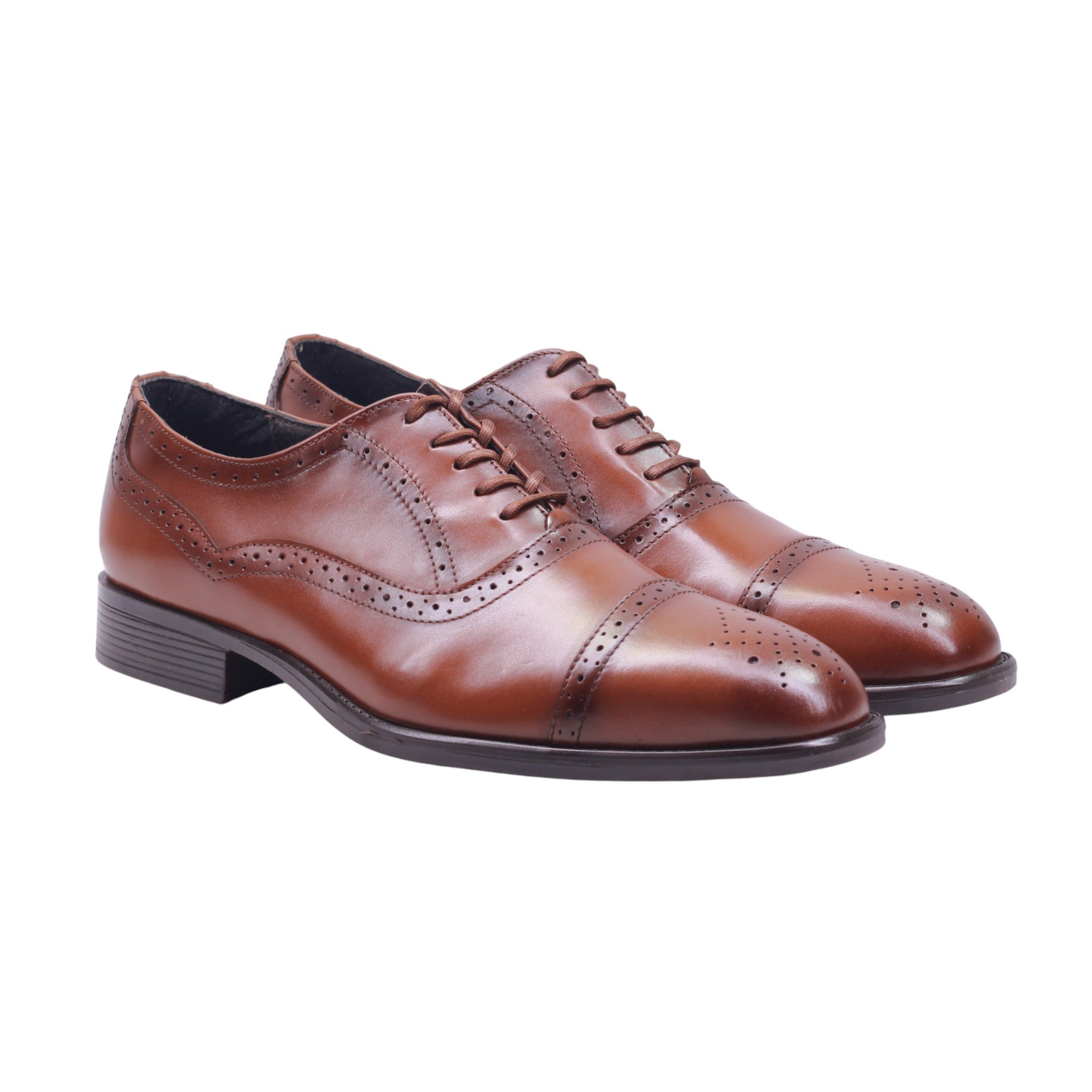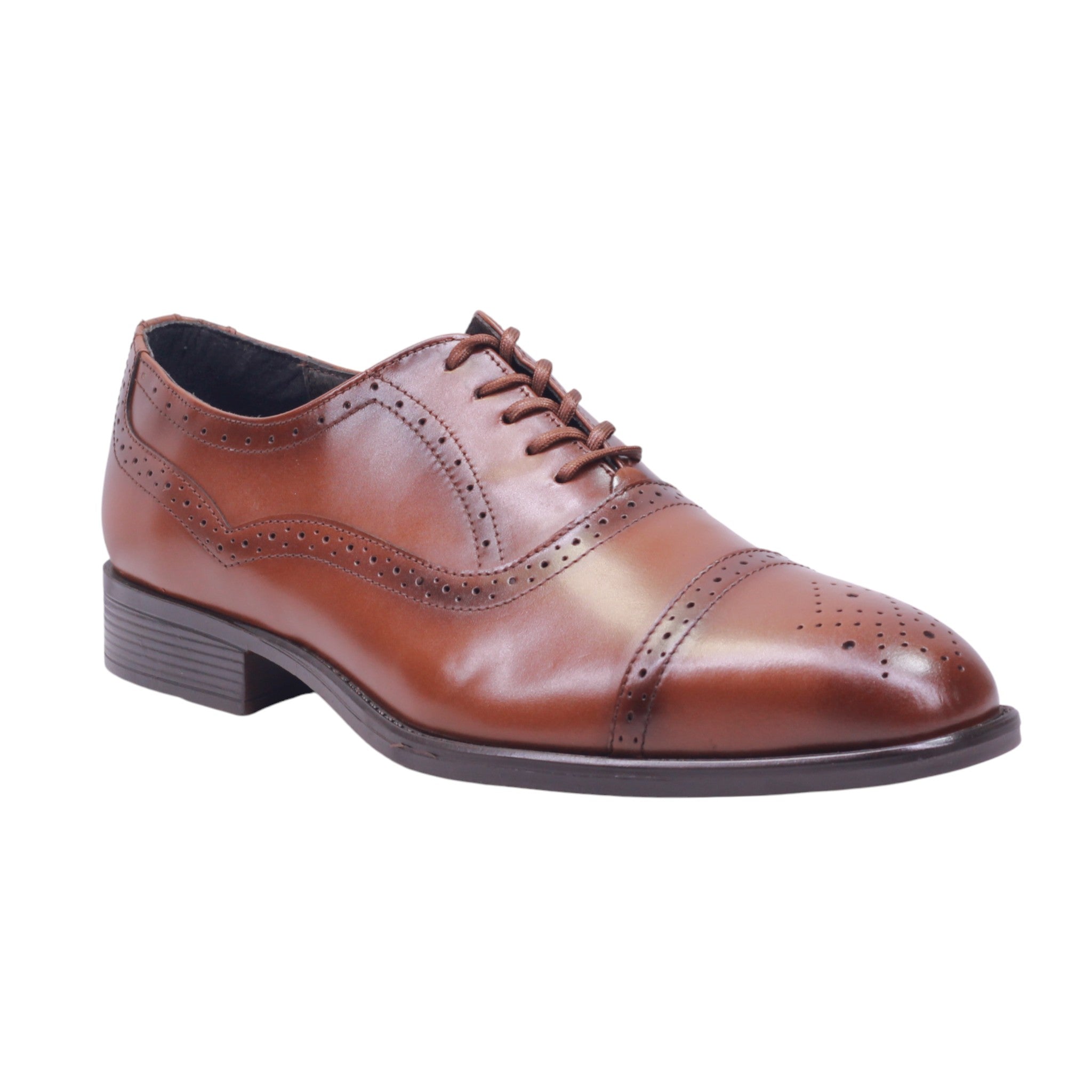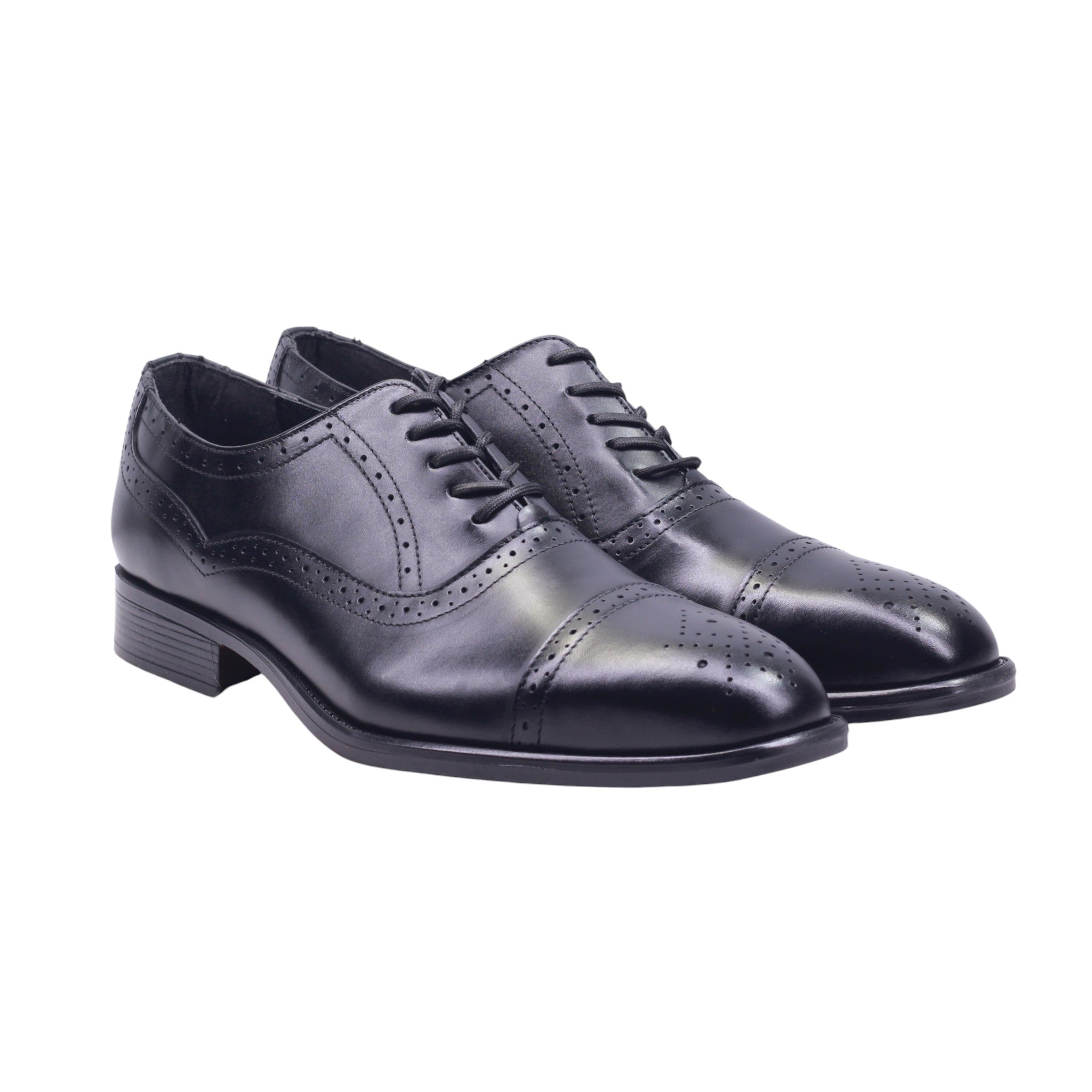 Zapato Oxford de caballero elaborado con corte de piel vacuna y forro de piel porcino, disponible en colores canela y negro. Su diseño formal con punta redonda incluye ajuste mediante agujetas frontales en sistema cerrado, puntera marcada tipo cap toe y detalle brogue perforado en costuras y bordes que aportan distinción y refinamiento.