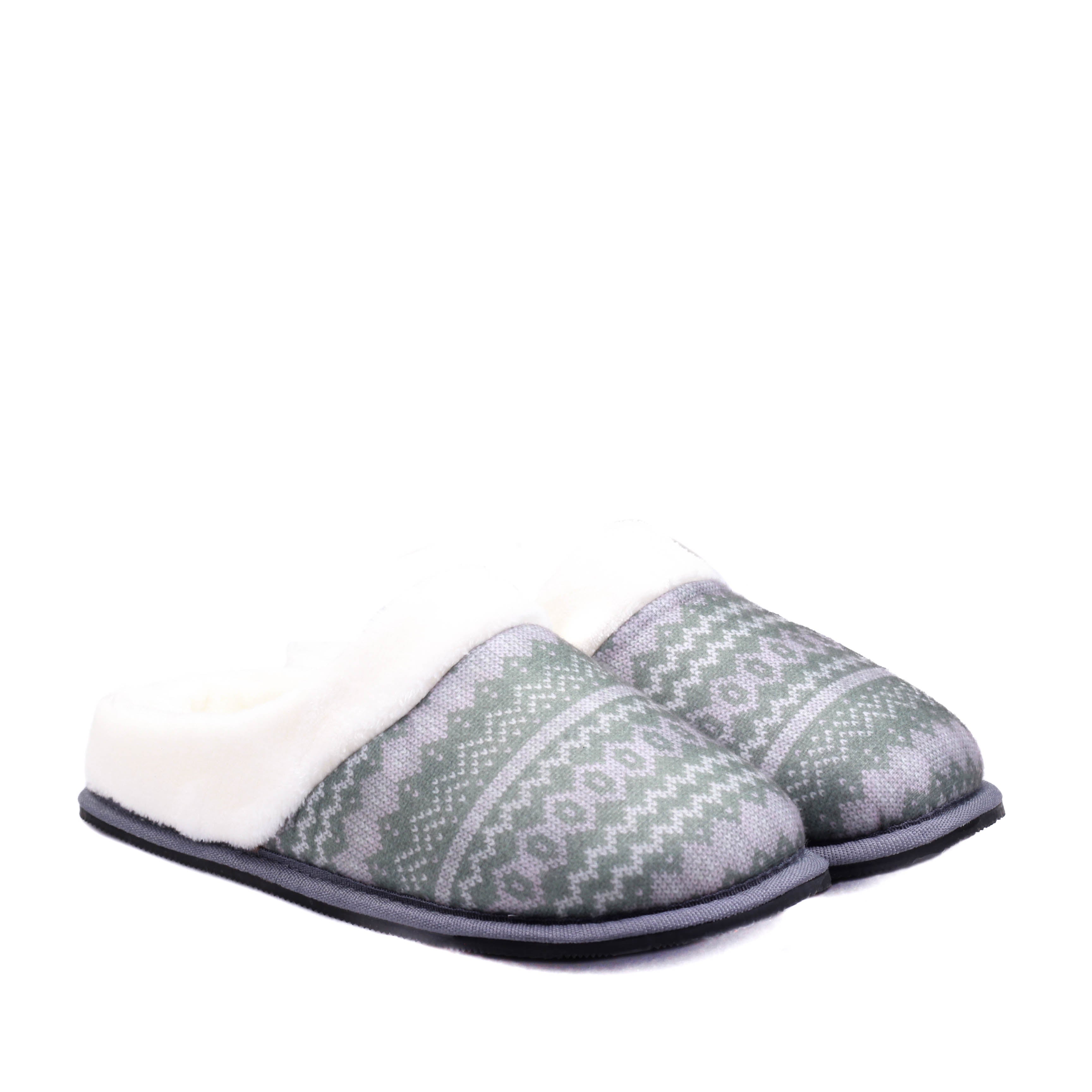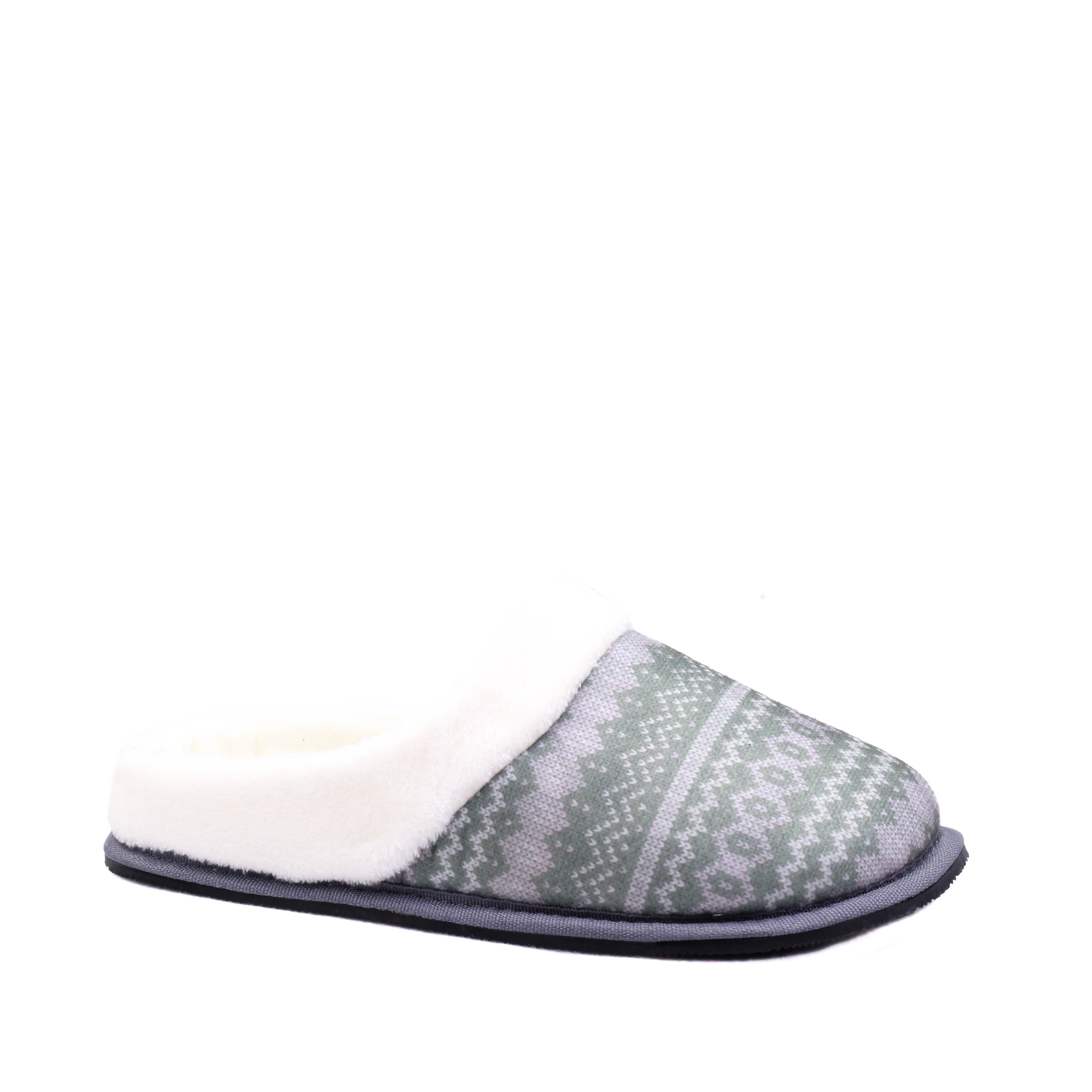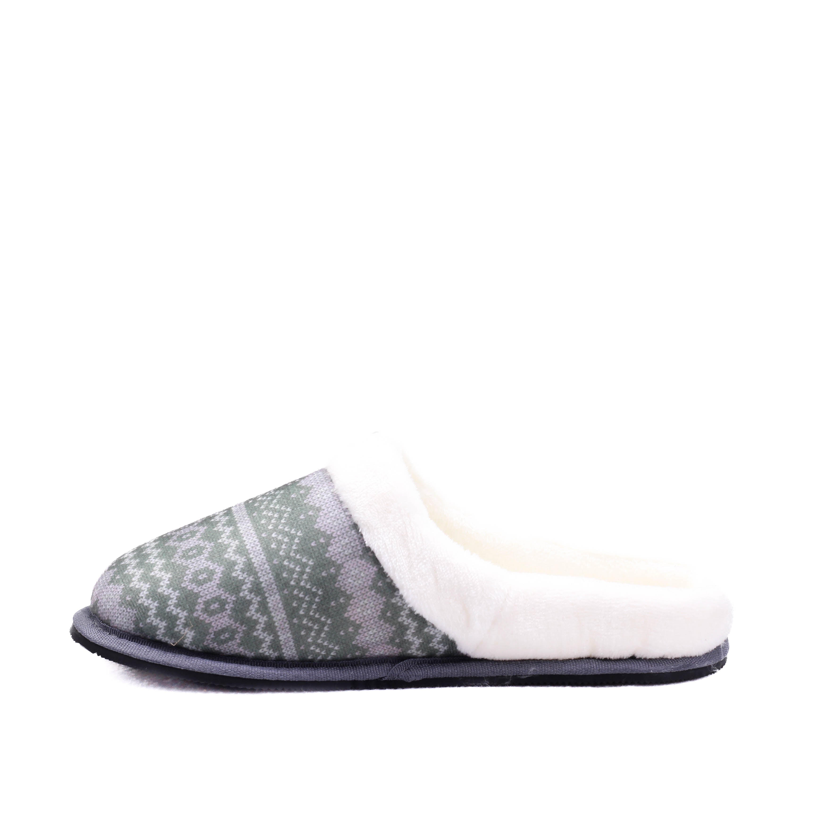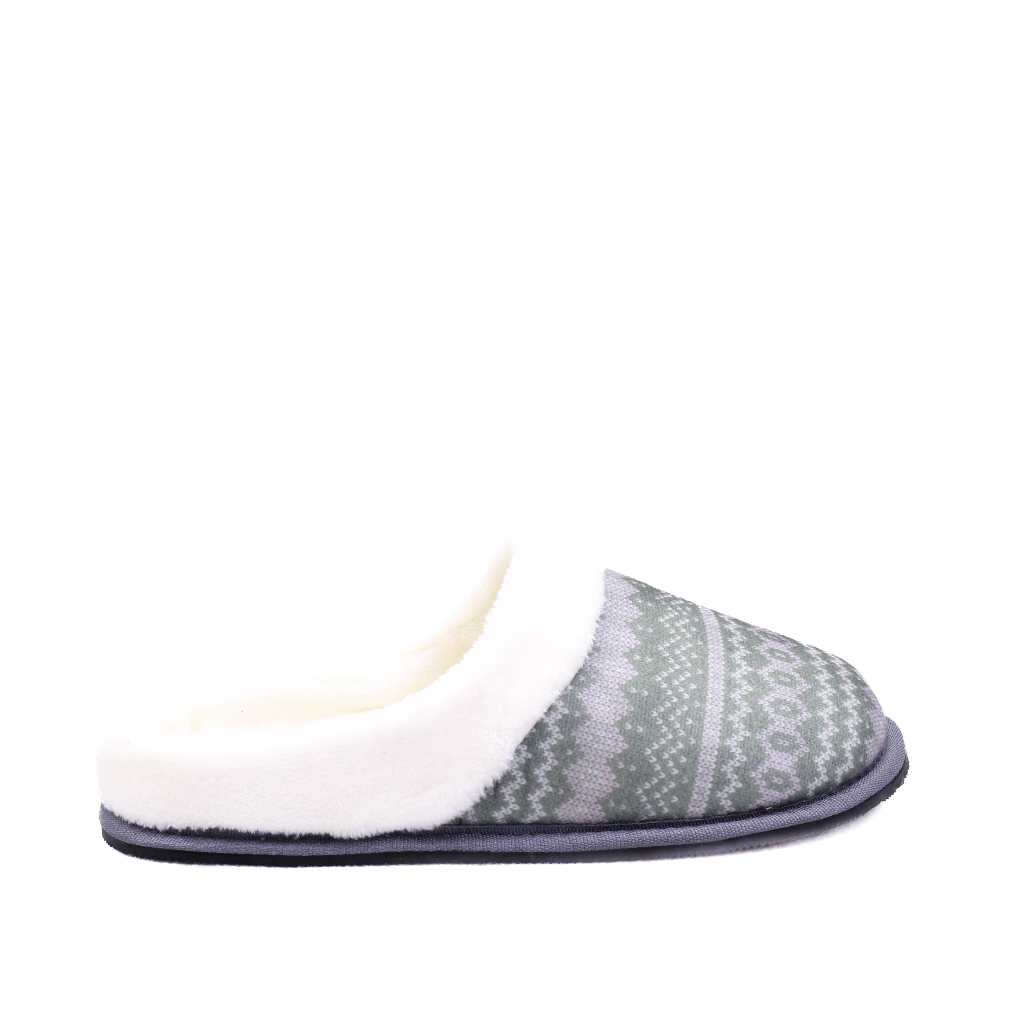 Pantufla para dama en color gris combinado con verde, modelo destalonado con interior textil