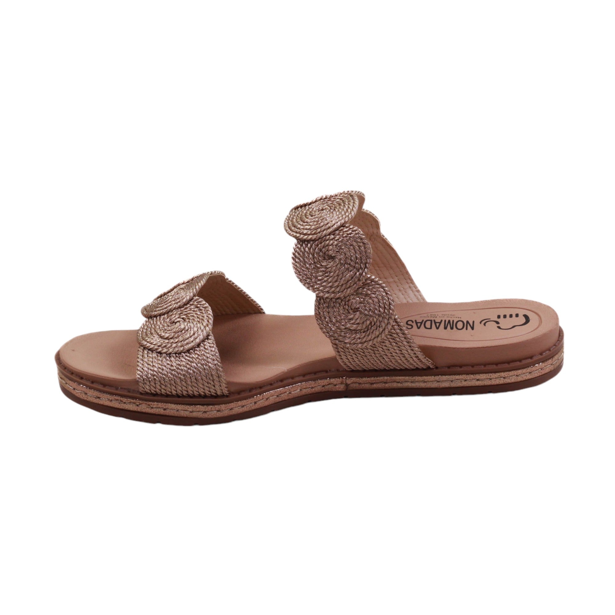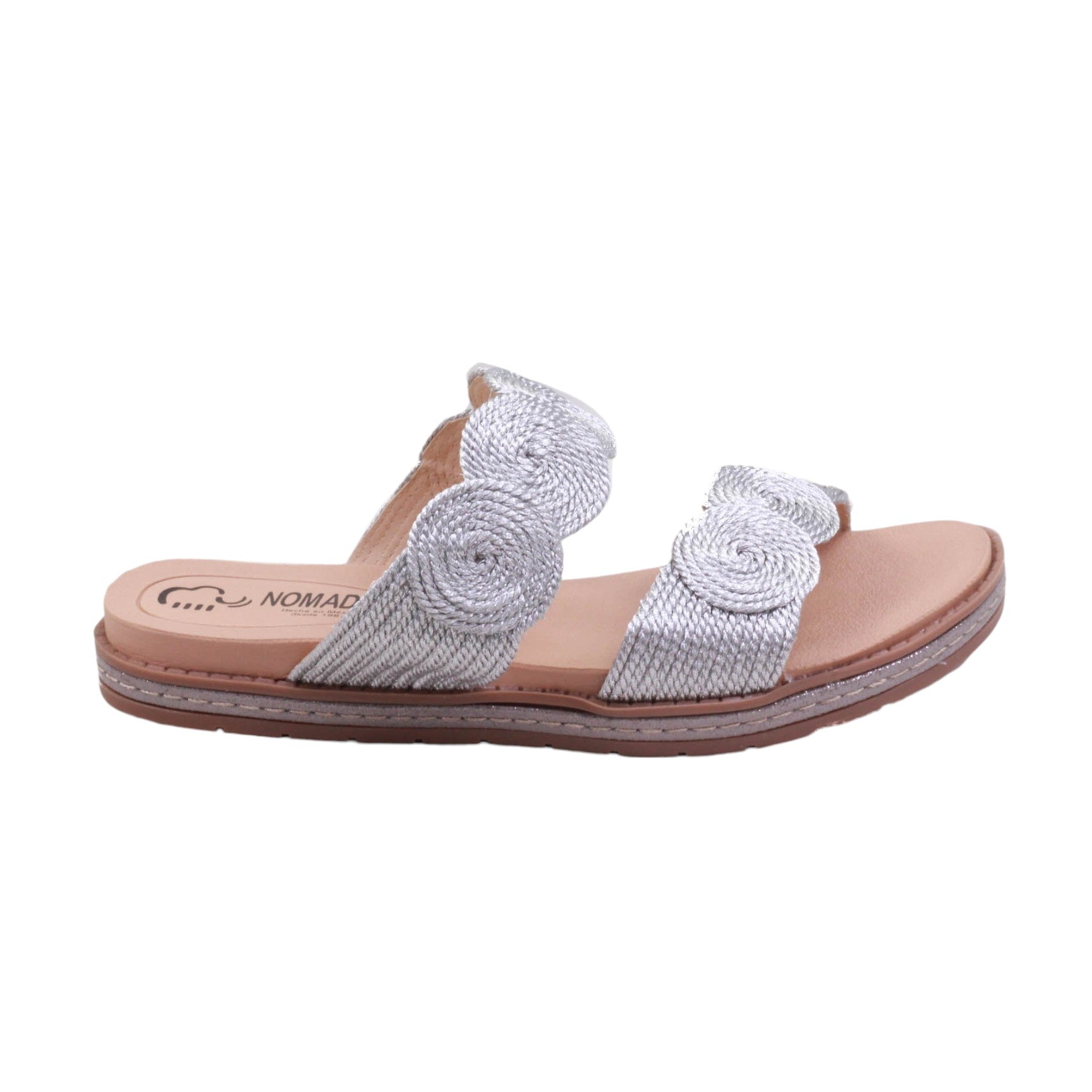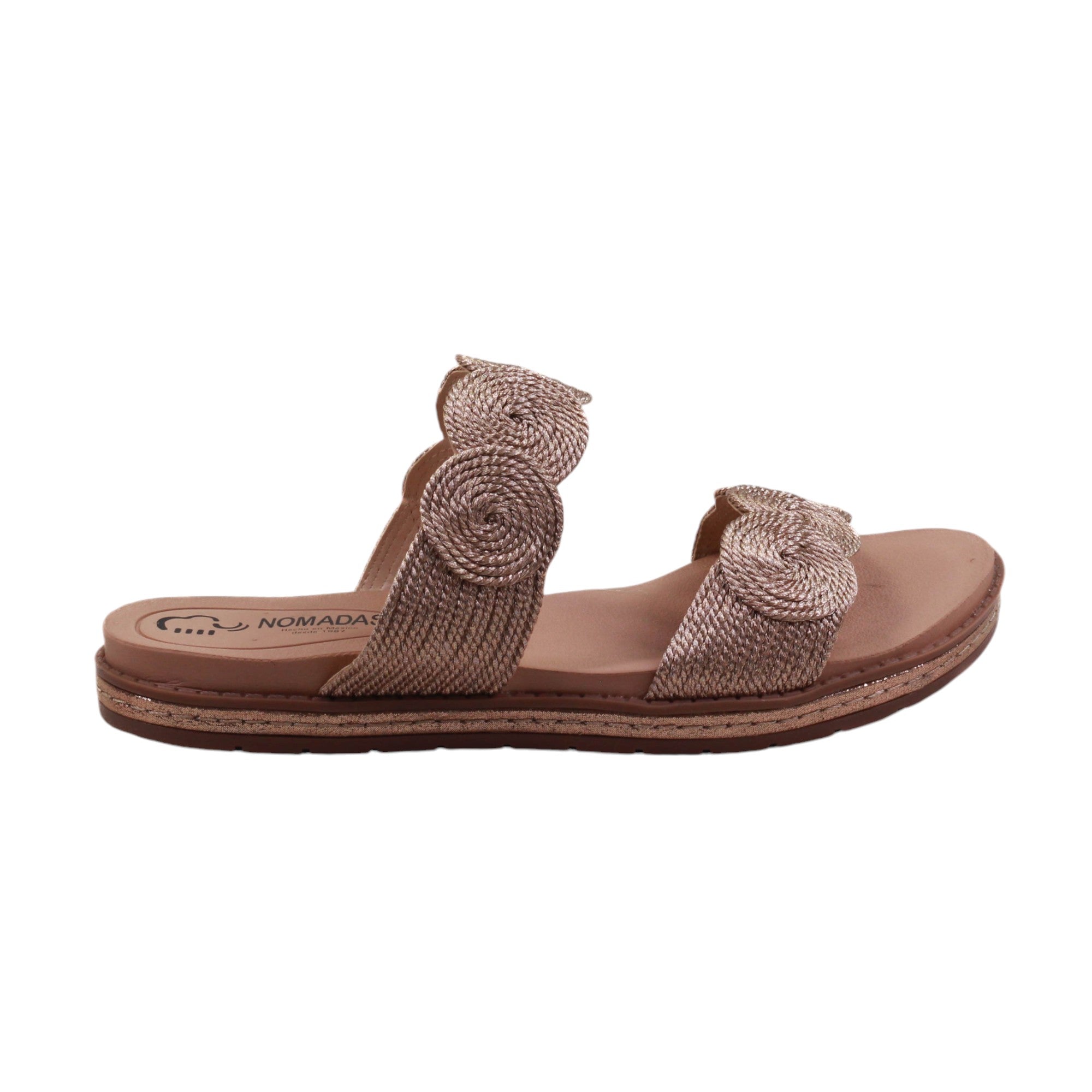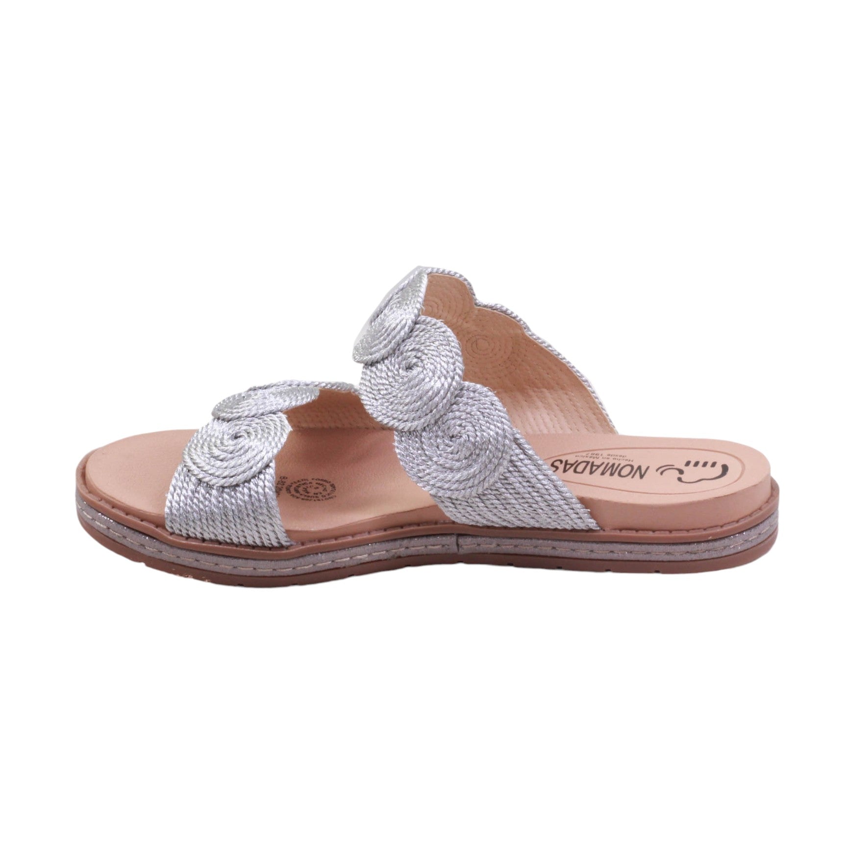 Sandalia para dama marca Nómadas en colores plata, bronce y negro. Es una sandalia de Confort que te proporciona una altura de 2,00 cm con un calce perfecto y te brindará comodidad y estilo en cada paso. Cuenta con un acabado en adornos circulares y una platilla de confort.