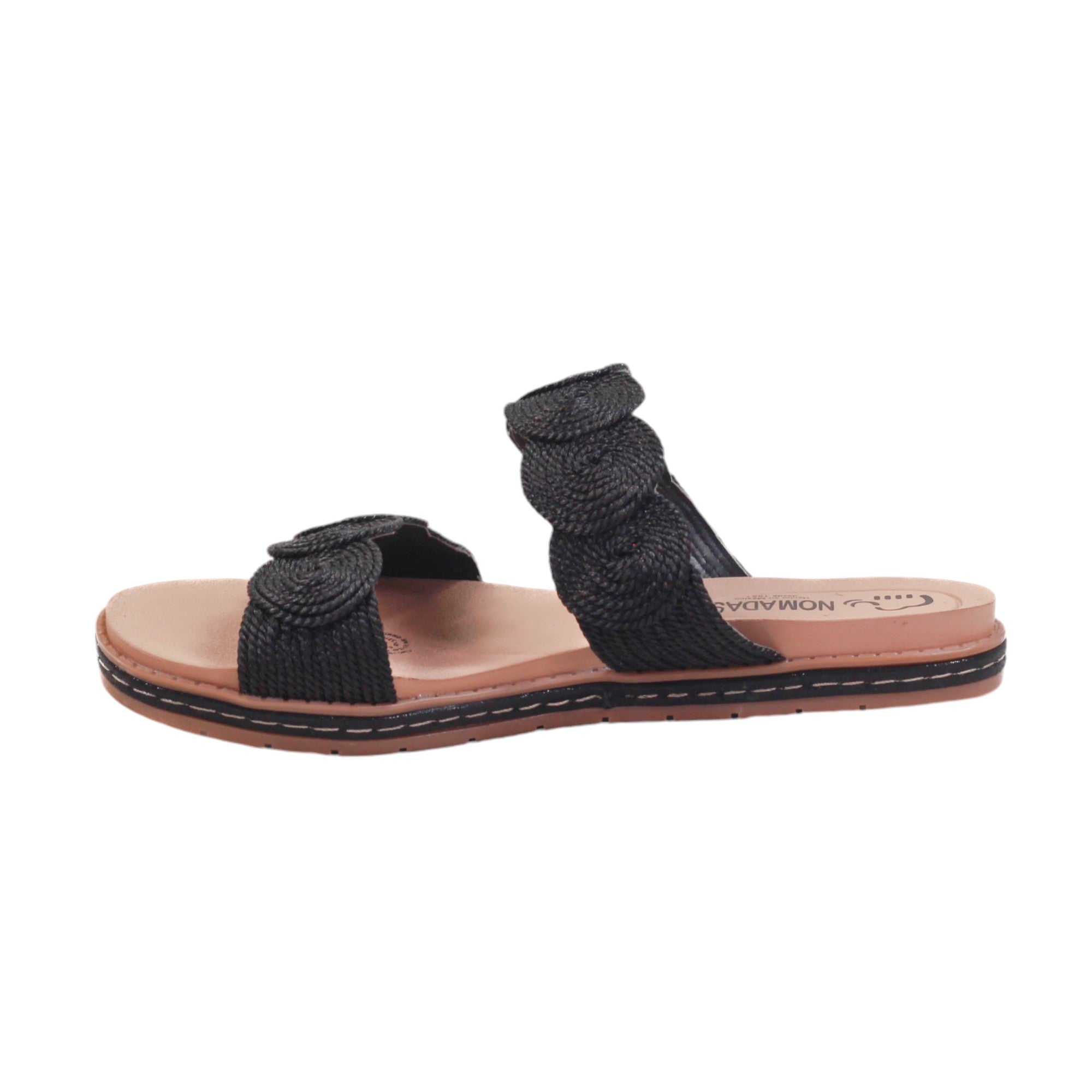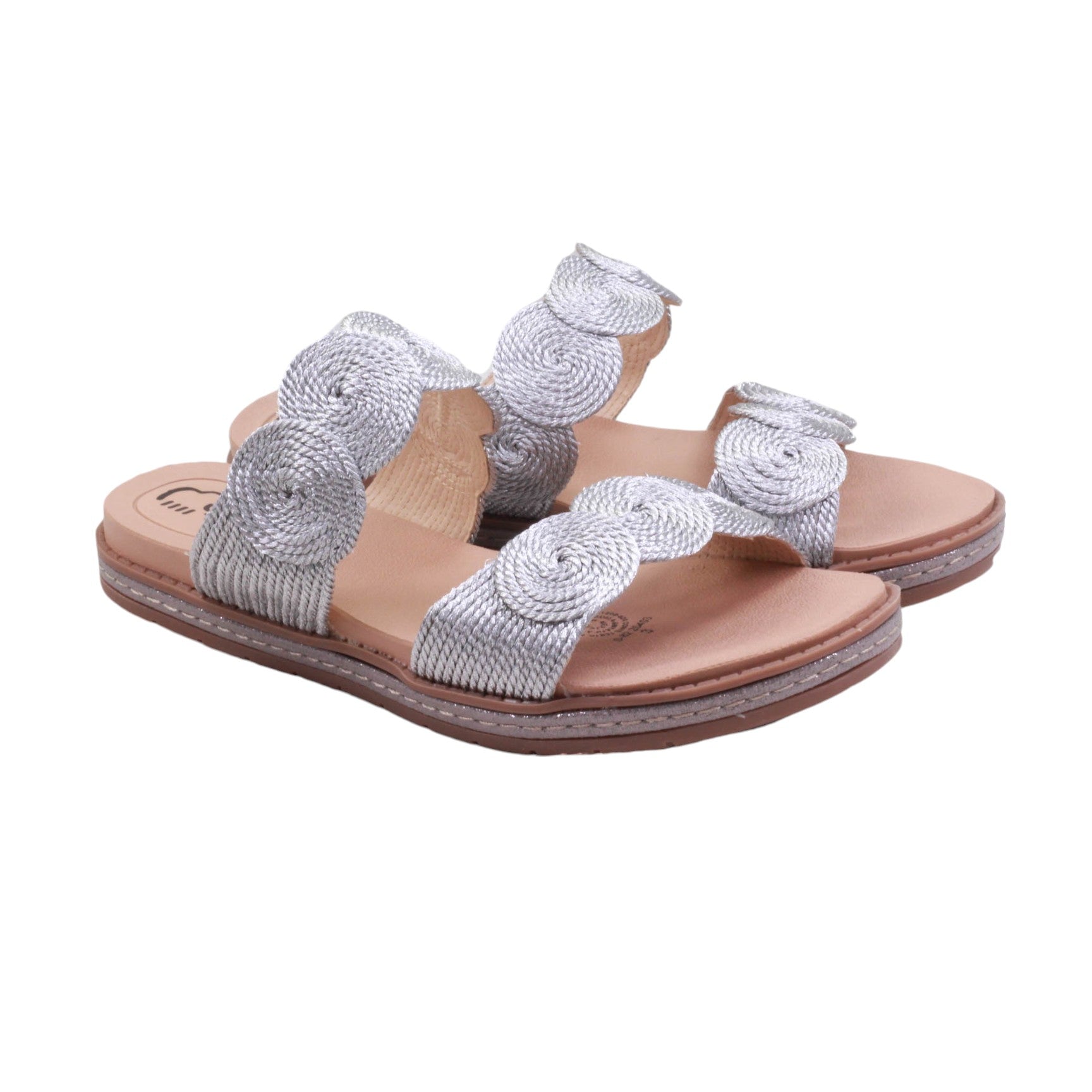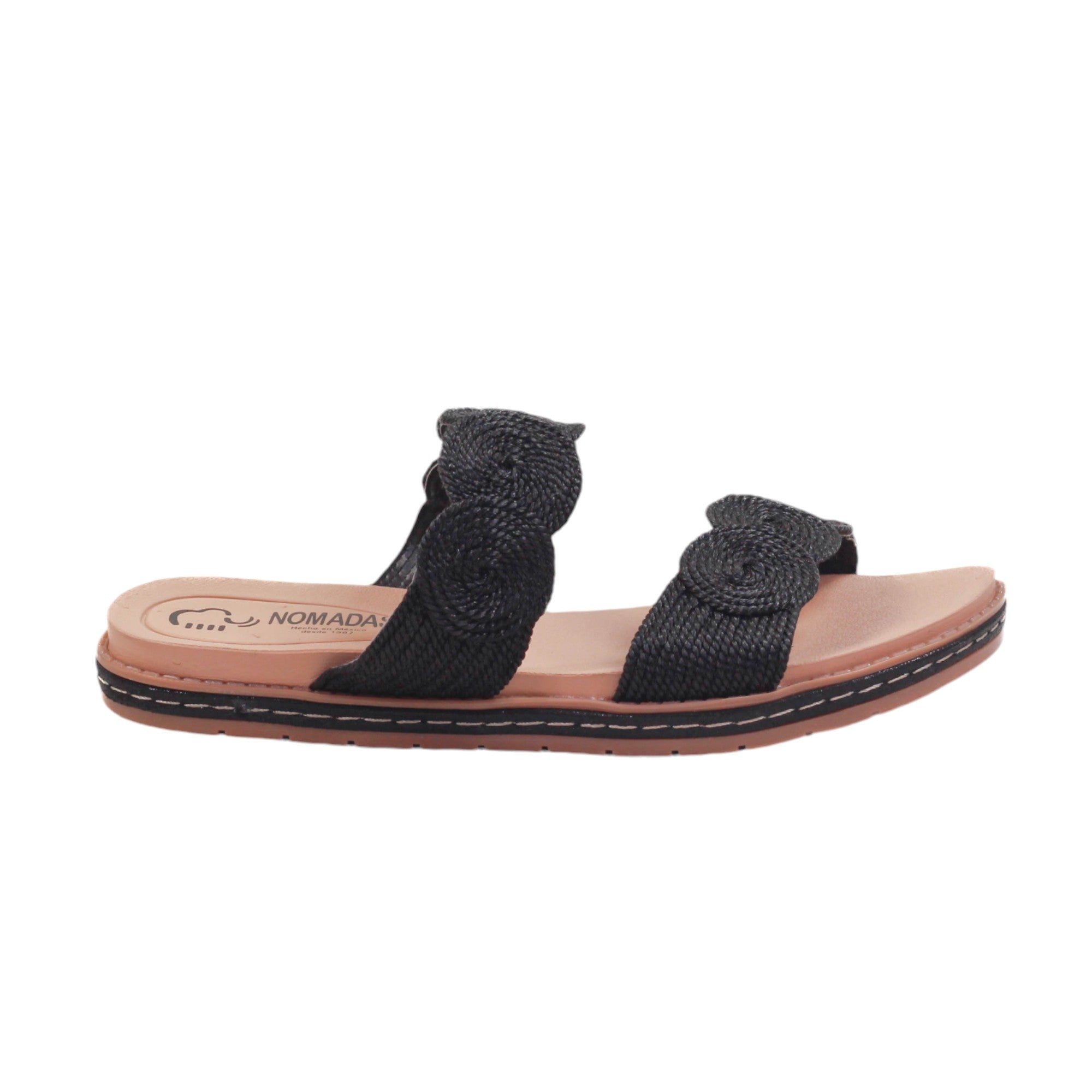 Sandalia para dama marca Nómadas en colores plata, bronce y negro. Es una sandalia de Confort que te proporciona una altura de 2,00 cm con un calce perfecto y te brindará comodidad y estilo en cada paso. Cuenta con un acabado en adornos circulares y una platilla de confort.