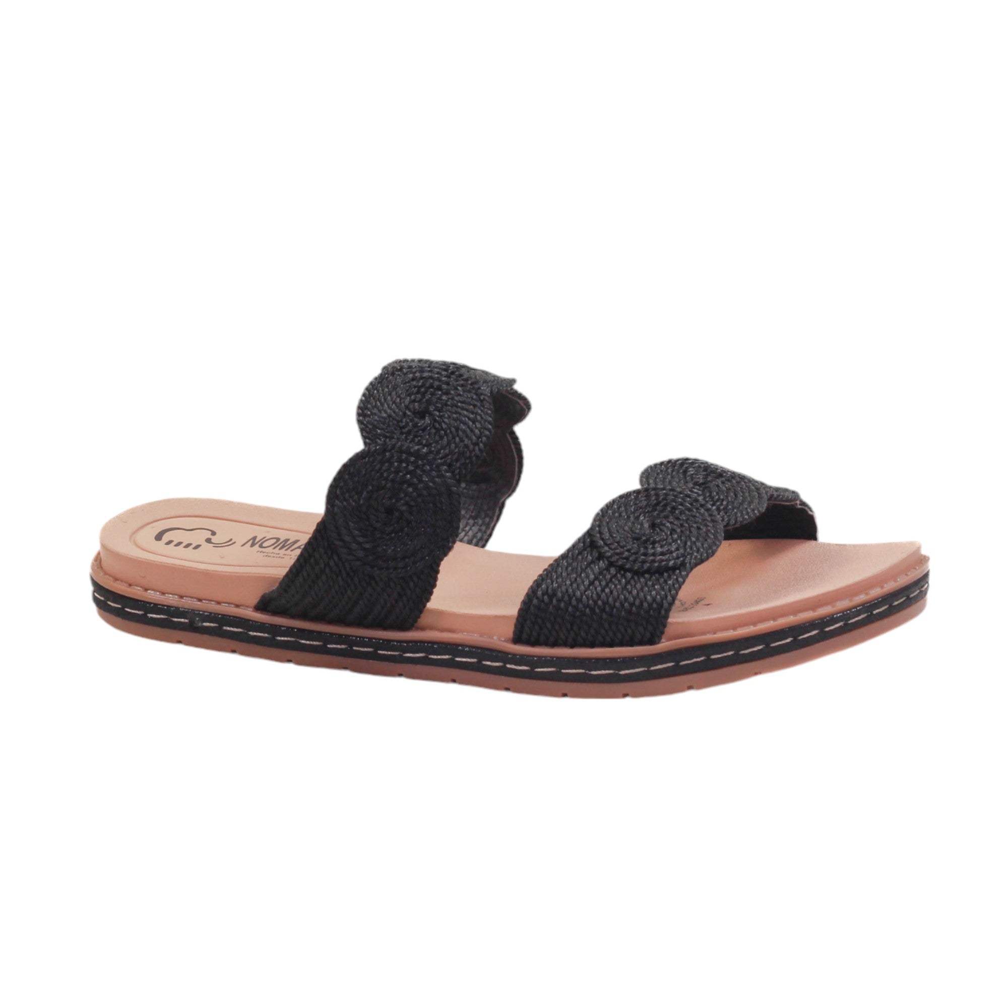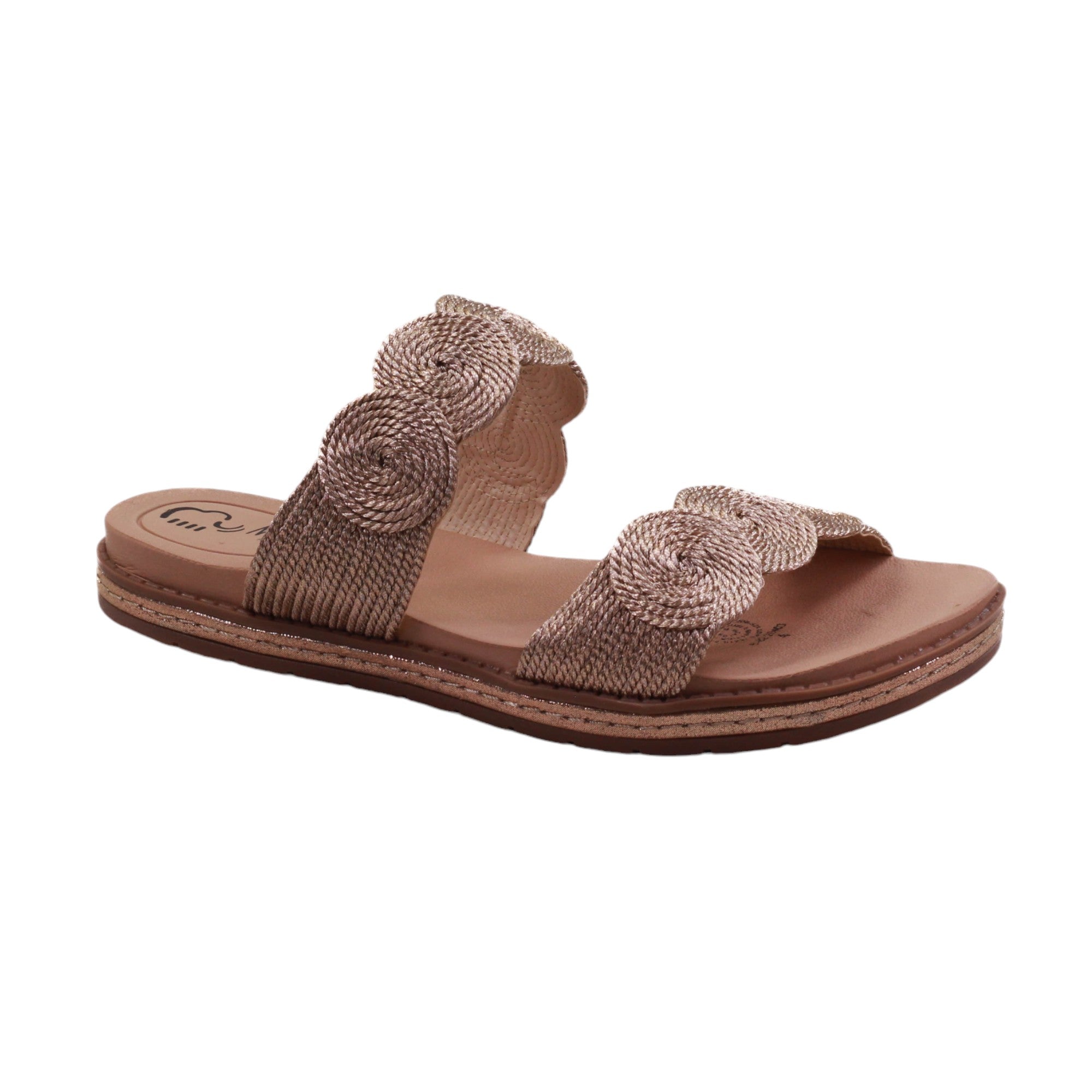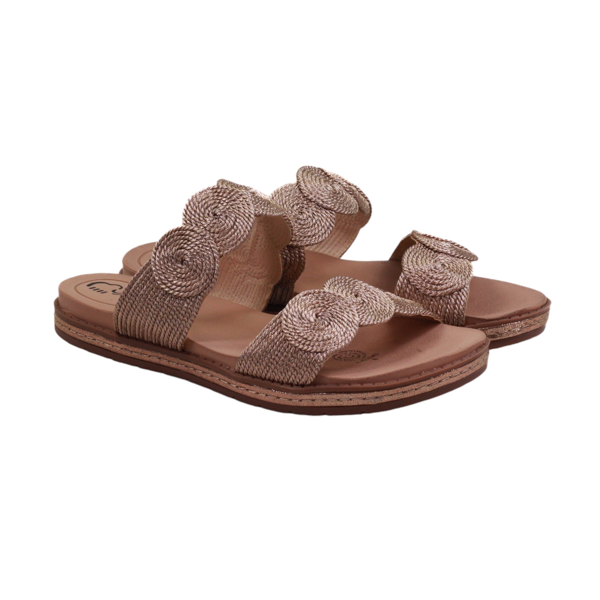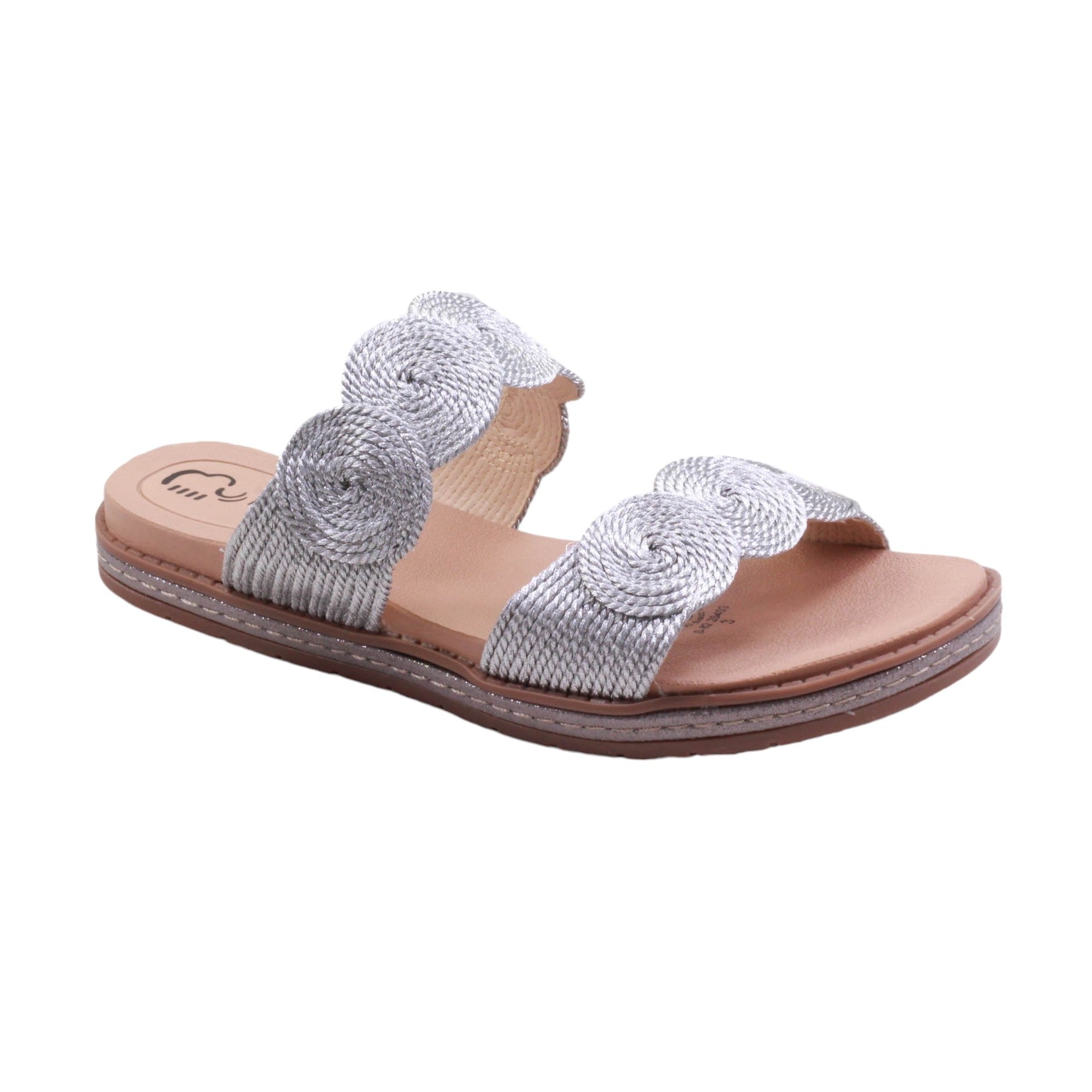 Sandalia para dama marca Nómadas en colores plata, bronce y negro. Es una sandalia de Confort que te proporciona una altura de 2,00 cm con un calce perfecto y te brindará comodidad y estilo en cada paso. Cuenta con un acabado en adornos circulares y una platilla de confort.