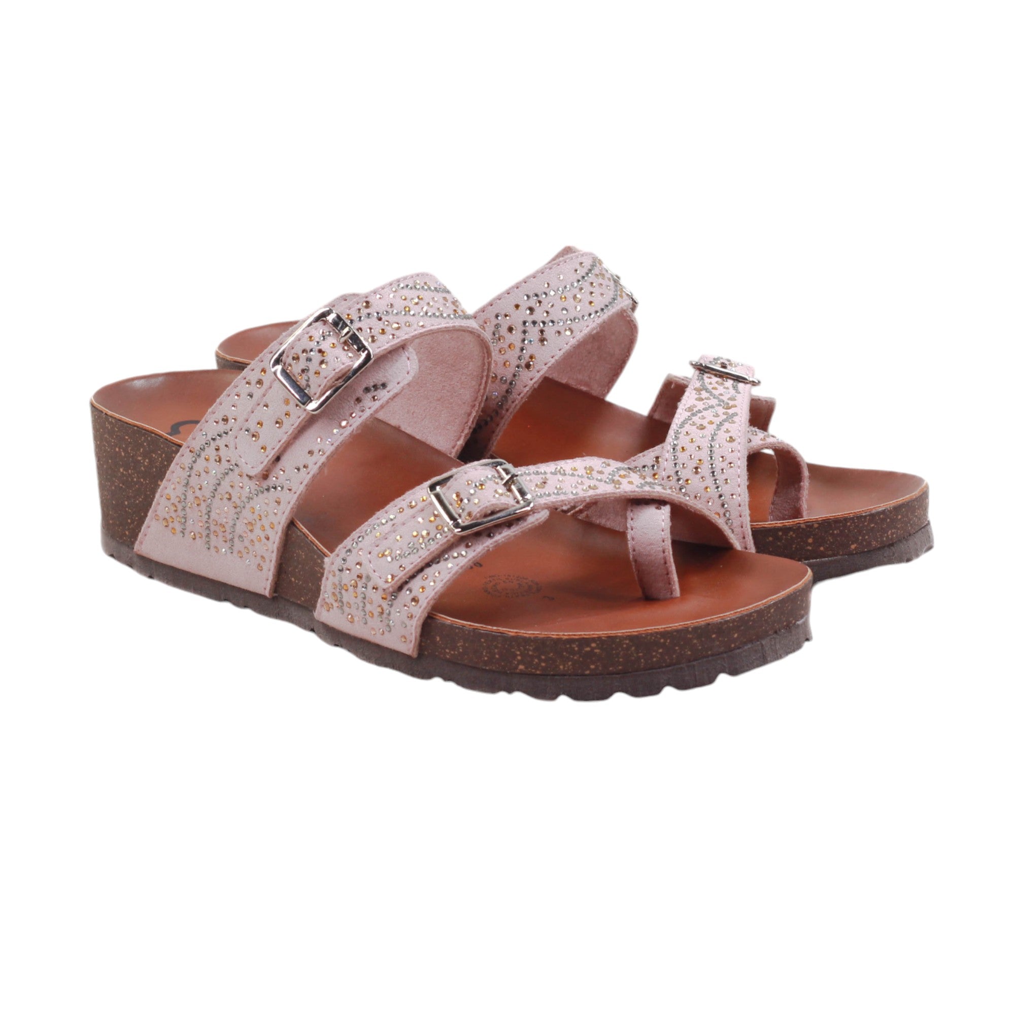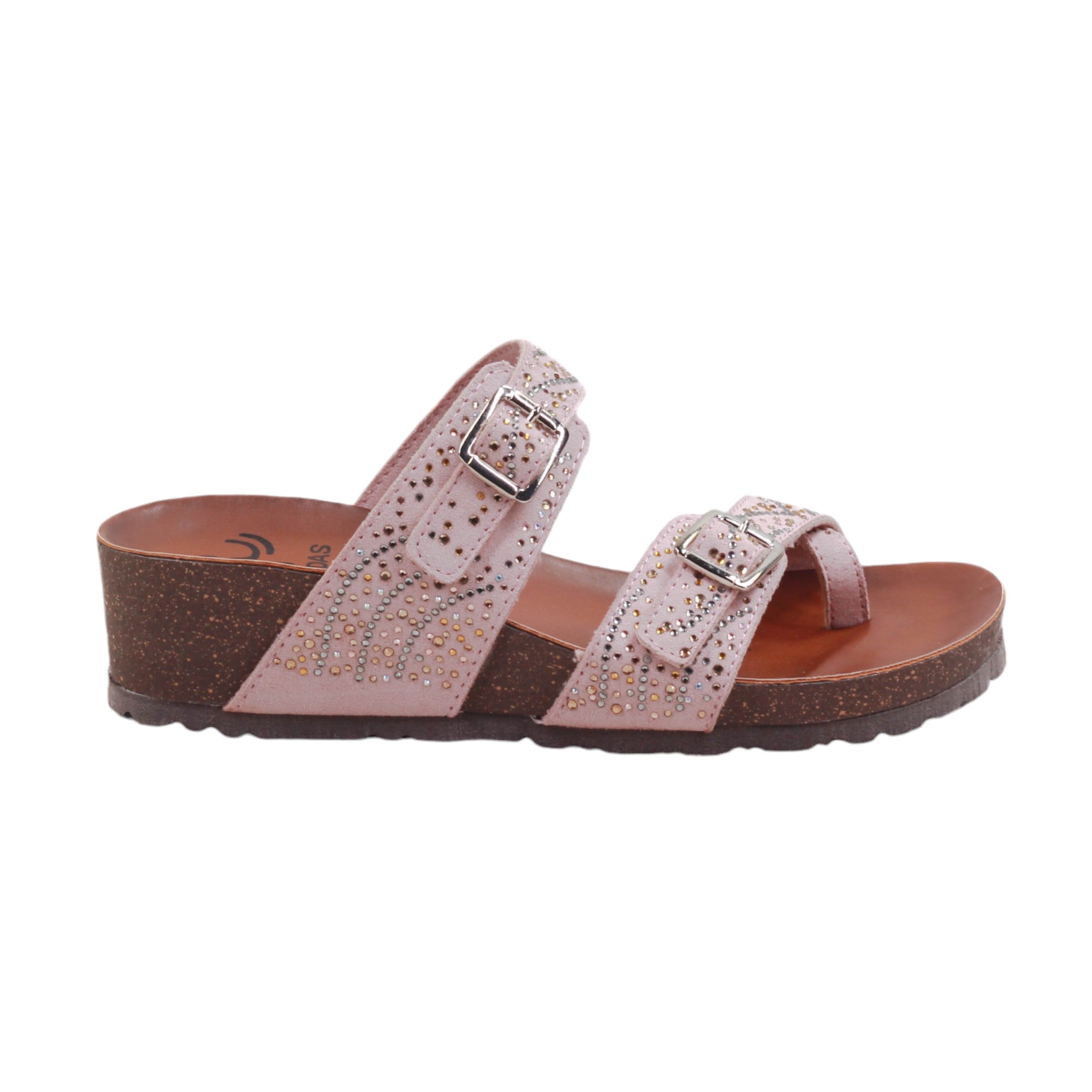 Sandalia para dama con pedrería adherida, doble tira de ajuste con hebilla