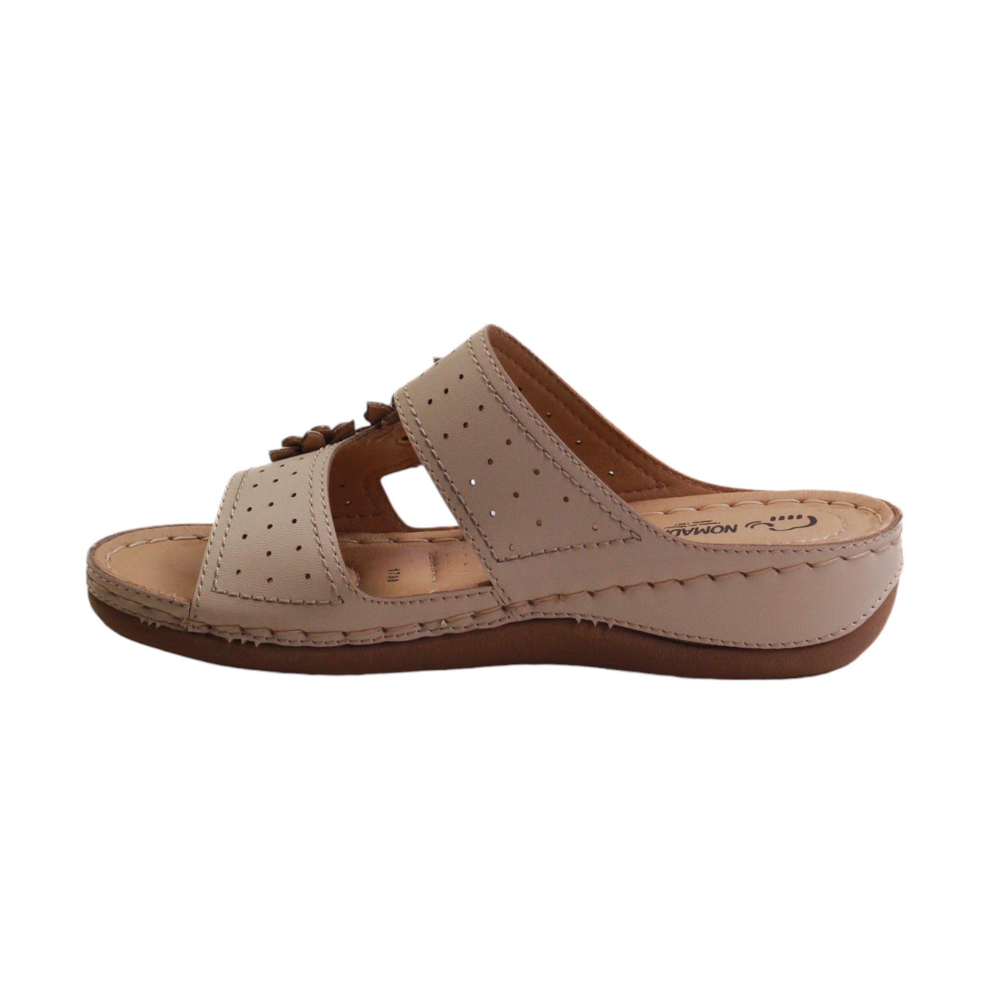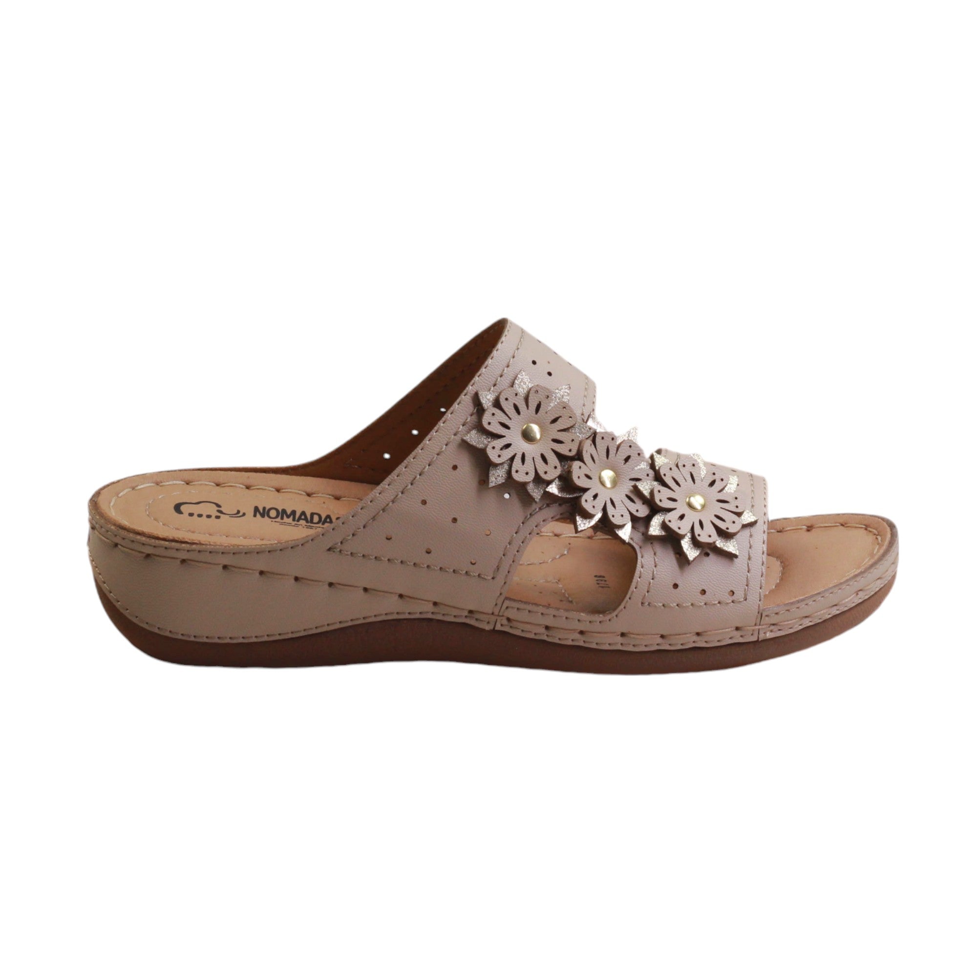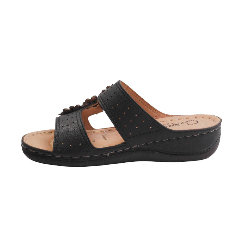 Sandalia para dama marca Nómadas en colores miga y negro. Bonito diseño con flores de adorno, cuenta con plantilla acojinada y ergonómica.
